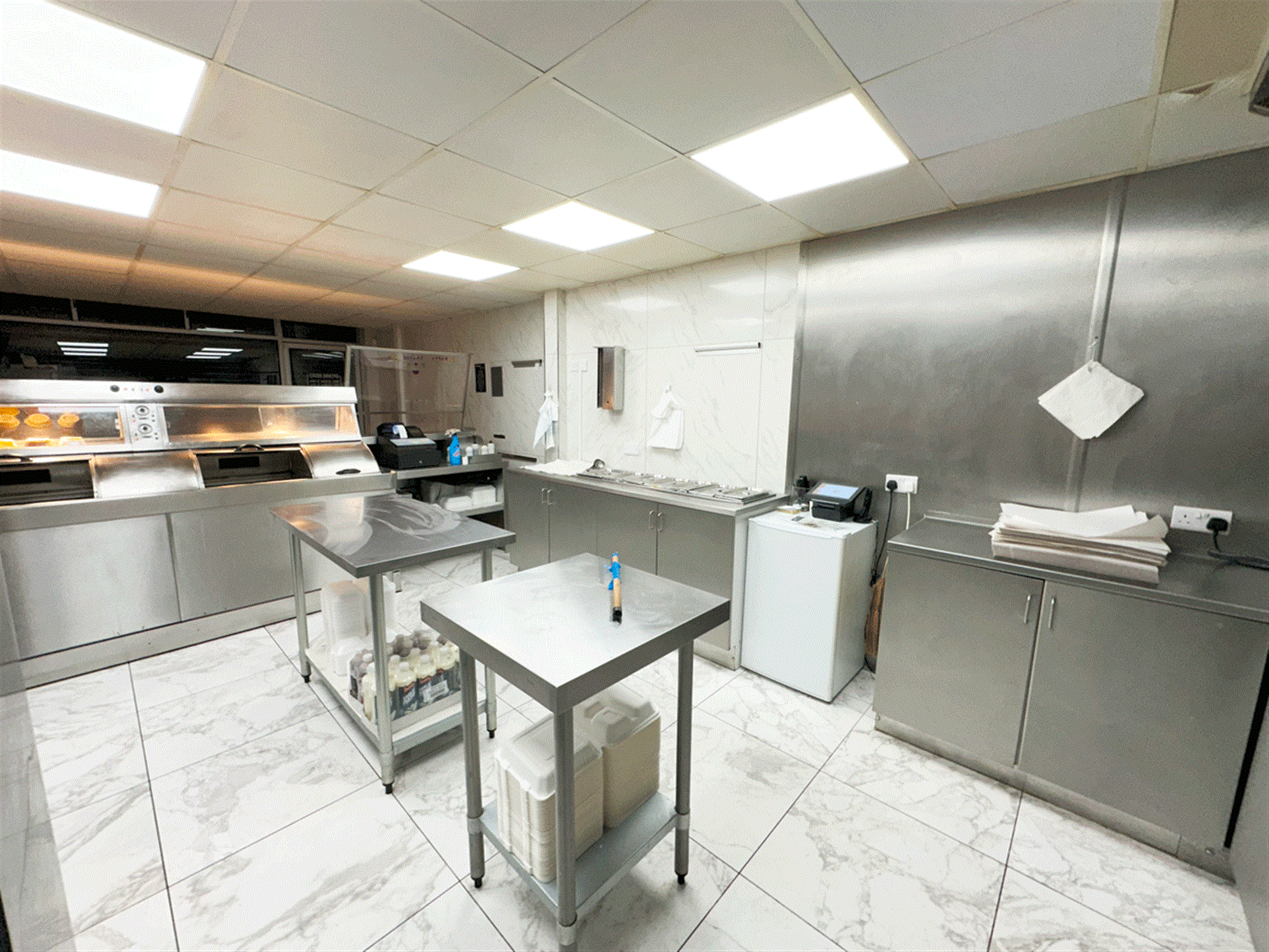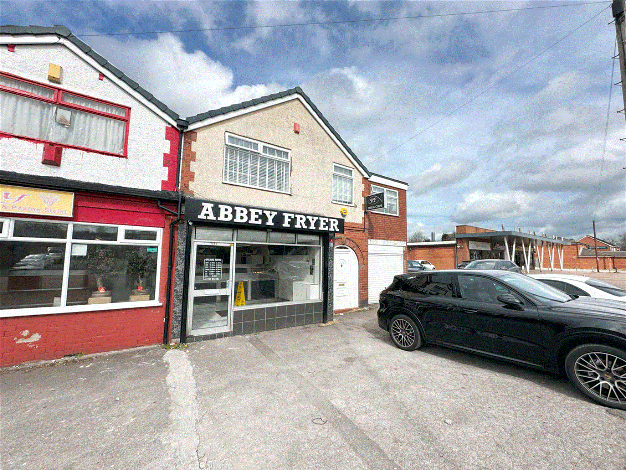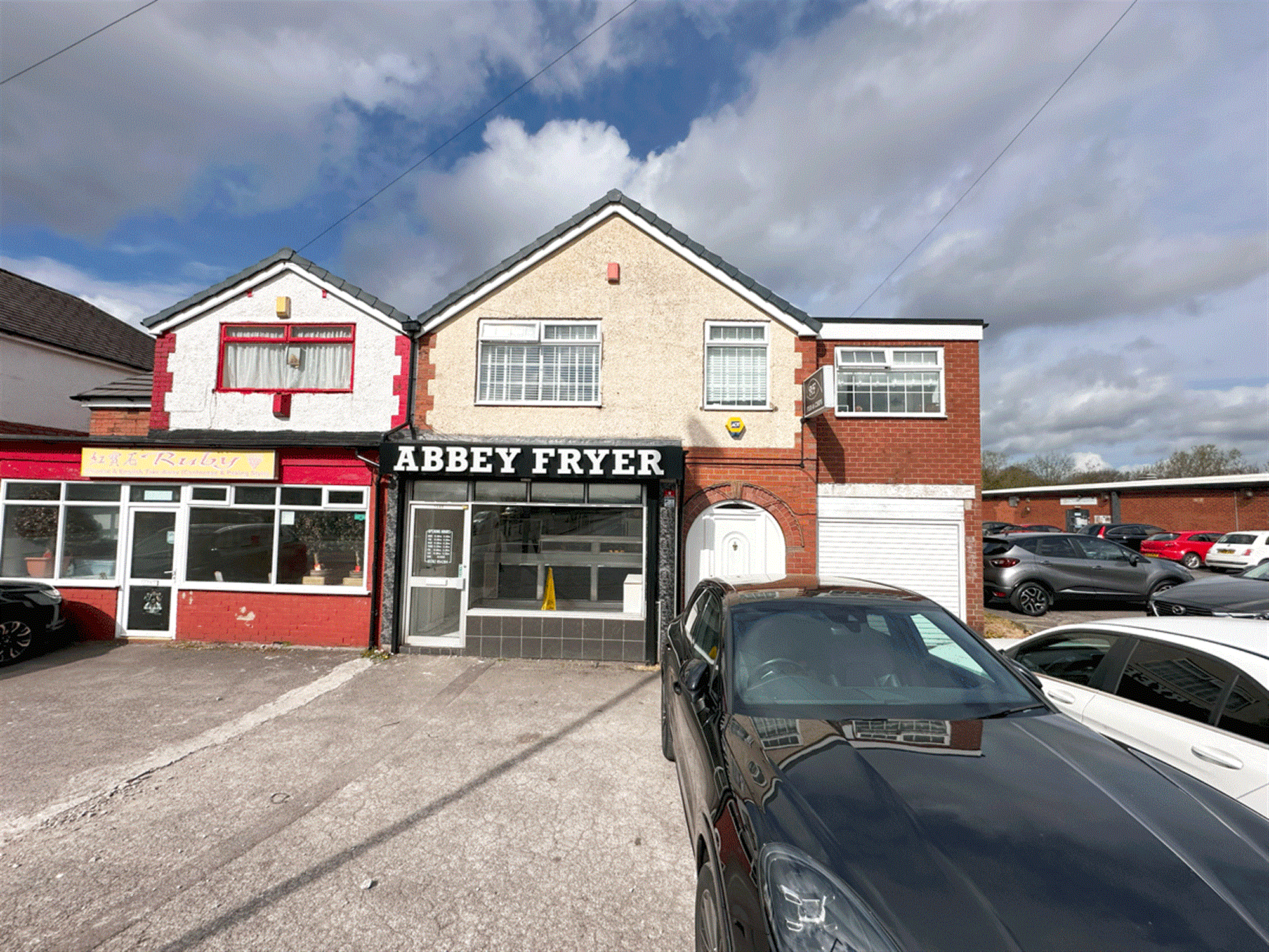 Parking to front for 4 vehicles, electric shuttered front, waiting/ordering area, serve counter with 2 pan, 2 scuttle, 2 display box range, open plan kitchen providing large free-standing bain marie, hot plate, preparation area, kebab area, cold storage, small store cupboard, lounge, chipping room with rumbler and chipper, exit to side providing walled/gated side parking for 4, staff W/C, large garden and garage.