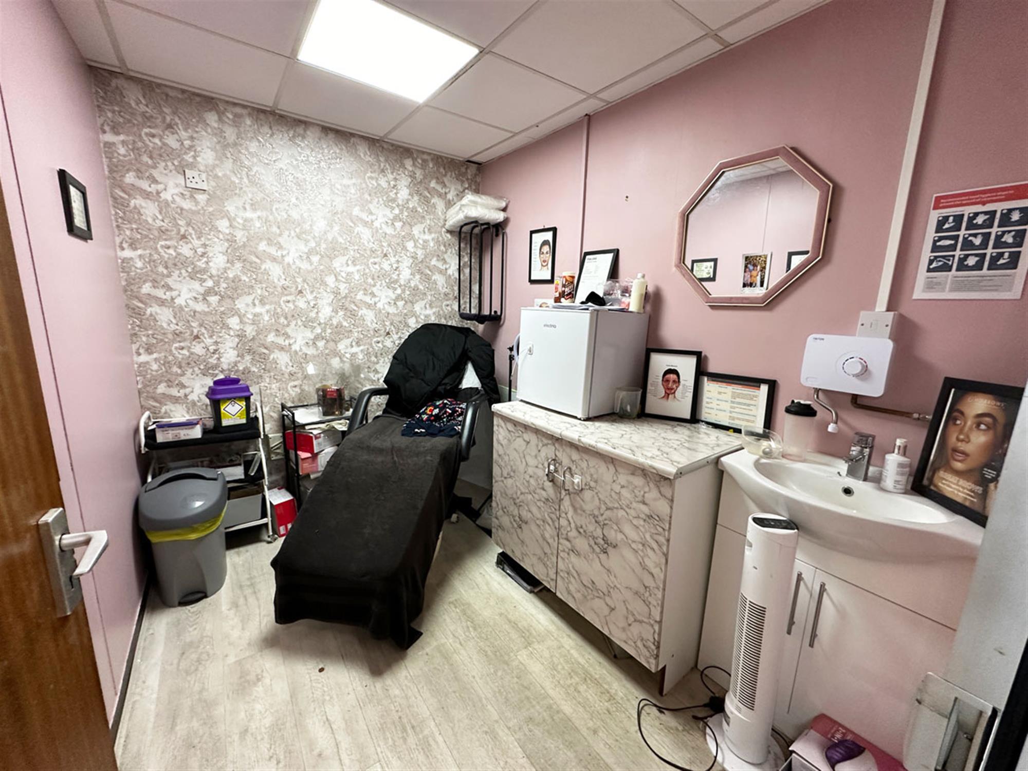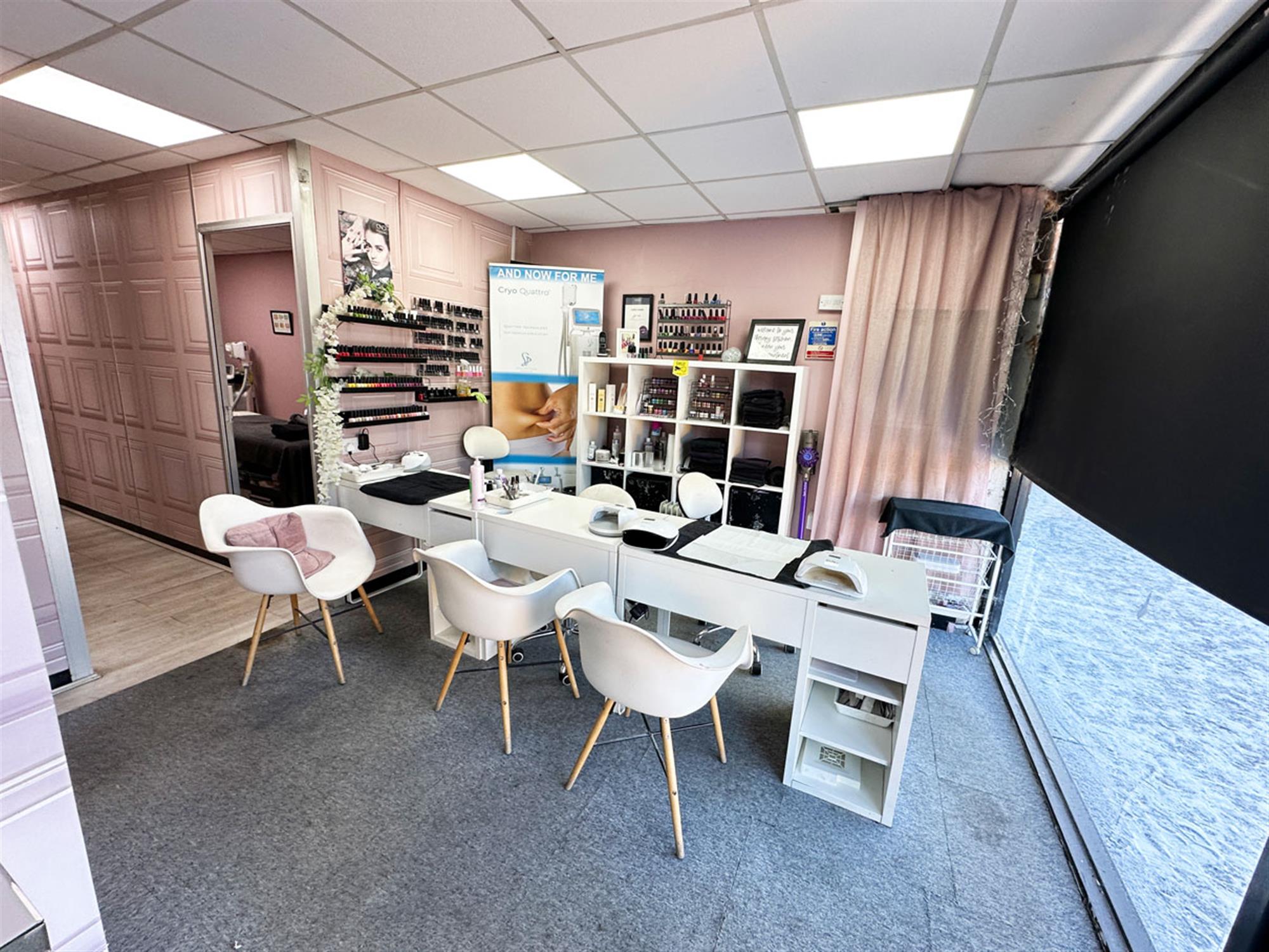 Beauty Salon contains the following: Entrance, waiting area for 2, 3 nail stations, 1 pedicure-room, 3 treatment rooms, spray tan room, WC/shower room, exit to yard and parking.