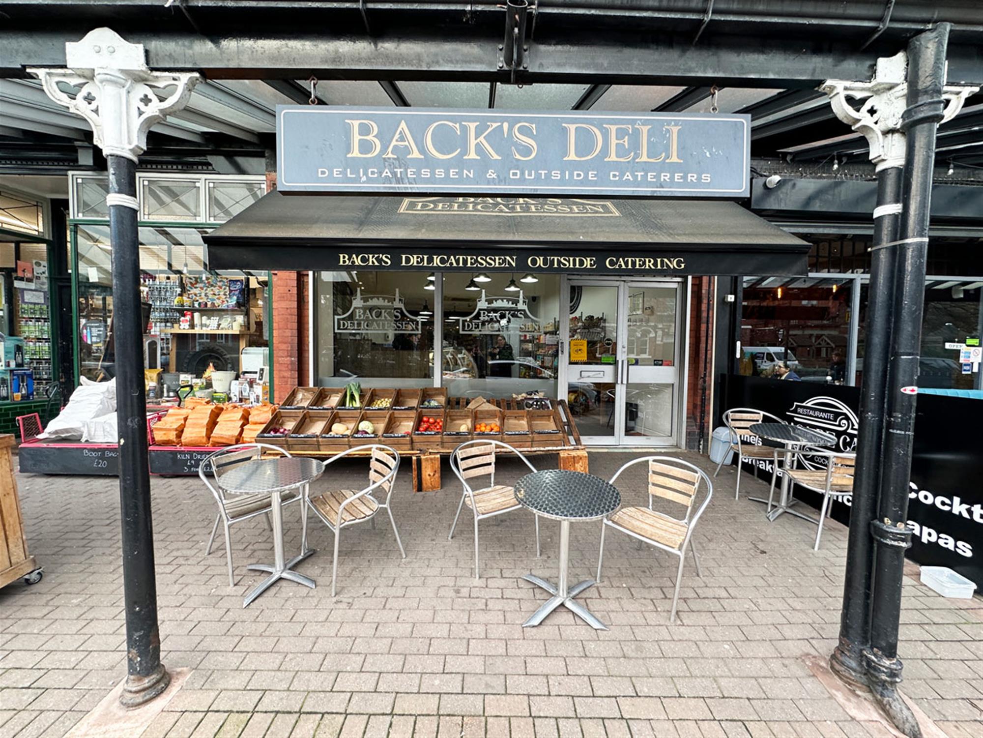 Alfresco seating for 6 with retractable canopy and vegetable display area, shuttered front, entrance, seating for 10, display area, large chilled delicatessen style service counter, hot drinks preparation area, sandwich preparation area, double panini press, till point, 3 display fridges, further display section, alcohol display, rear kitchen providing washing up area, 6 burner oven, convention oven, cold storage, walk-in fridge, exit to rear alley and bin area.