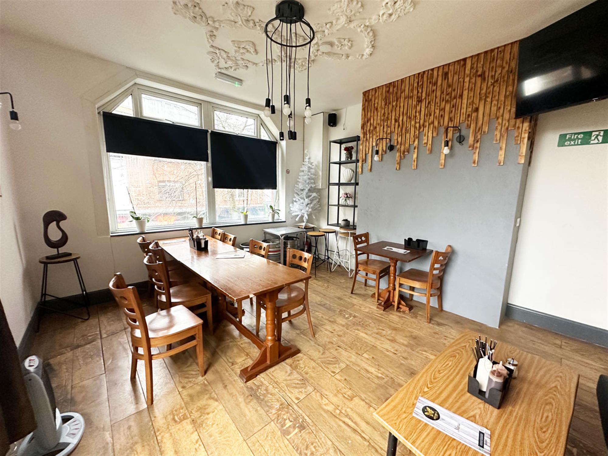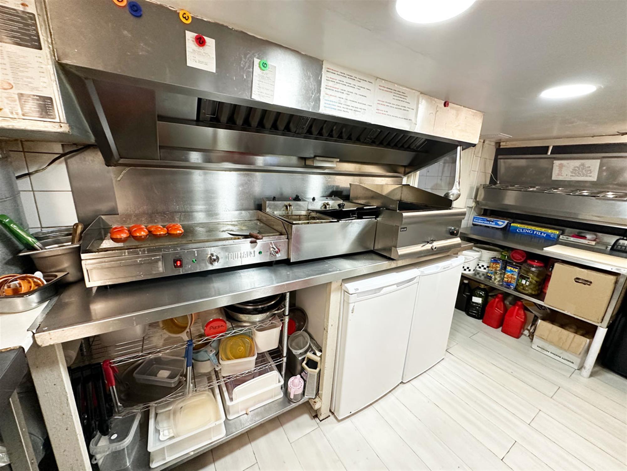 Electric canopy, seating for 20, large bar, hot drinks preparation area, stairs leading to 1st floor private seating for 20, W/C, stairs leading down to lower ground floor from kitchen with preparation area, washing up area, cold storage, large hot plate, large charcoal grill and stove oven.