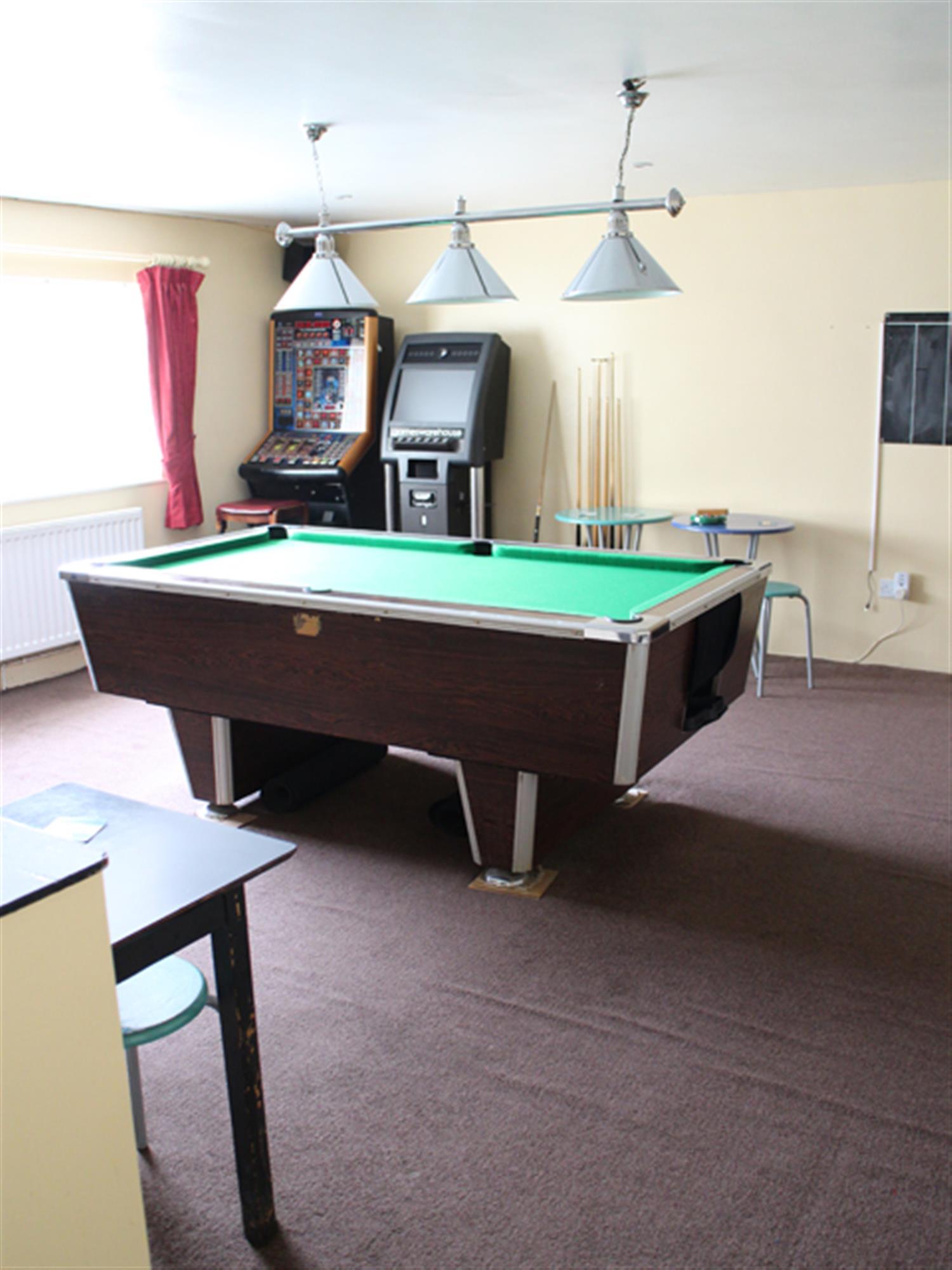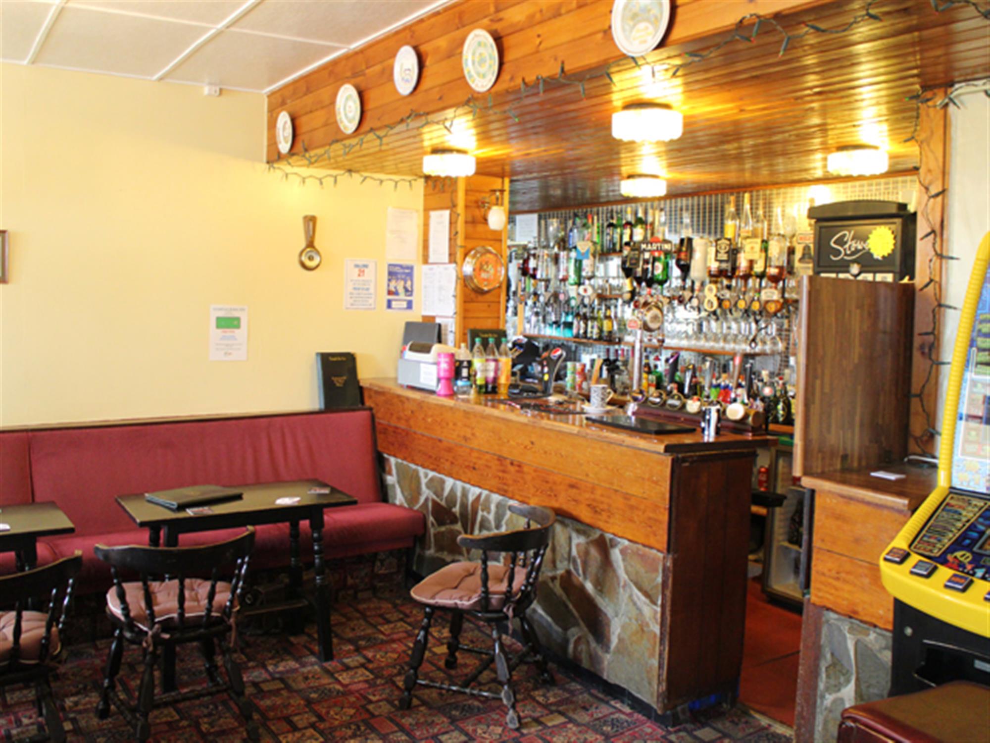 Two-section PUBLIC BAR with partially exposed beam effect ceiling, carpeted floor and part stone clad walls. Central chimney having feature fireplace with ‘double aspect’ wood burner. Main seating/drinking area with L-shaped wood panel fronted bar counter to the interconnecting servery. Pub style seating for approximately 20. GAMES AREA having carpeted floor, pool table, AWP and gaming machines and darts area. LADIES’ & GENTLEMEN’S TOILETS.