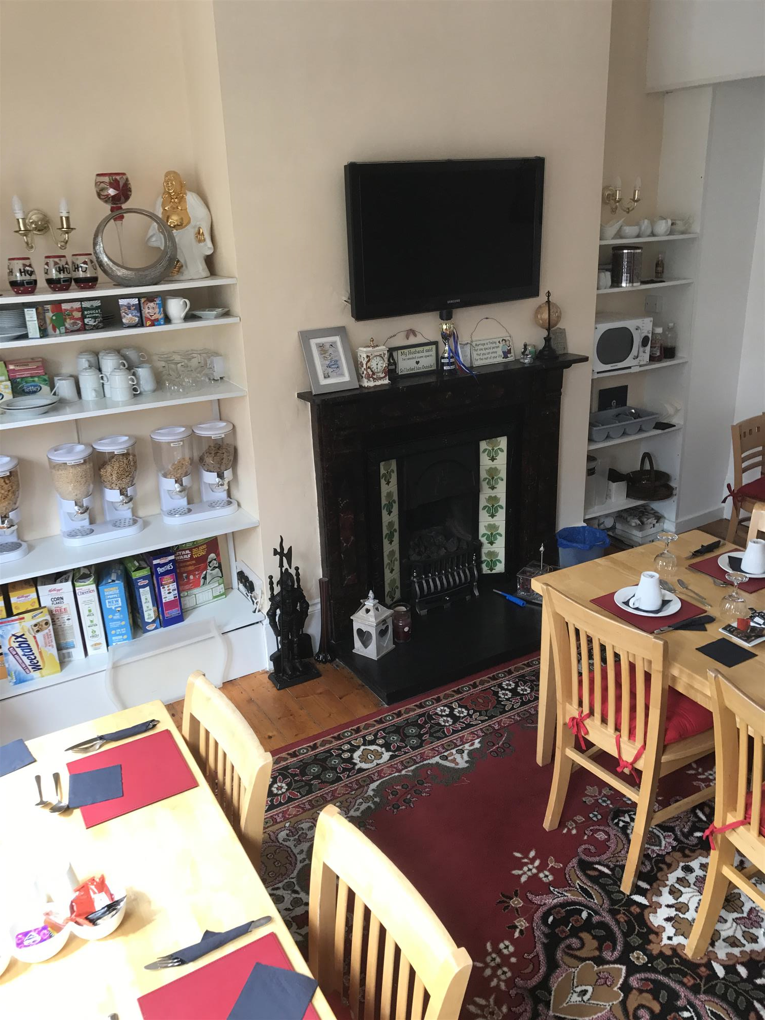 The reception hallway, in turn, affords easy level access through to an elegant residents’ breakfast/dining and TV room with feature original fireplace, solid timber flooring, wall-mounted TV screen and attractive loose furnishings, which is served by a fully fitted and equipped working kitchen/private breakfast room.
