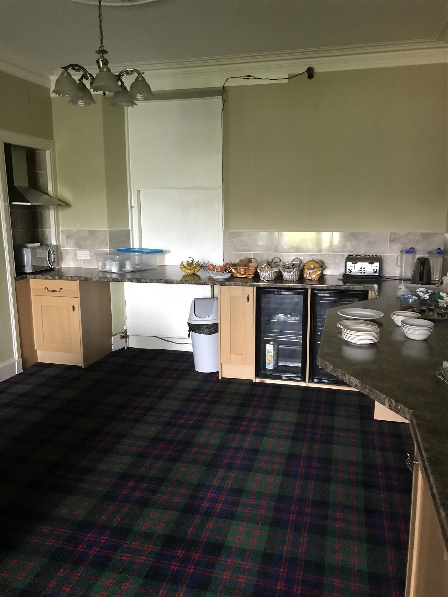 The reception hallway, in turn, affords easy level access through to superbly presented and appointed communal and ancillary areas, which consist of a charming residents’ lounge with stylish upholstered furnishings and inset spotlighting and an elegant residents’ dining room with feature front-aspect bay window, well maintained tartan-effect carpet, feature original fireplace, wall- mounted TV screen, stylish loose furnishings and full complement of ambient and refrigerated food display, storage and service facilities.