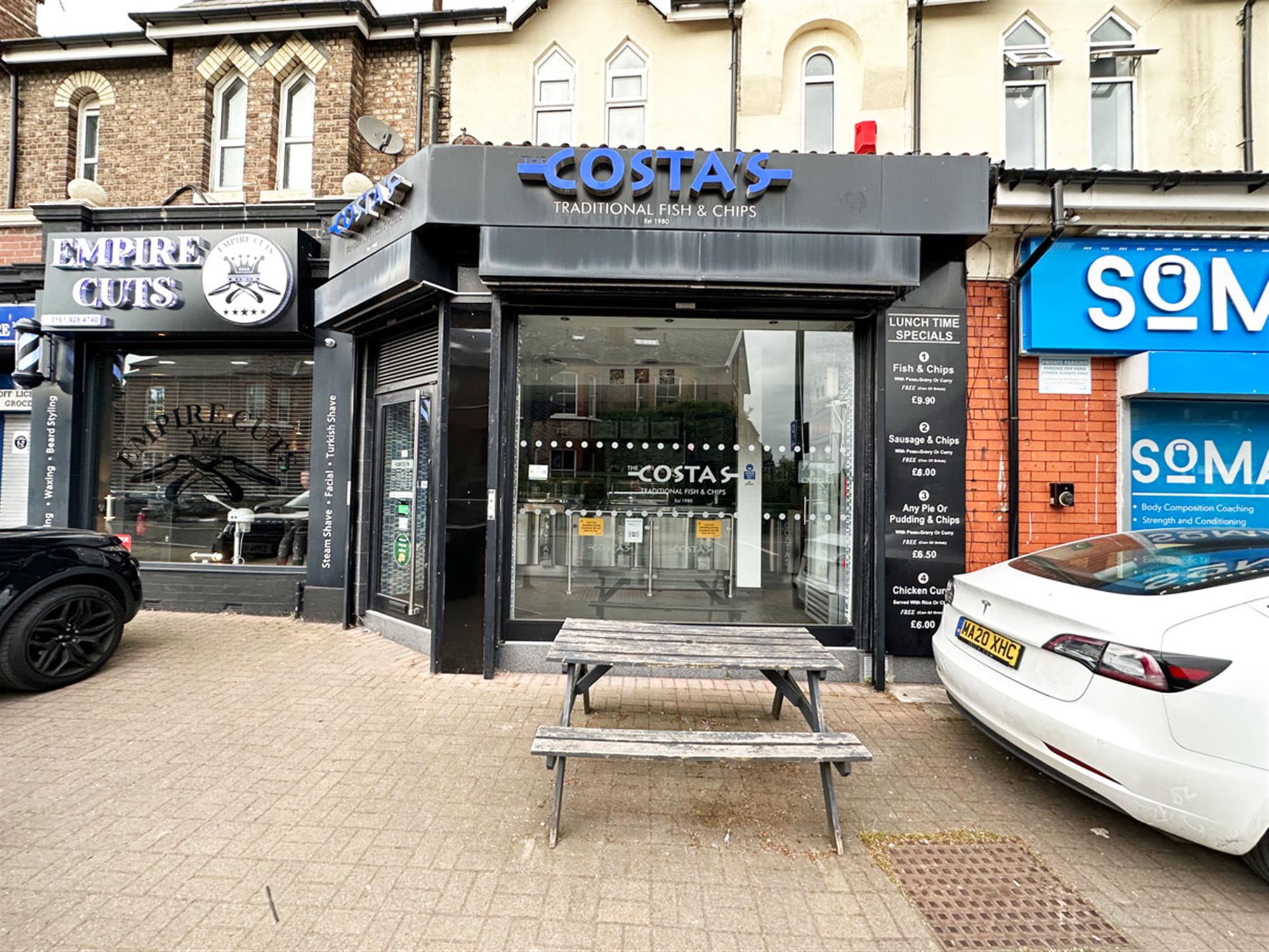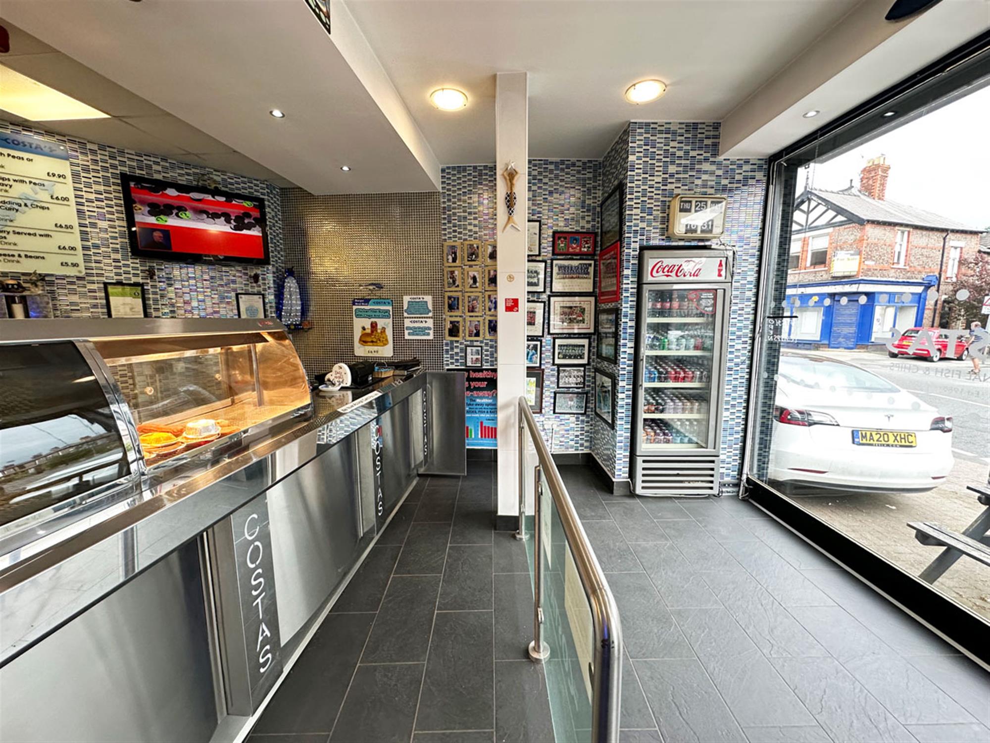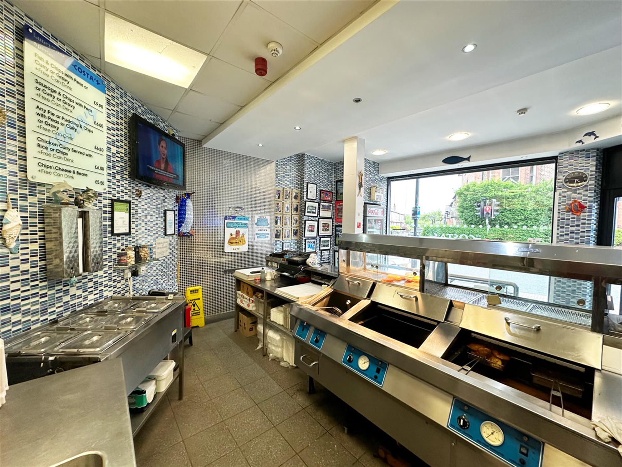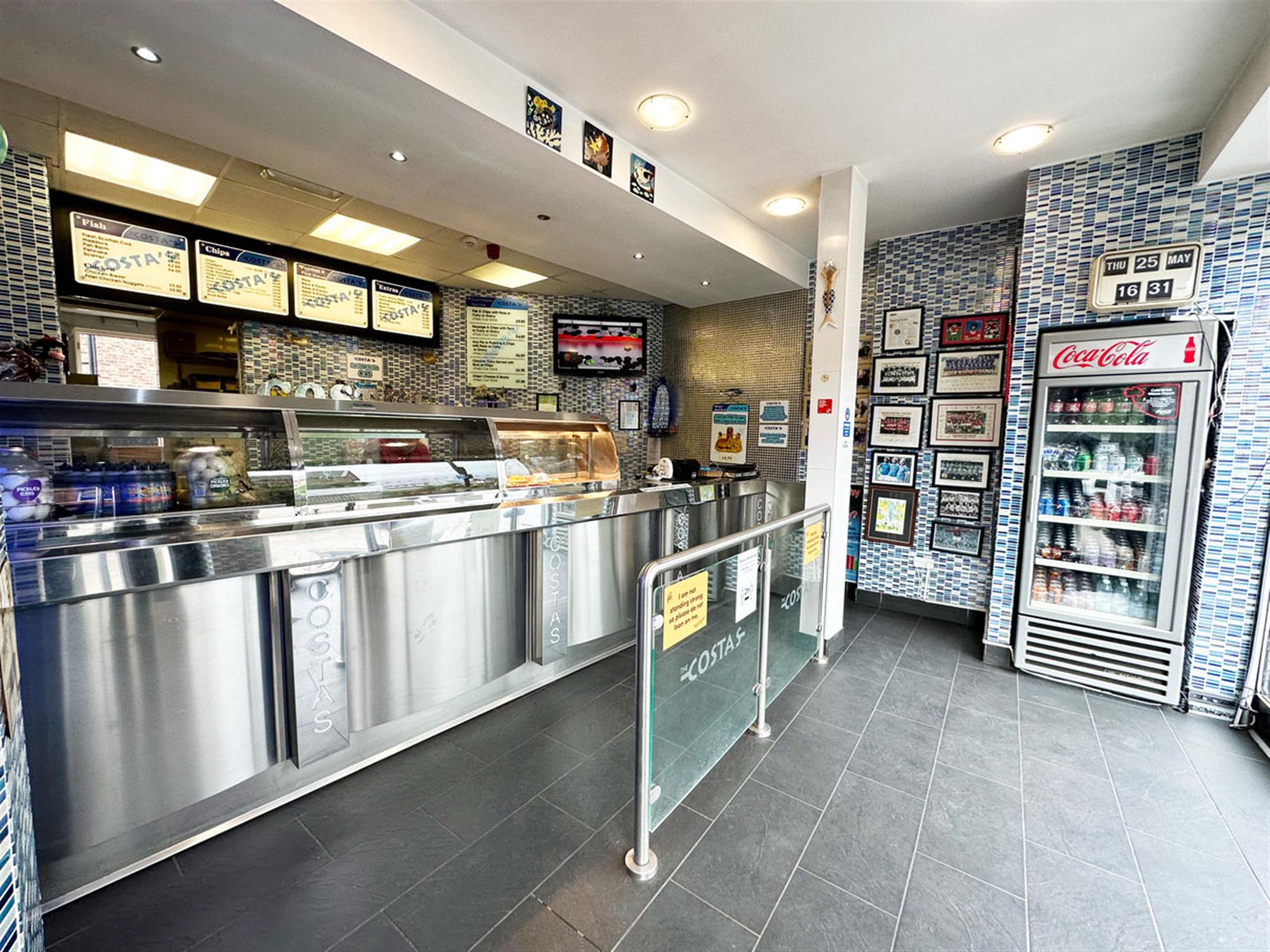 Al fresco seating for 6, Electric shuttered, entrance, well-appointed shop providing good sized waiting/ordering area, drinks display unit, service counter with 3 pan 2 scuttle 3 display box range, free standing 6 pot bain marie, rear kitchen providing fish fridge, cold storage, 6 burner oven, preparation area, washing up area, rear chipping room with rumbler, chipper, potato store area, staff WC, exit to good sized yard & bin area. Trapdoor leading down to basement providing good sized dry storage.