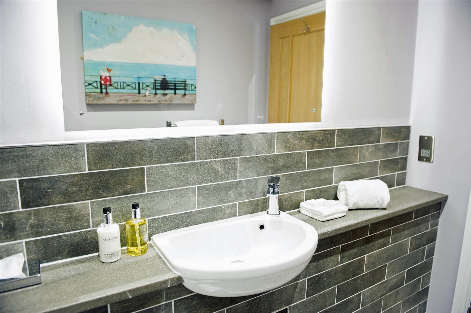 APARTMENT ONE – Private access stairwell leading to first floor. HALLWAY with separate BATHROOM, vinyl flooring, walk-in shower cubicle, basin, toilet. Open plan LOUNGE/KITCHEN with laminate floors, sofa, TV, exposed brickwork and open chimney breast. Fitted kitchen units with integrated appliances. Double BEDROOM with carpeted floors, TV, exposed brickwork to wall fitted wardrobe and desk.