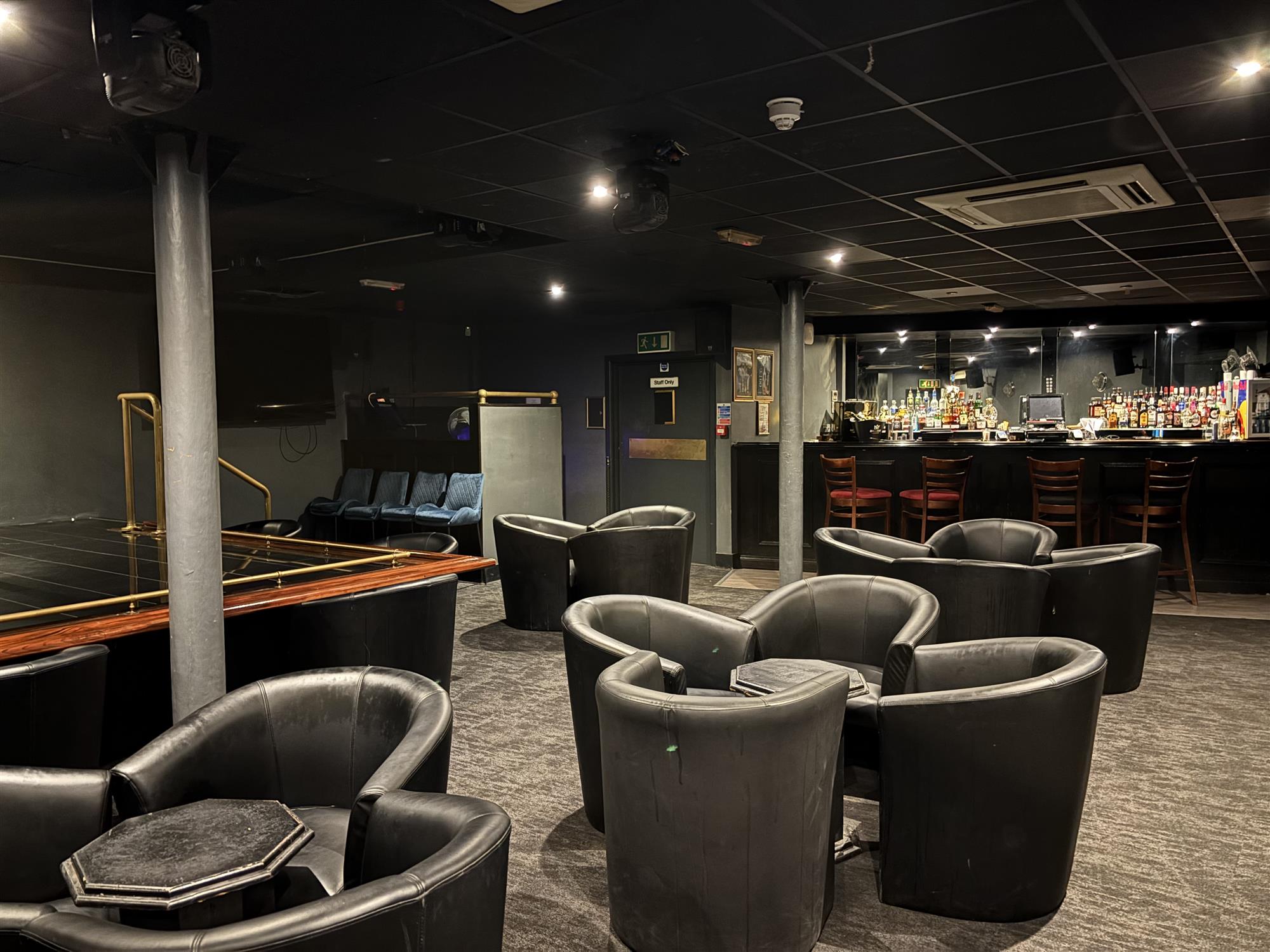 MAIN BAR, having fitted carpets, spotlight fittings, a performing stage, a VIP AREA, a DJ booth and a polished wood topped bar servery with mirrored back bar display. Leather sofas and tub chairs to seat up to 50 customers. Behind the bar servery is a BOTTLE STORE and STORAGE CUPBOARD. Staircase to second floor.