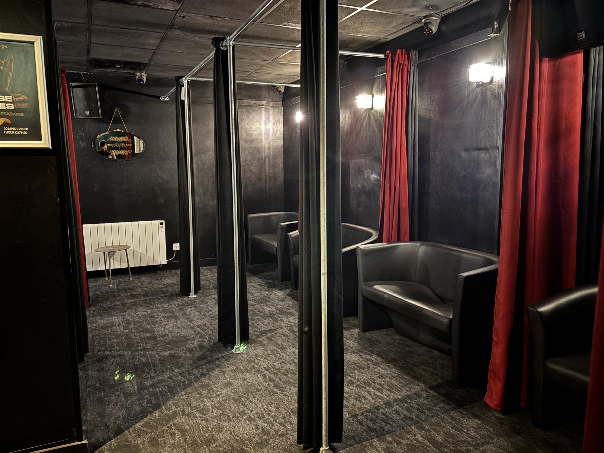 VIP RECEPTION AREA with reception counter. Neighbouring the reception are eight single DANCE BOOTHS with dark curtains for privacy. There are also four VIP ROOMS, all of which seat a handful of customers, although one is slightly larger than the others. All rooms presented in a similar manner with dark carpets, drawn curtains and Chesterfield style sofas. Ladies’ and Gentlemen’s CUSTOMER TOILETS. CLEANING CUPBOARD. Staircase to the third floor.