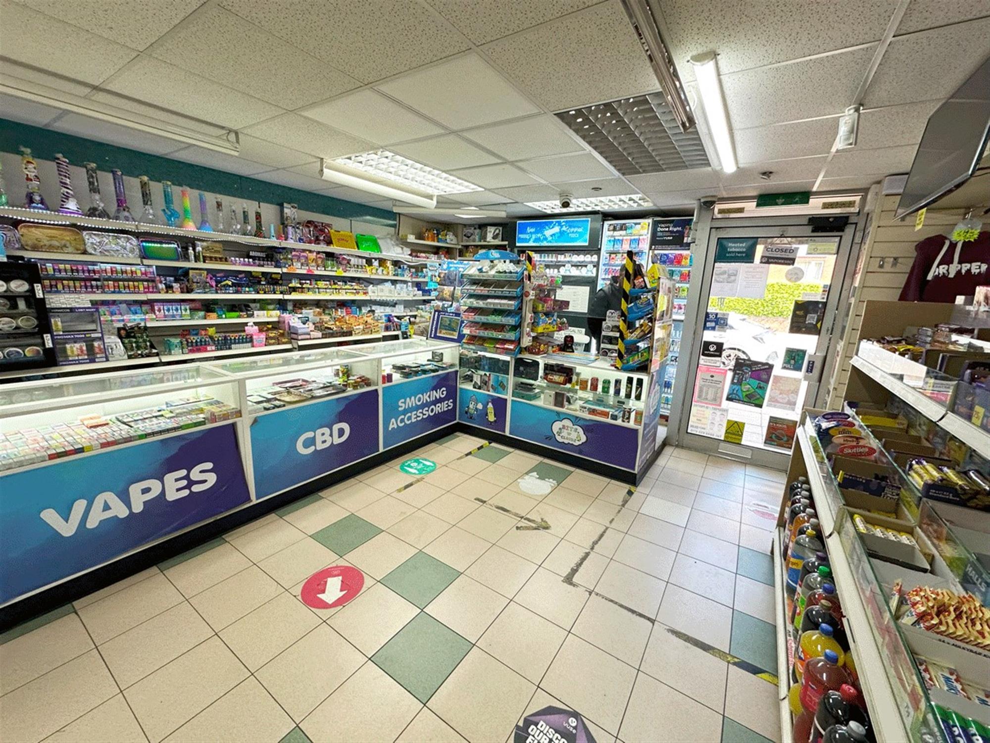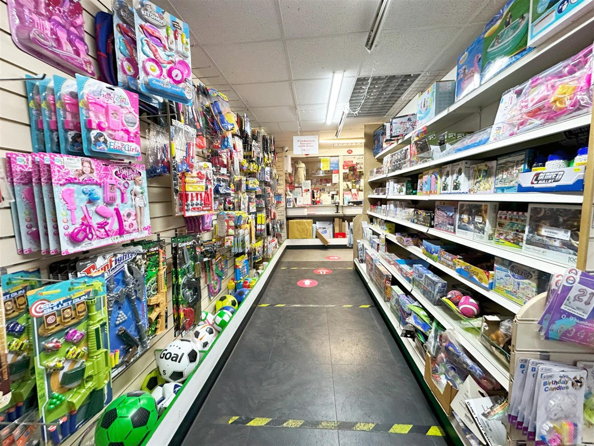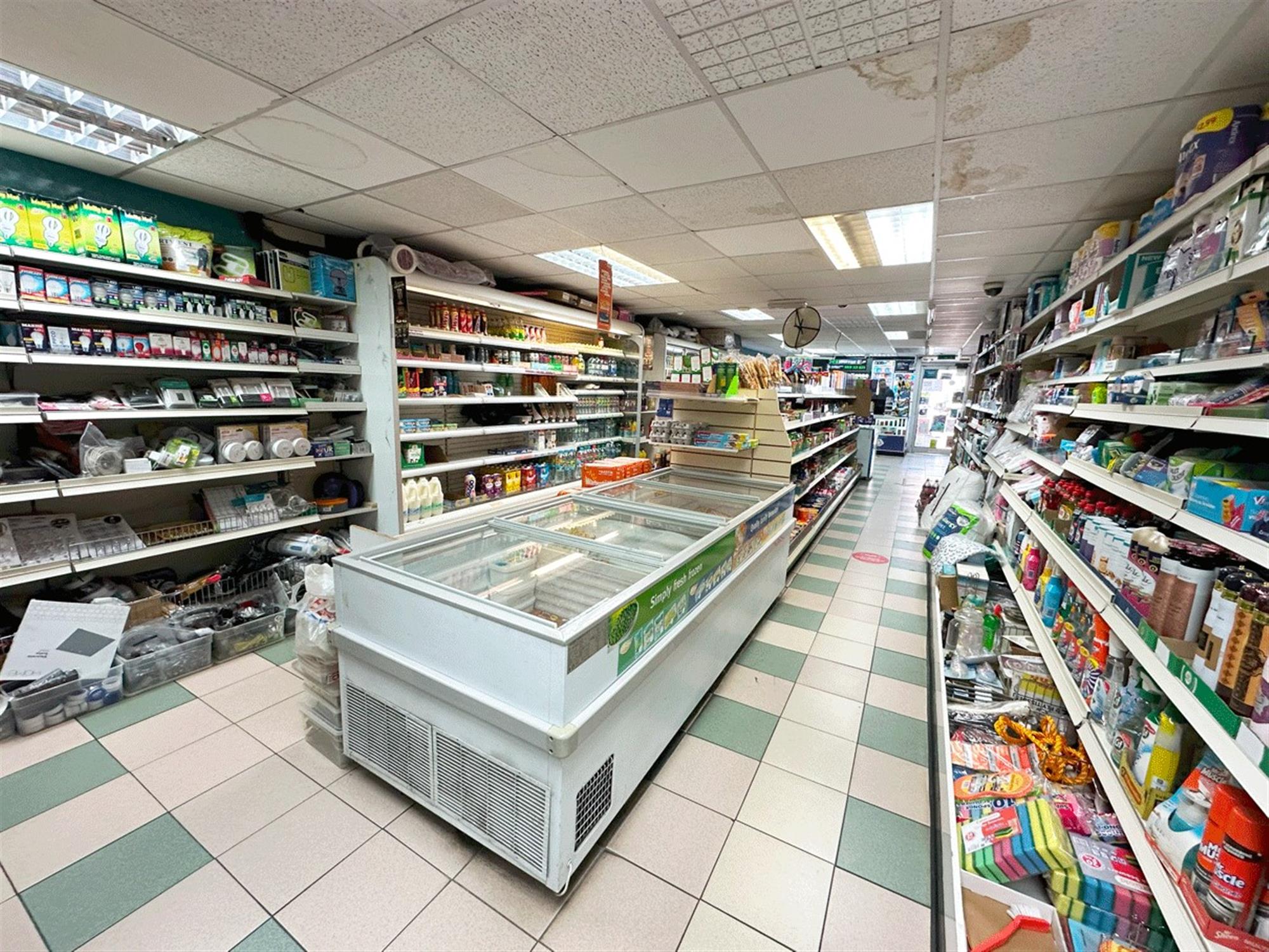 Double fitted unit with central entrance, large 'L' shaped service counter, card & gift display area, confectionary display, large central display aisle, freezer section, 2 large display chillers, DIY display area, stationary display and small rear storeroom.