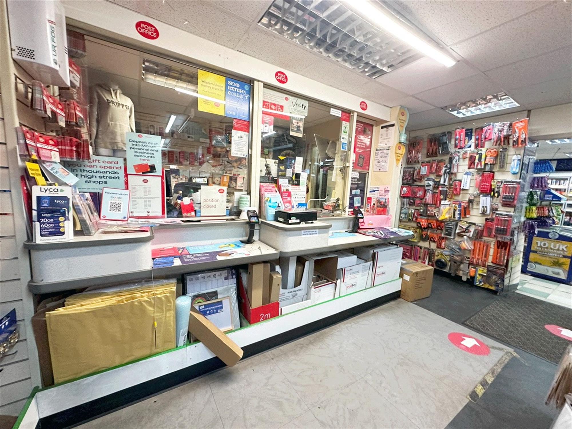 Post office with 2 service points, small storeroom & W/C, small staff kitchen, storeroom, rear office/staff room, staff W/C, and exit to shared yard.