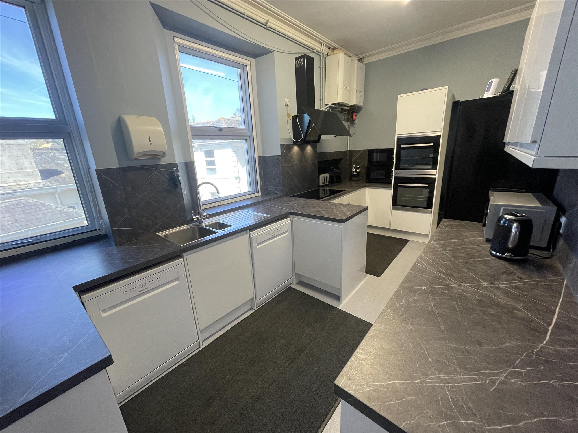 The spacious owners accommodation is across the Lower ground floor and briefly comprises master bedroom with stunning en-suite and side facing sun room, large lounge with a raised seating area and storage room along with office, dining space, utility room and wet room off. The owners accommodation has direct access out to a wrap around patio garden with private access to the front parking area, and the owners parking bays to the rear- complete with EV charger.