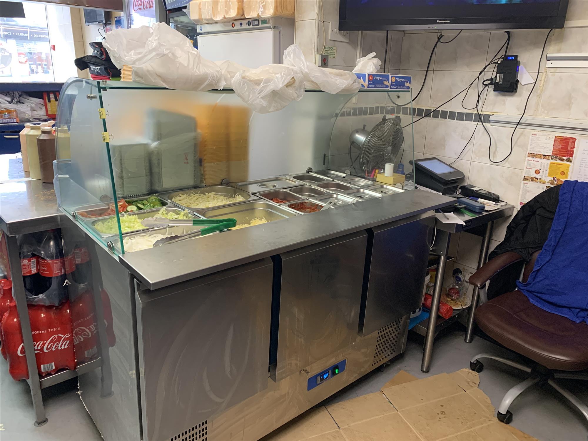 The main kitchen houses a full range of modern and well maintained, industry standard stainless-steel appliances including commercial pizza oven, stainless-steel salad bar and pizza topping preparation counter, convection oven, 2 x kebab burners, burger griddle, double deep-fat fryer and heated chip box etc., all of which we understand is to be included in the sale price and further details of which will be made available upon request to any genuine interested parties.