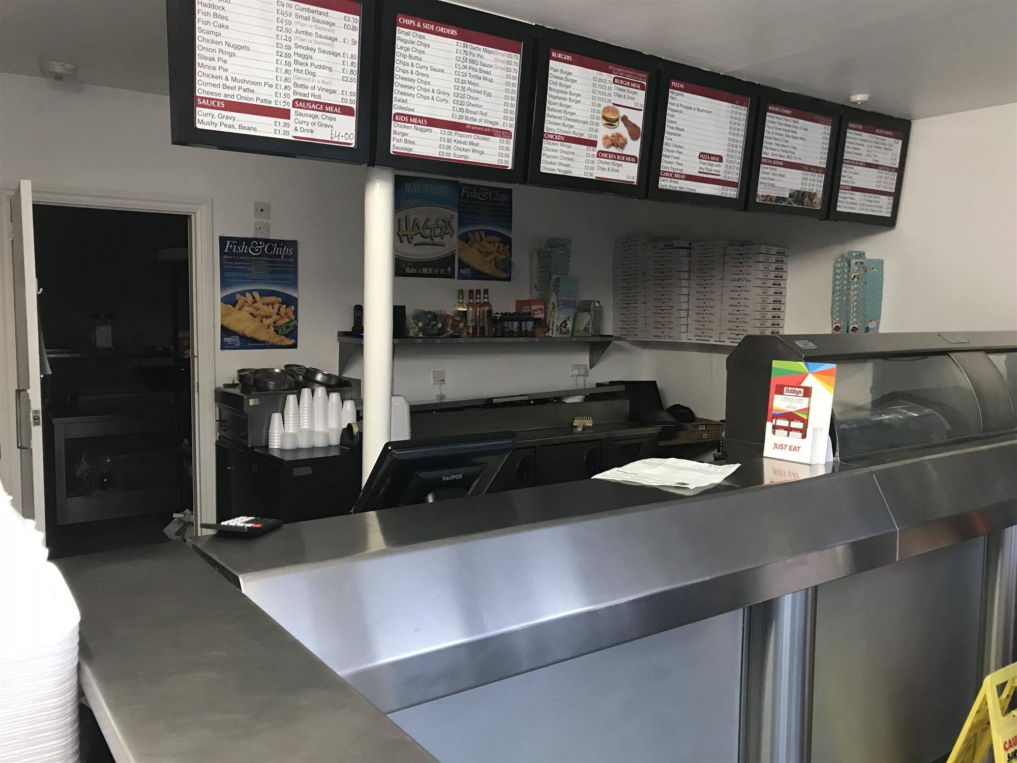 The main public area also features a fully equipped open wrapping and food preparation area with 2-pot bain marie and easy access through to the main, fully fitted and extensively equipped commercial kitchen with extraction system and stainless-steel clad walls for easy cleaning.