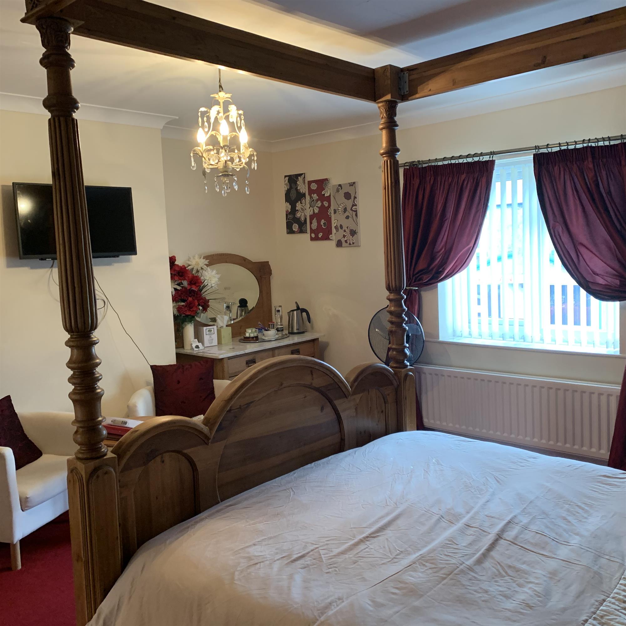 A double room with impressive king-size 4-poster bed and fully fitted private en-suite bath/shower room