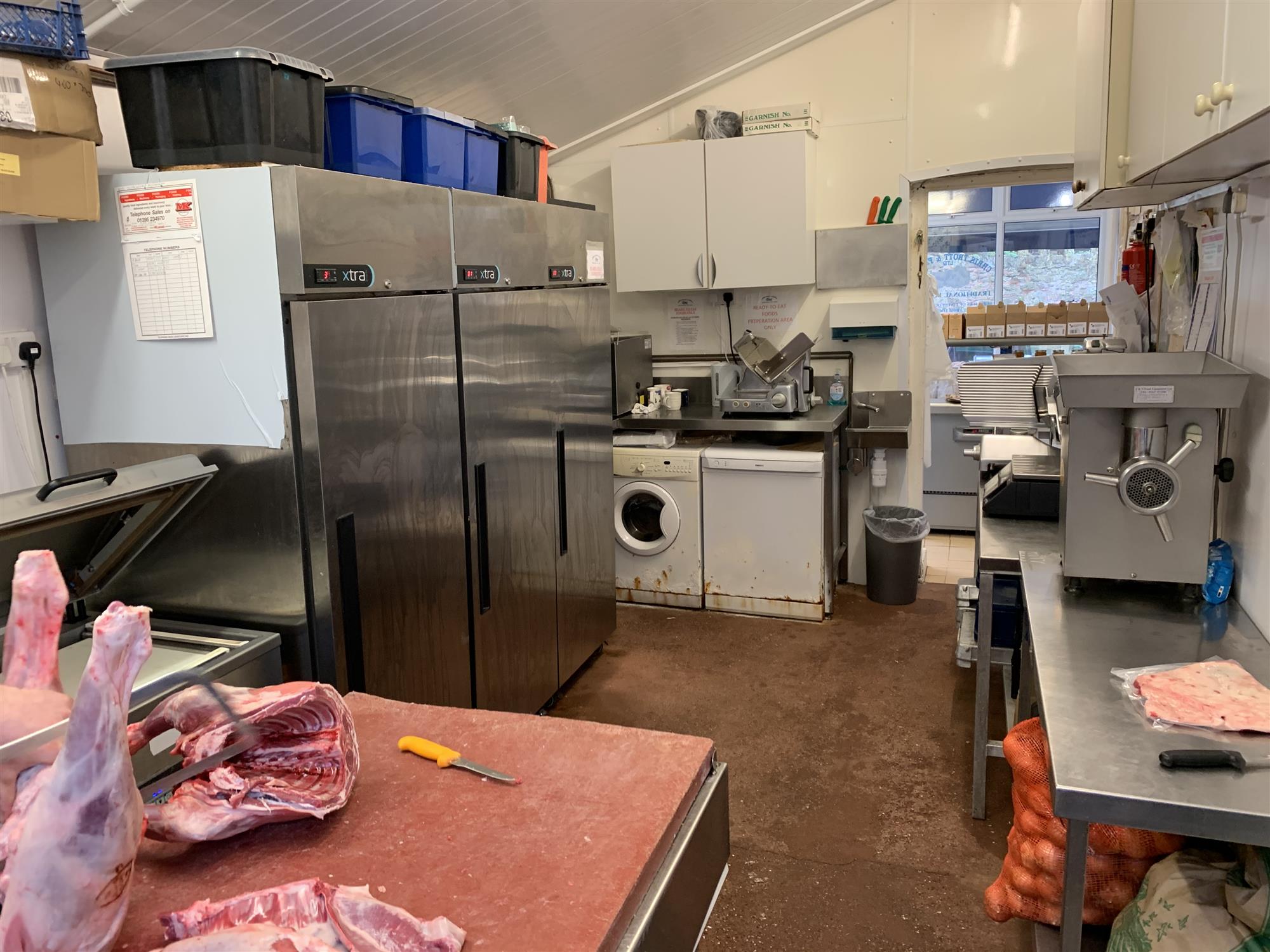The main public area features fully tiled walls and floor throughout for easy cleaning, combined fluorescent strip lighting and spotlighting, a glass-topped ice cream conservator, a Welsh dresser style ambient display unit for preserves and condiments and a substantial and fully fitted, ‘L’ shaped, glass-fronted and refrigerated delicatessen-style food display and serve-over counter for a wide selection of premium quality butchery meats, poultry, cooked meats, cheeses and savouries, with electronic till point, electronic weighing facilities and easy open access through to the main, bright and spacious commercial meat cutting and preparation kitchen.