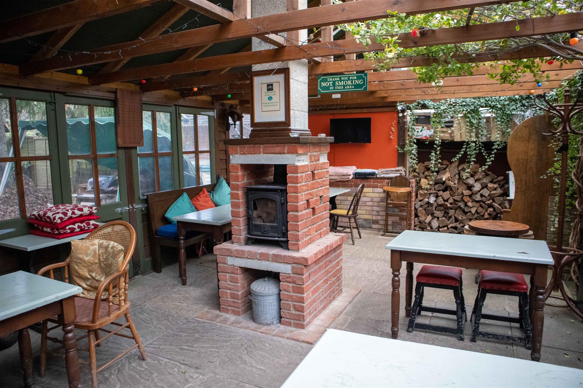 To the rear of the property there is an attractive covered COURTYARD AREA encompassing a log burner, flat screen TV and heaters providing seating for 20-30.