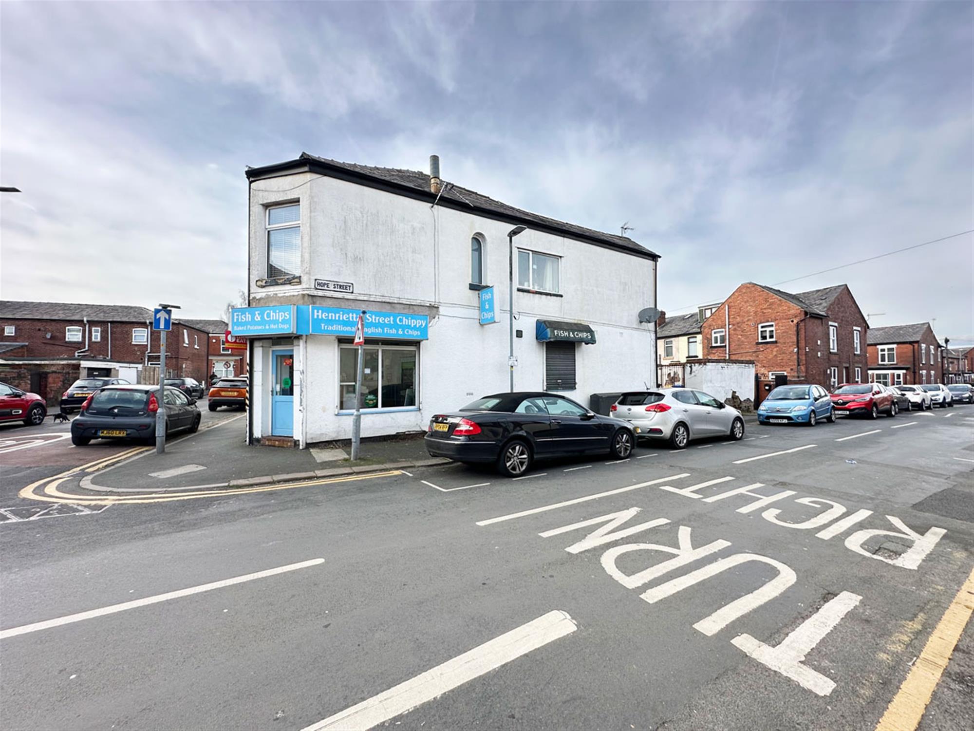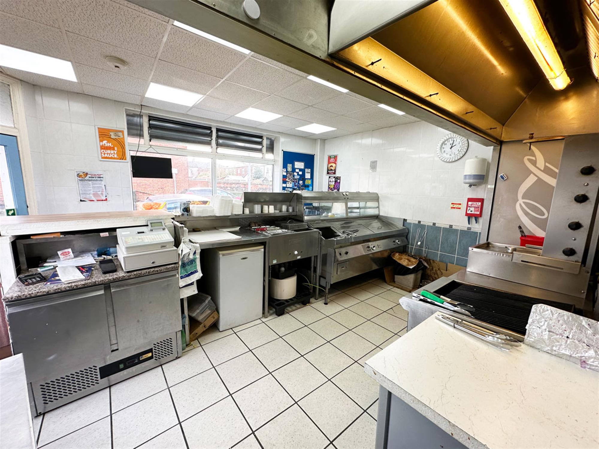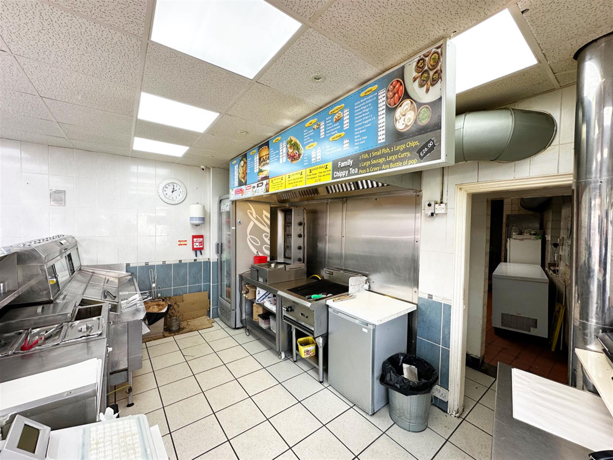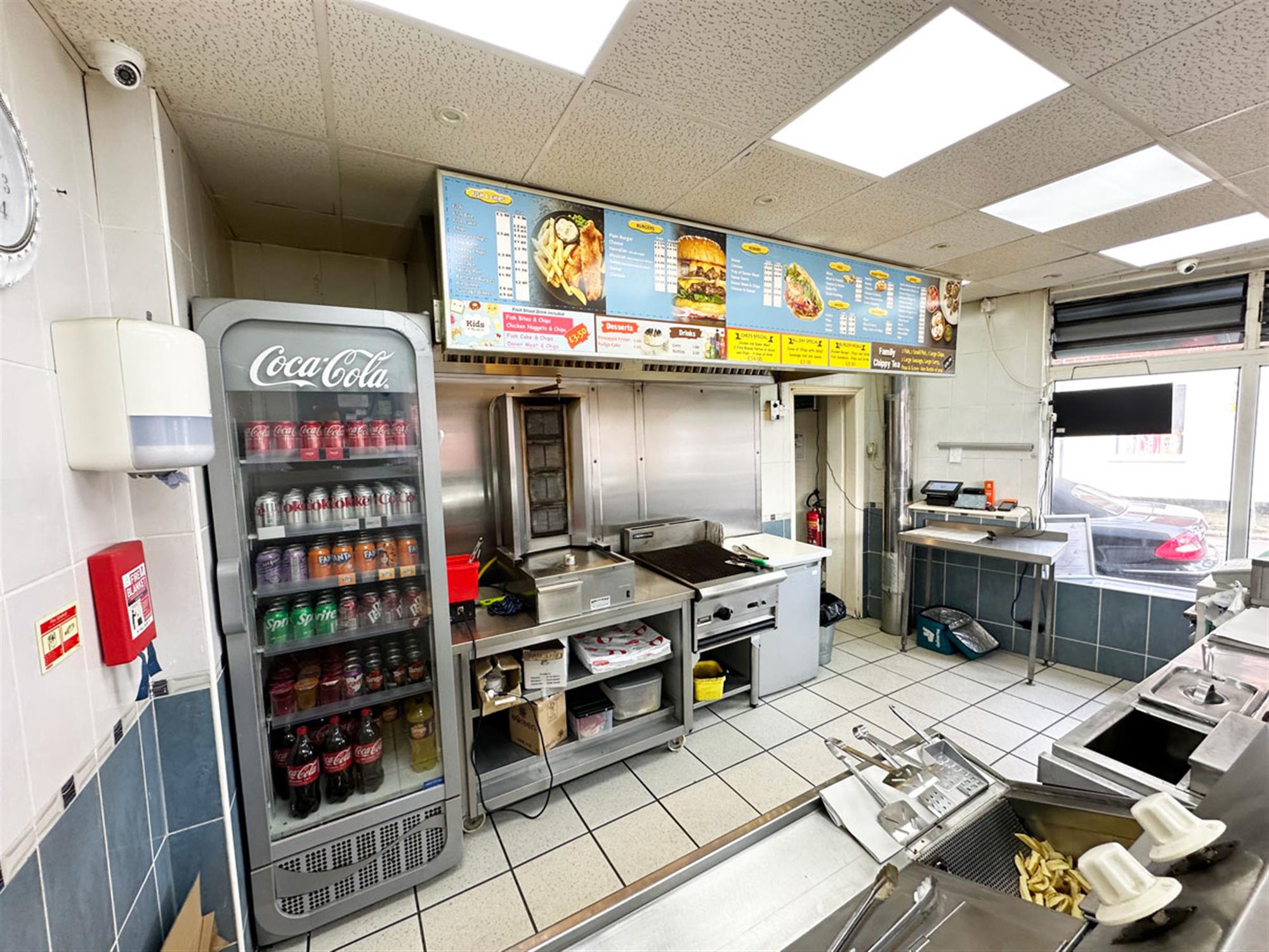 Corner site, corner entrance, waiting/ordering area, serve counter with 2 pan scuttle, canopy box range, bain marie/steamer, kebab area, large charcoal grill, large rear preparation kitchen providing 4 burner oven, cold storage, preparation area, rear display room with rumble, chipper & potato storage, exit to shared yard, staff W/C and basement providing storage.
