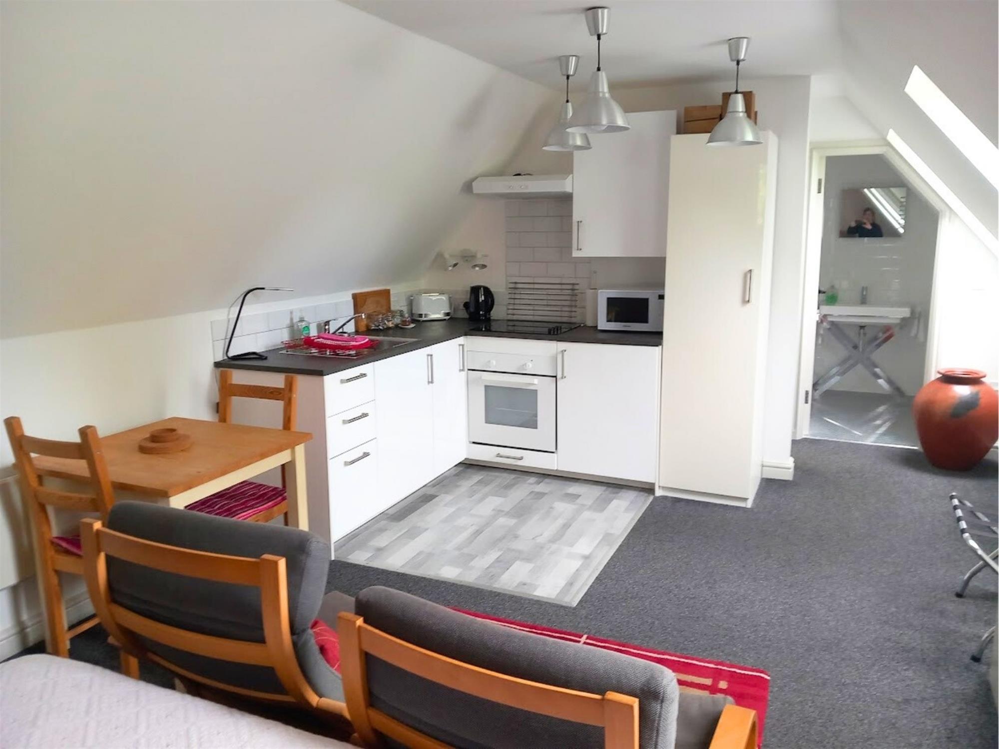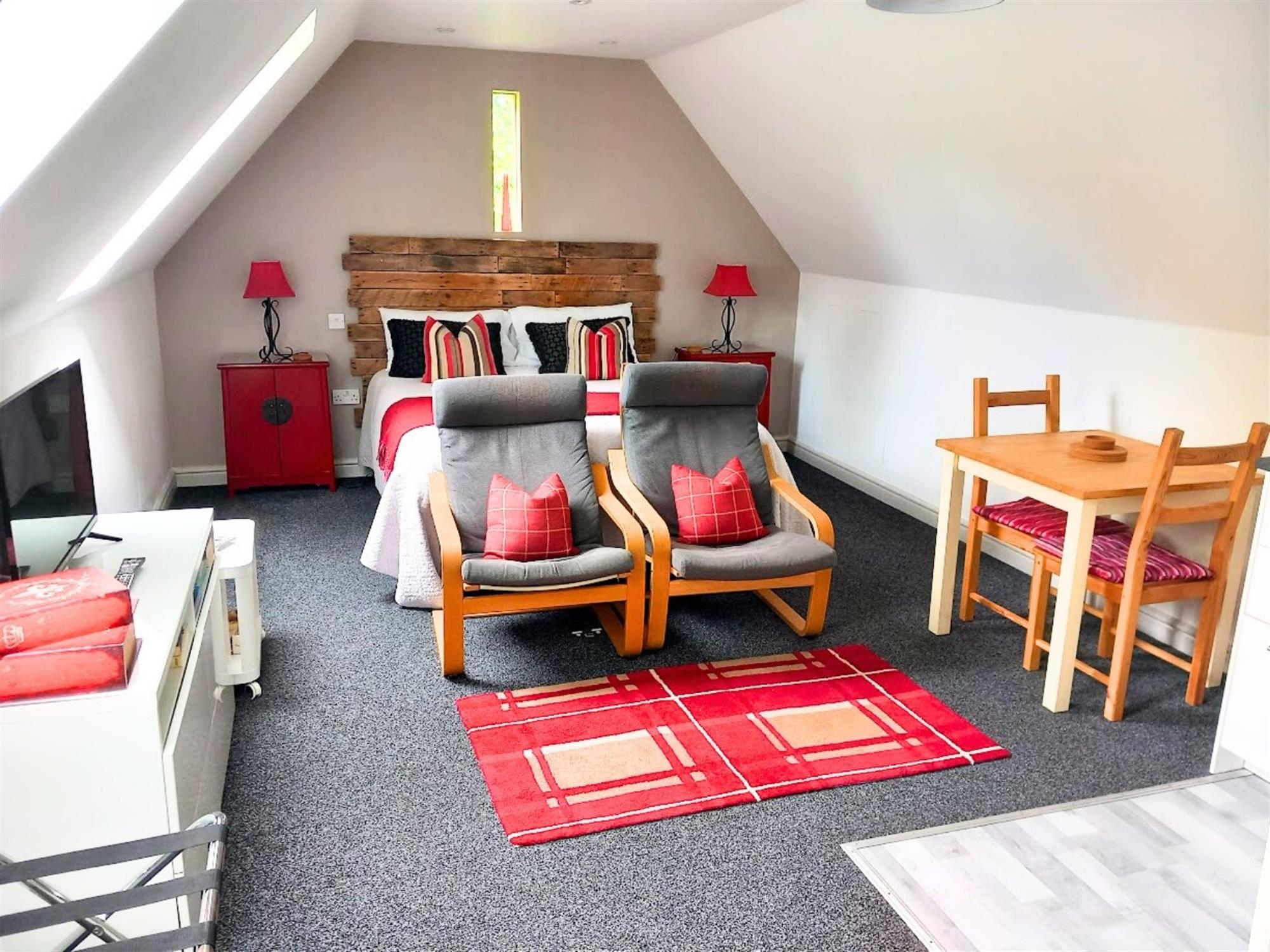 Forming part of the CARPORT. This is timber clad with a pitched slate roof. The accommodation comprises a ground floor entrance leading to the first floor apartment with open plan LOUNGE, KITCHEN and BEDROOM with BATHROOM (having walk-in double shower).