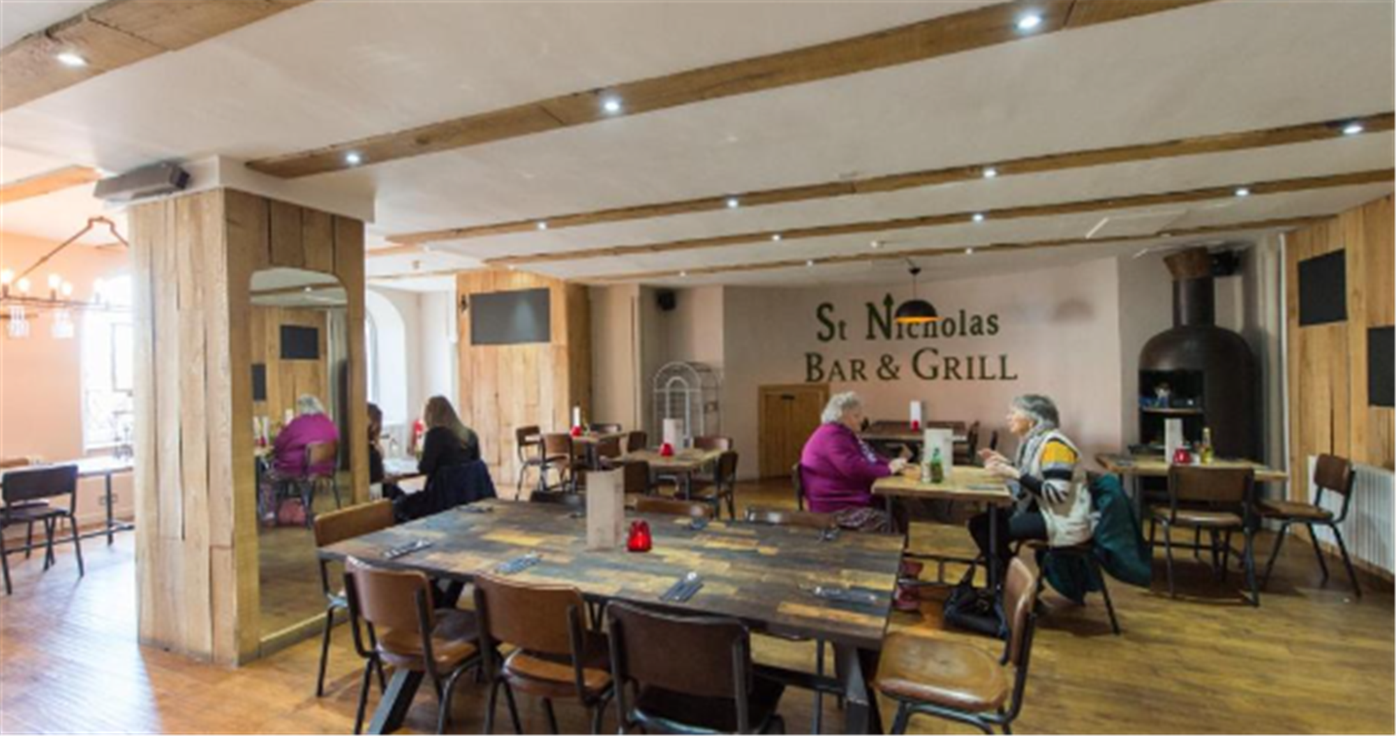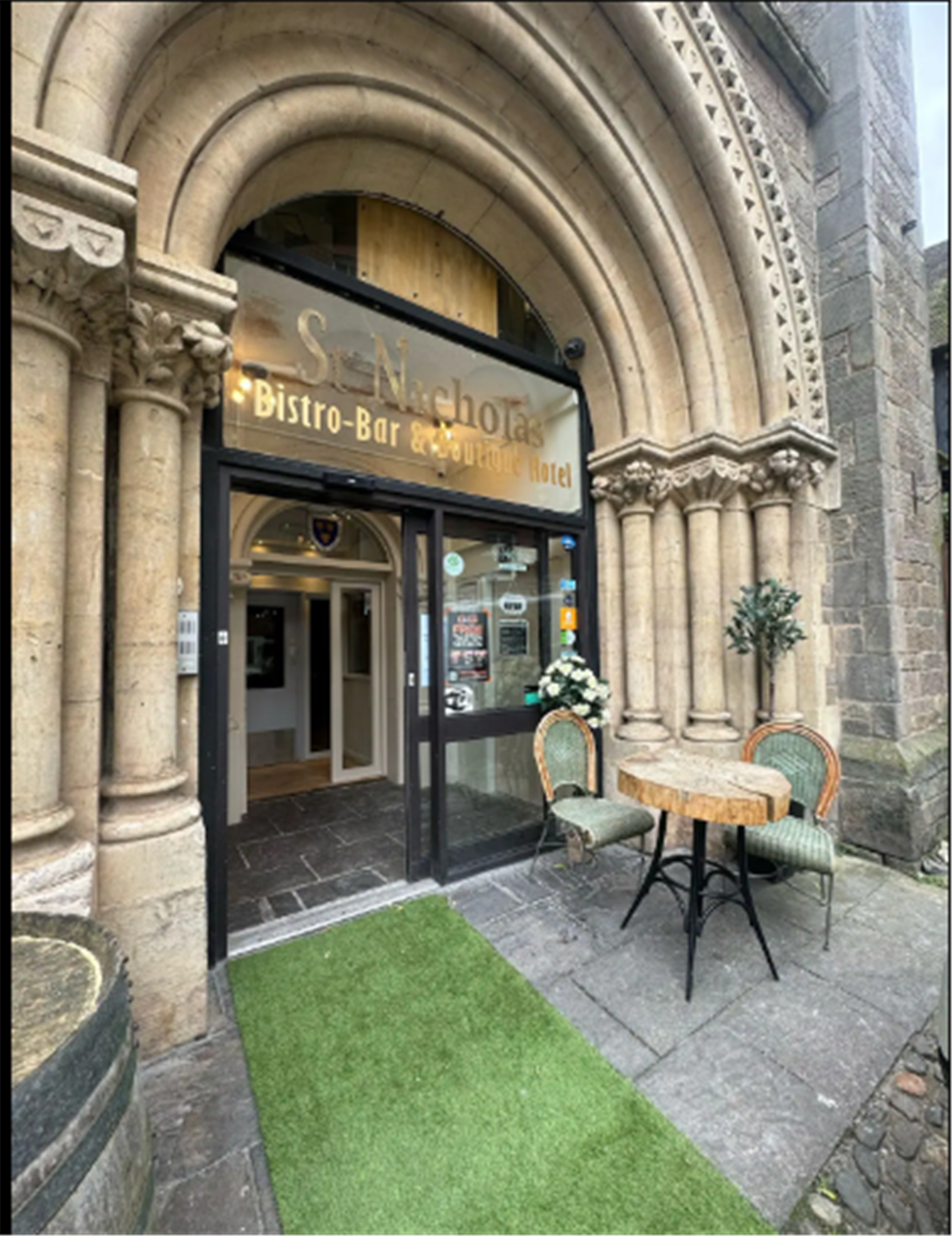 The reception foyer area also affords staircase access to the upper floors and easy level access through to the property’s charming and spacious dedicated café bar and restaurant (“The St Nicholas Bar & Grill”) with truly magnificent columned archways, feature spotlighting, polished timber flooring throughout for easy cleaning, stylish furnishings for approximately 60 covers and a prominent and fully fitted, timber-built free-of-tie licensed servery with range of draught pumps, bottle and glass display and storage shelving, chilled drinks display cabinets, modern coffee machine and electronic till/food ordering point etc.