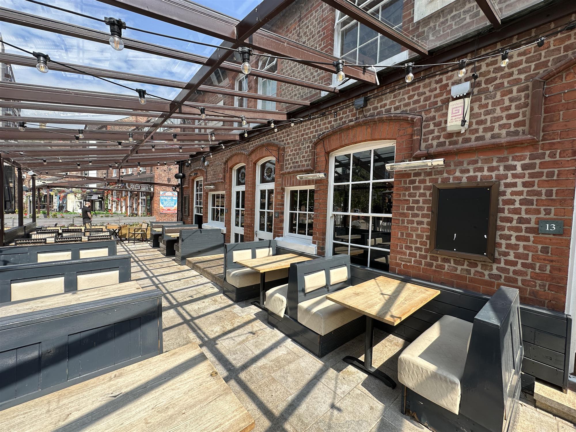 Large covered alfresco seating with heaters to seat 65.