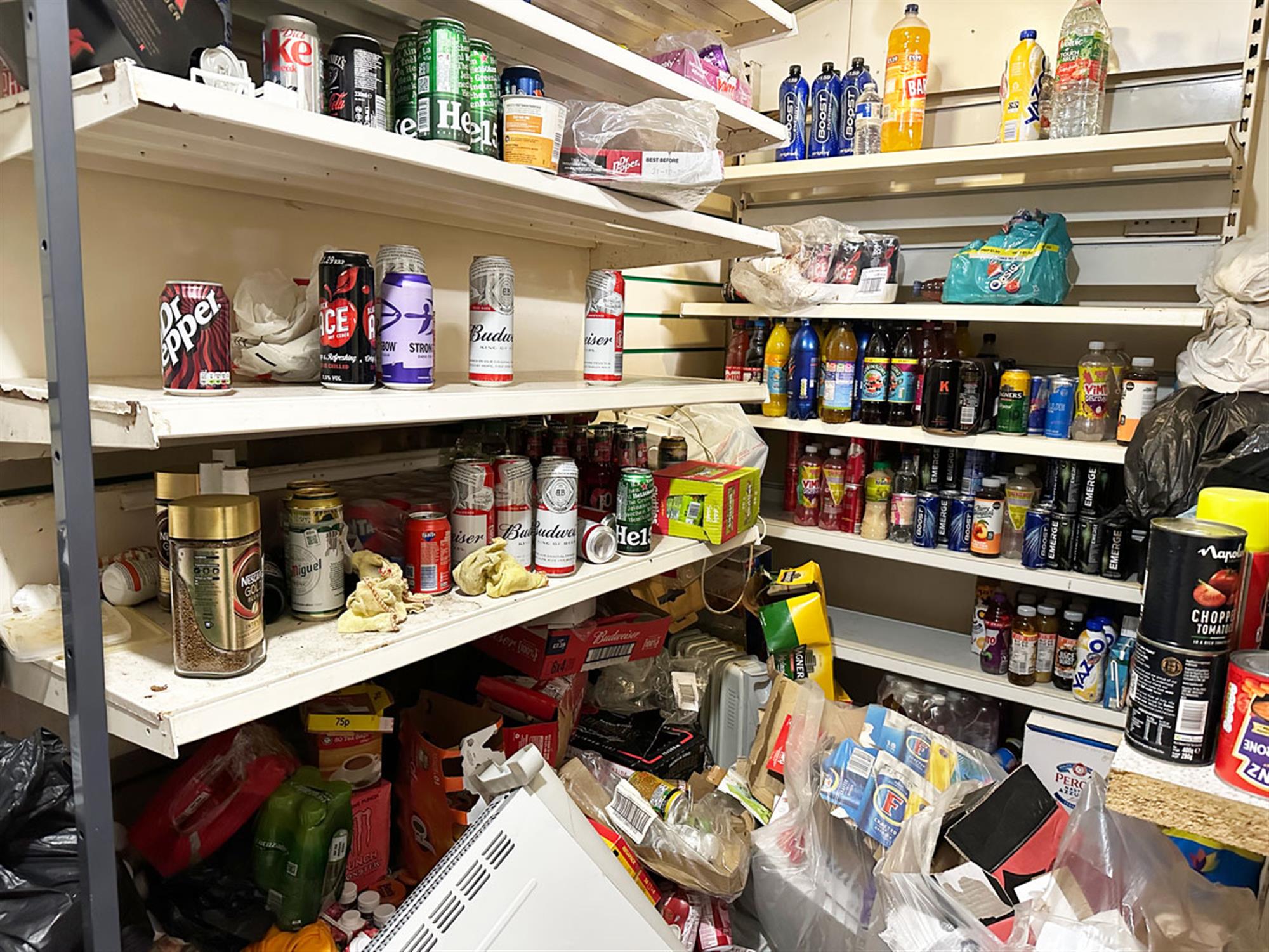 Entrance, shop floor providing service counter, display shelving, drinks display fridge, alcohol display area, rear store room and exit to yard.