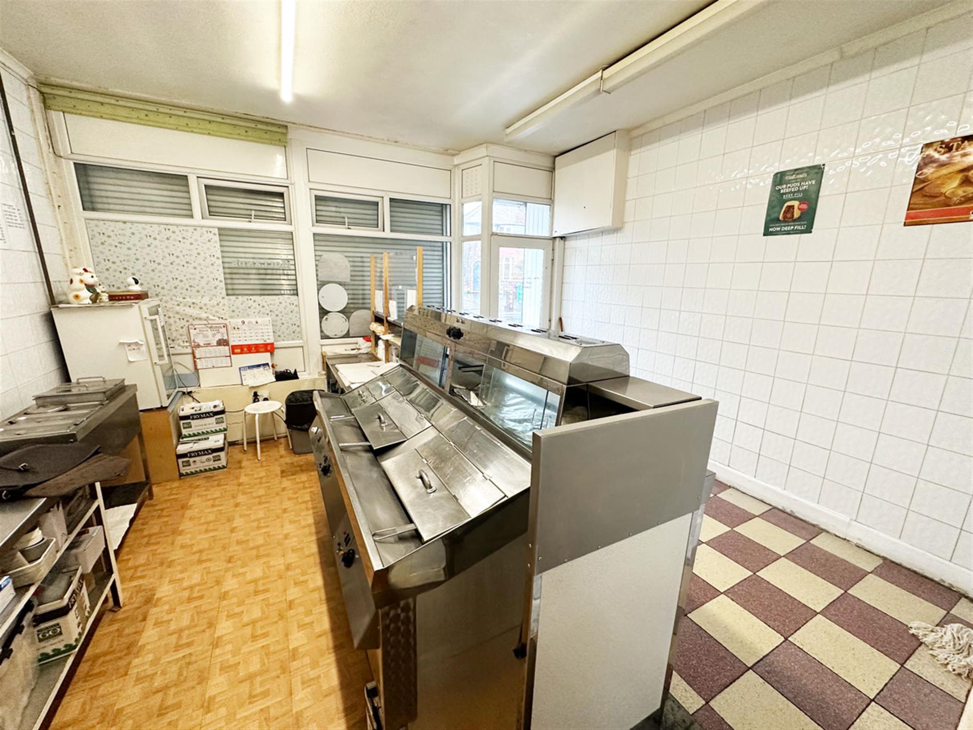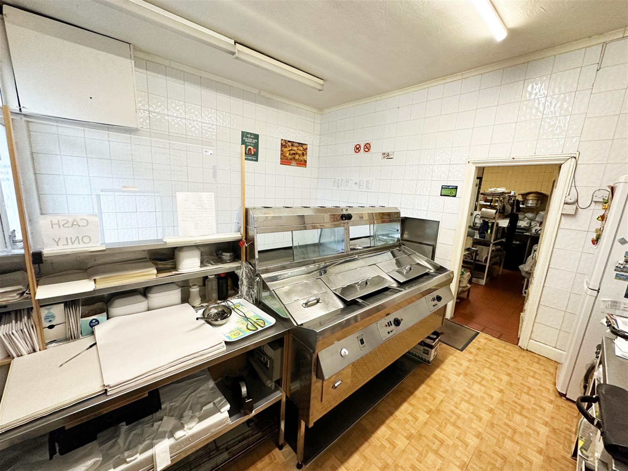 This shutter fronted premises provides waiting/ordering area, service counter, 2 pan, 1 scuttle, 2 display box range, free standing bain marie, rear kitchen providing preparation area, 6 burner oven, 3 burner stove, cold storage, potato preparation room with rumbler & chipper, large storeroom, exit to yard.