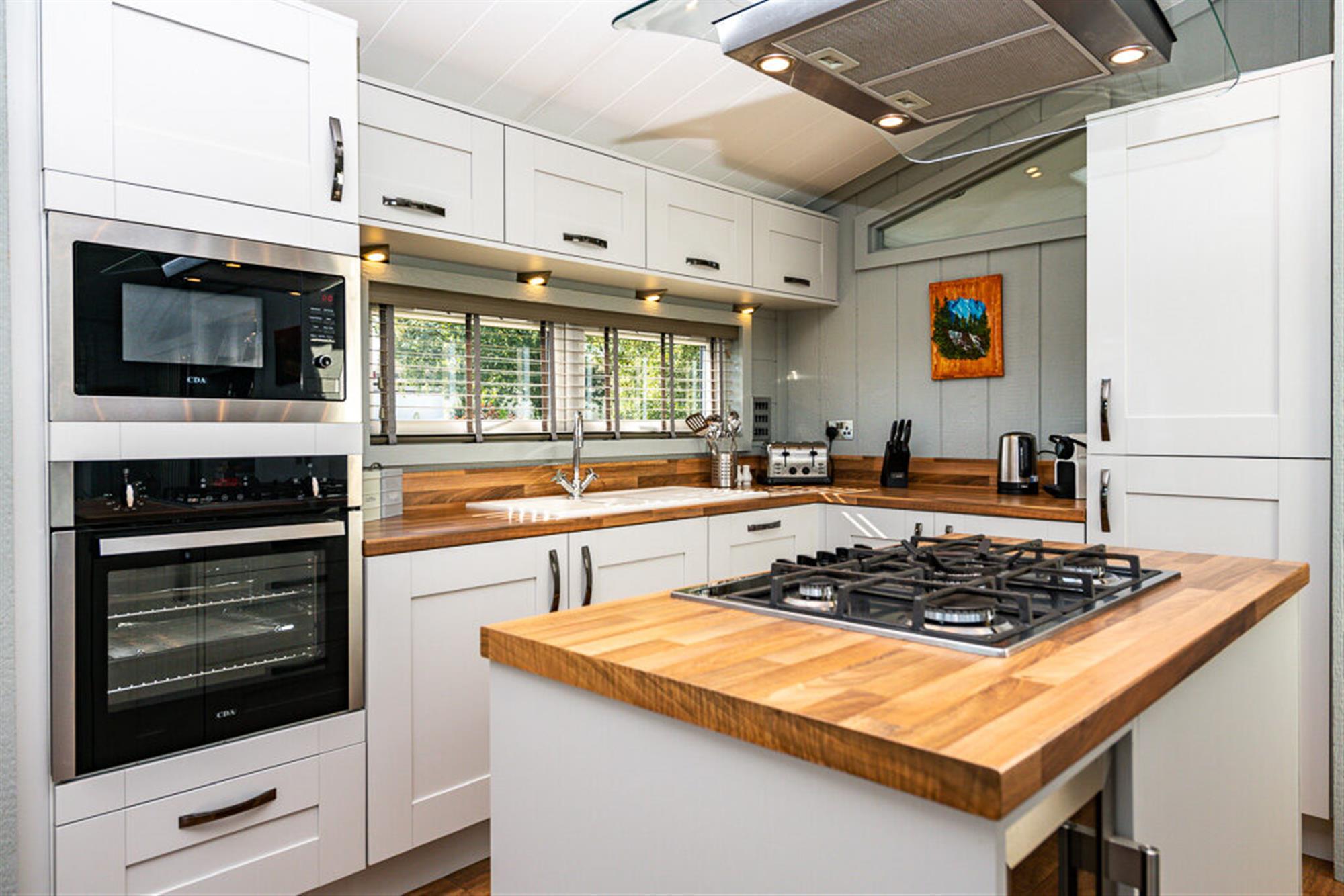 The main living space incorporates an attractively furnished lounge seating area, including a luxury sofas, coffee table and 40 inch "smart" TV, and a charming breakfast/dining room area with glazed doorway access to a delightful private decked terrace, together with one step up to a modern, fully fitted and slightly elevated domestic kitchen with quality wall and base storage units, a wide range of well maintained appliances, including electric oven and large gas hob with overhead extractor.