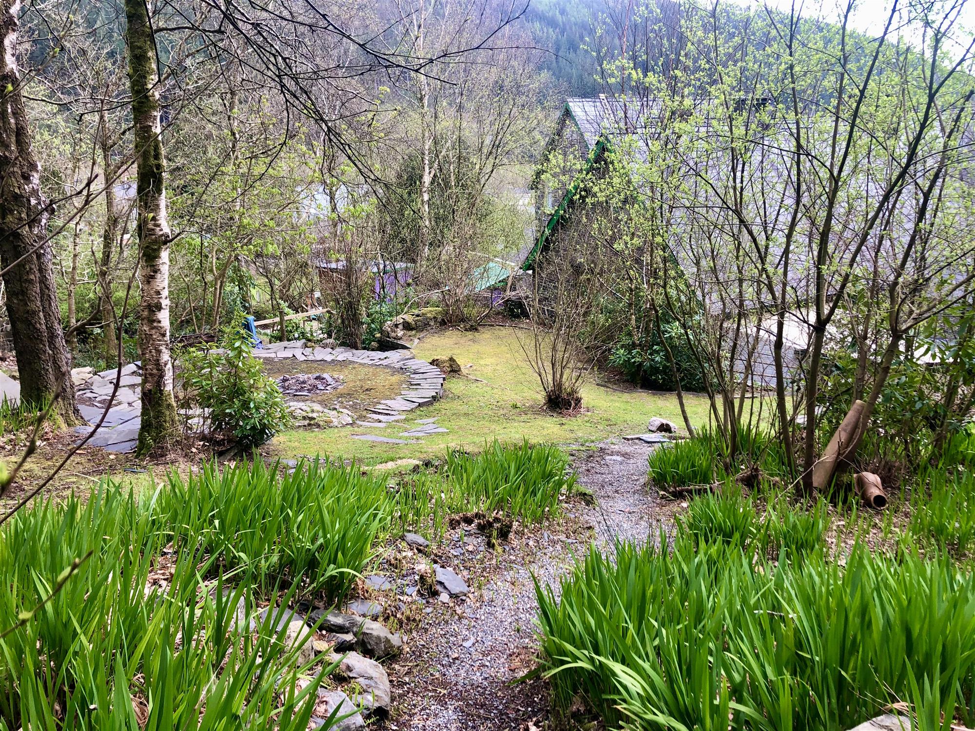 The grounds are charming with a terrace for a fire pit, a stream running through the same and many mature shrubs and borders.