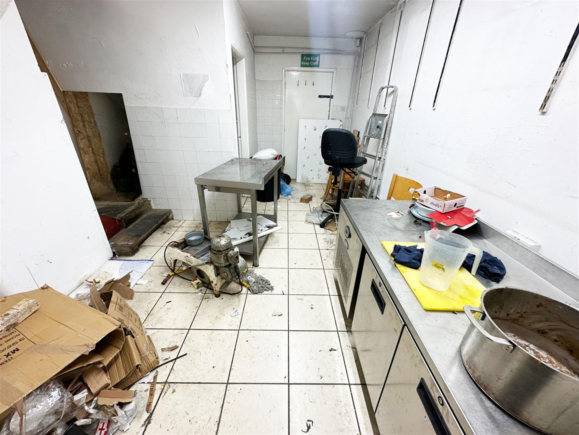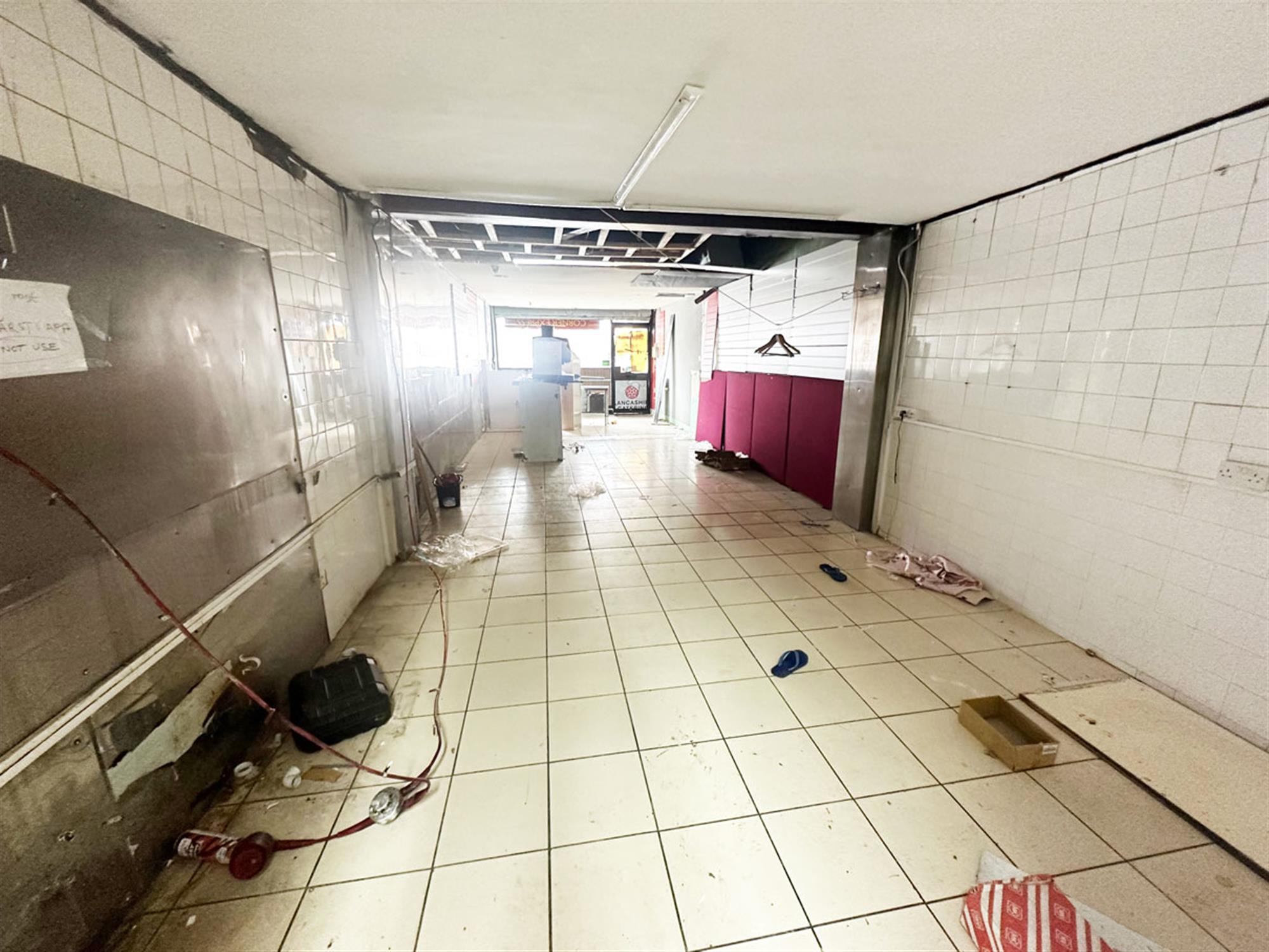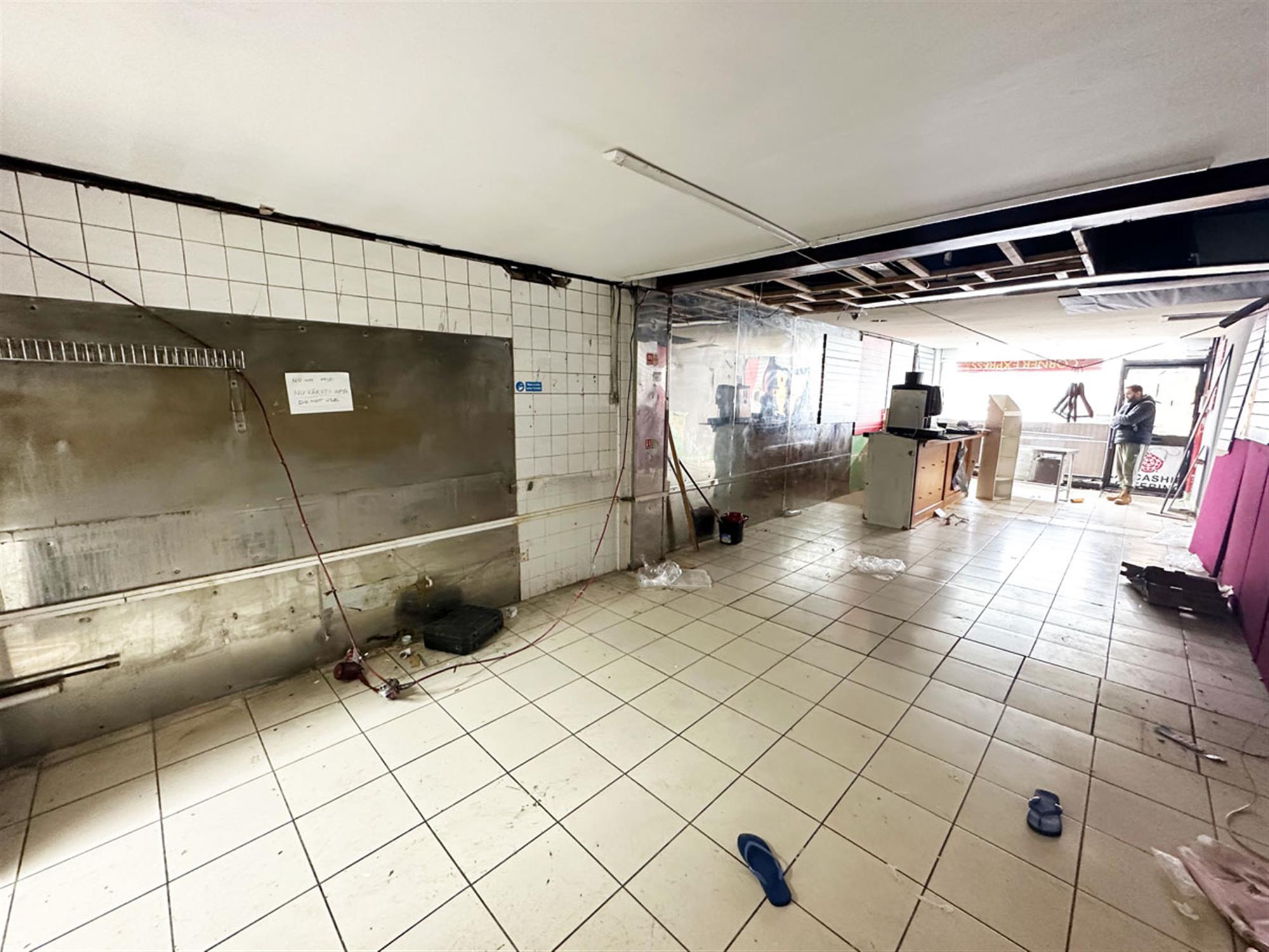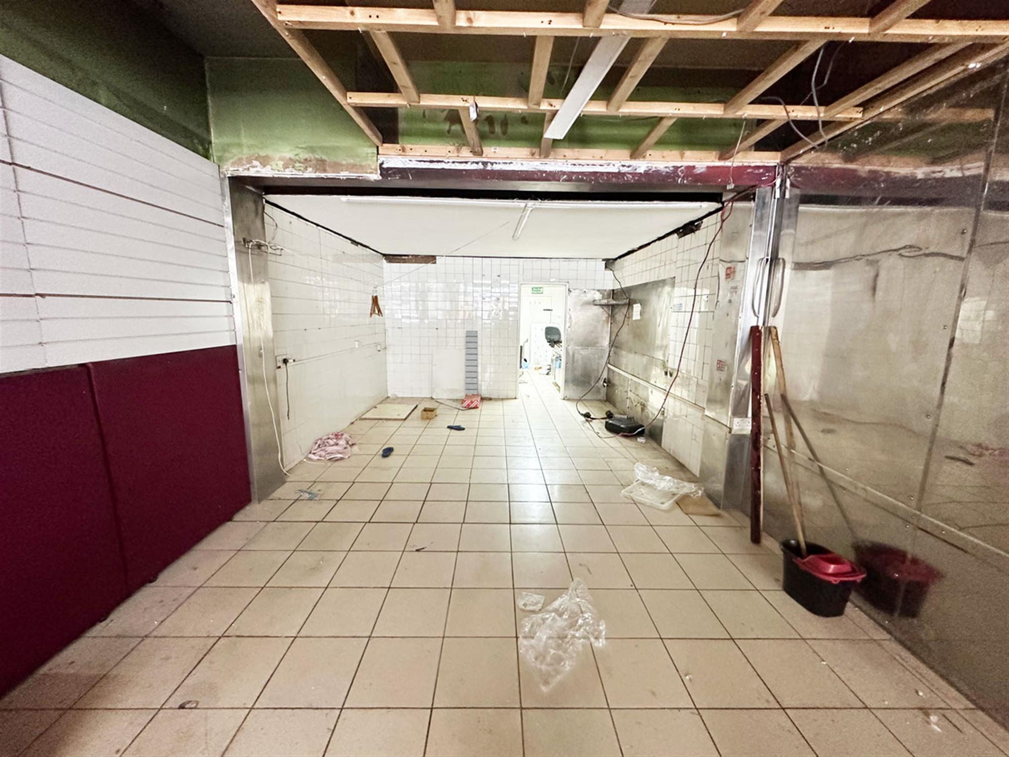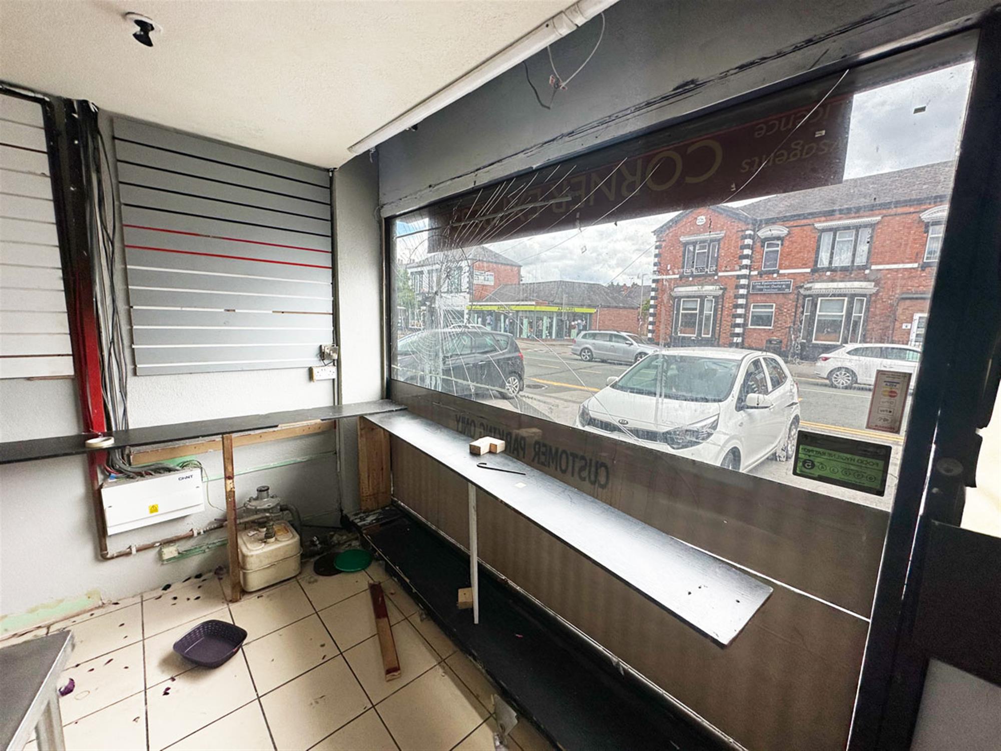 Owner parking to front, glass fronted unit, entrance, ordering/waiting area with room for seating, service counter, open plan kitchen area, rear preparation room, staff WC with shower, exit to bin area.