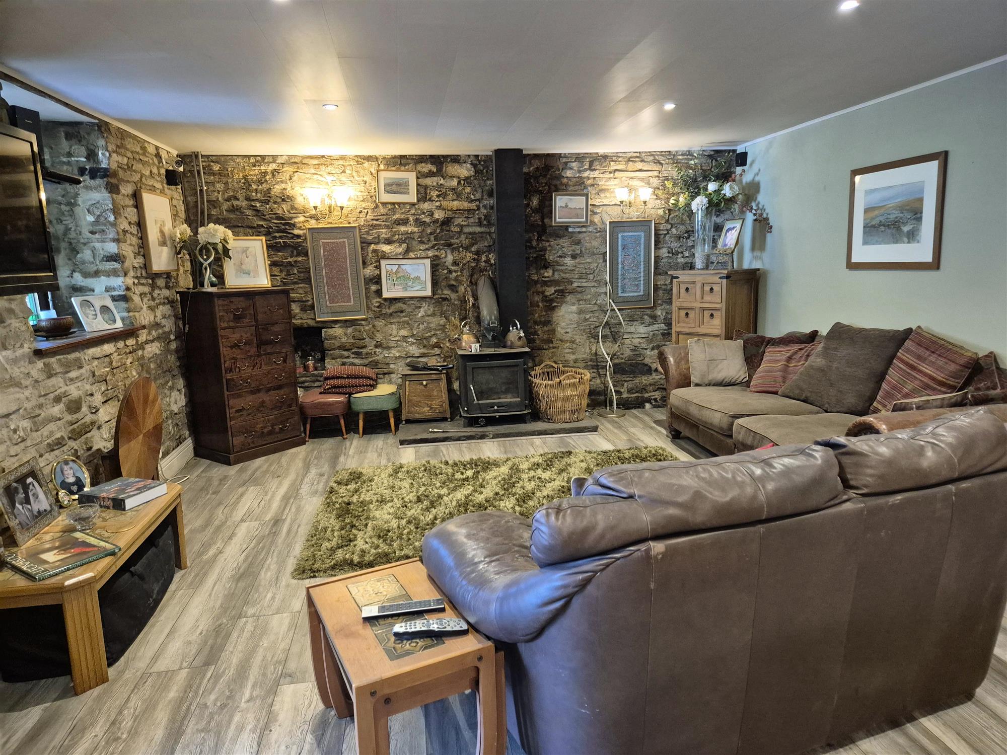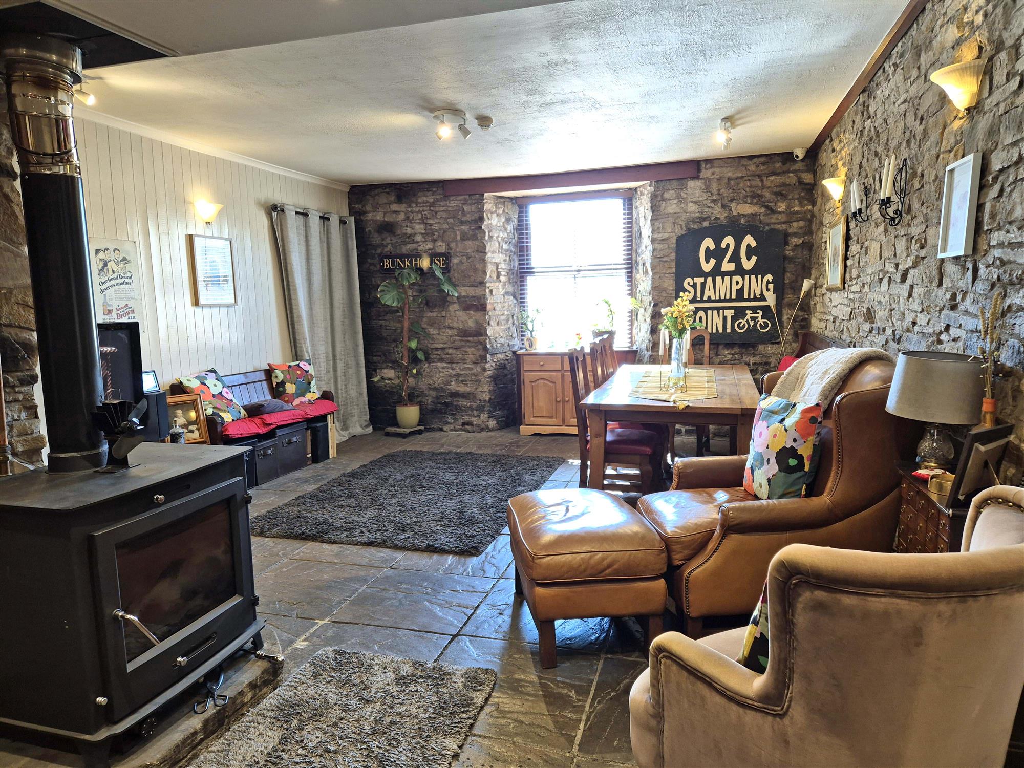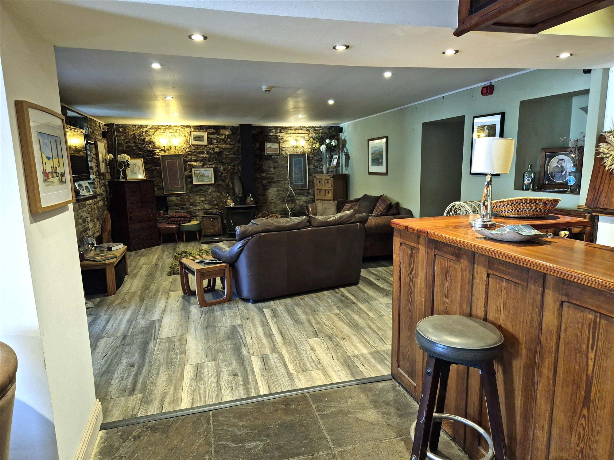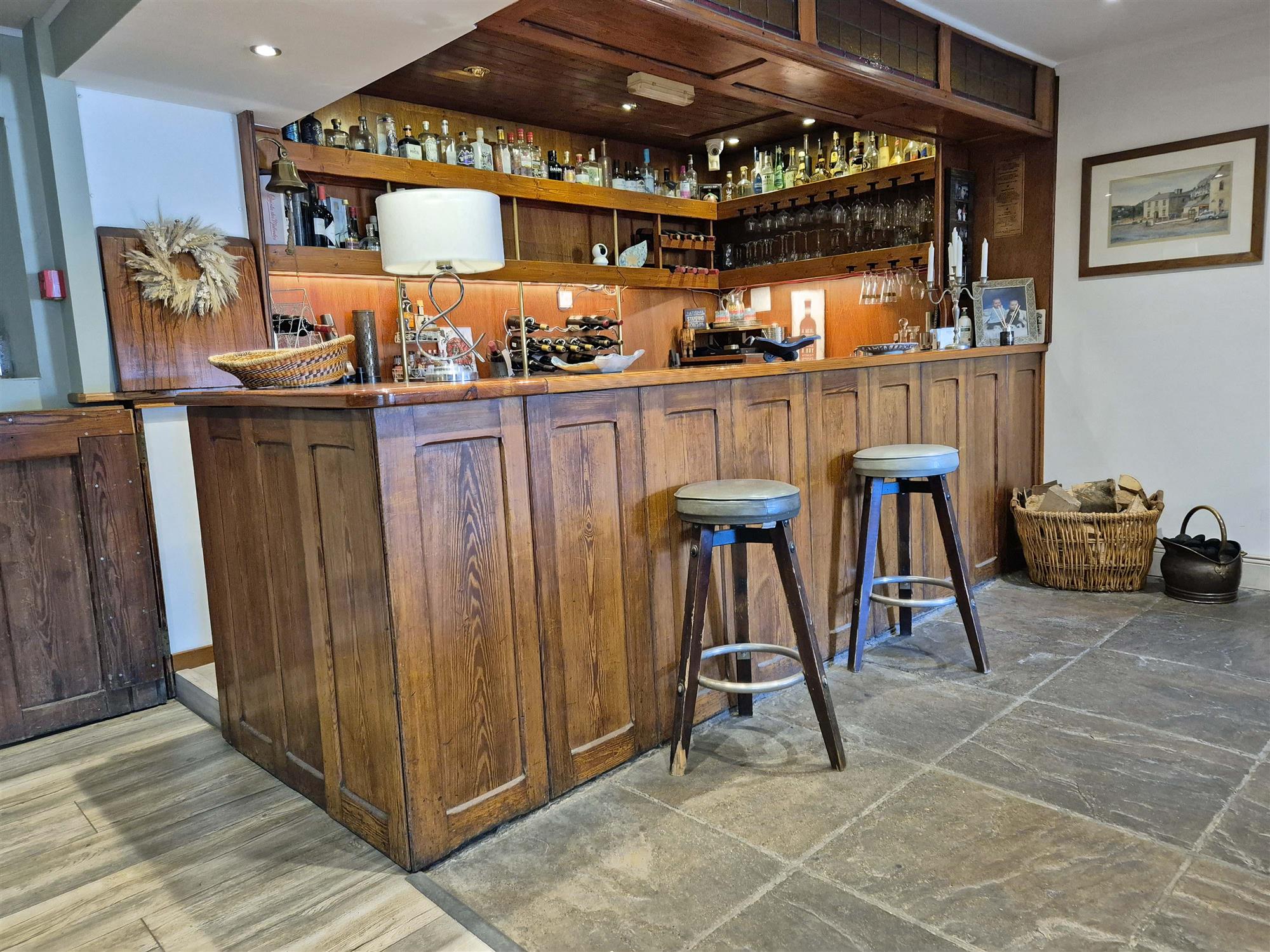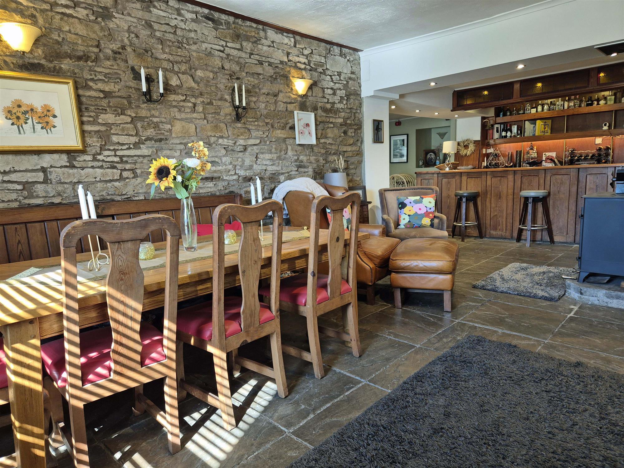 Entrance vestibule with main BAR to the left which is split into two sections and offers seating for 60 with wood constructed BAR SERVERY, tile and wood flooring, exposed stone walls and log burner.
