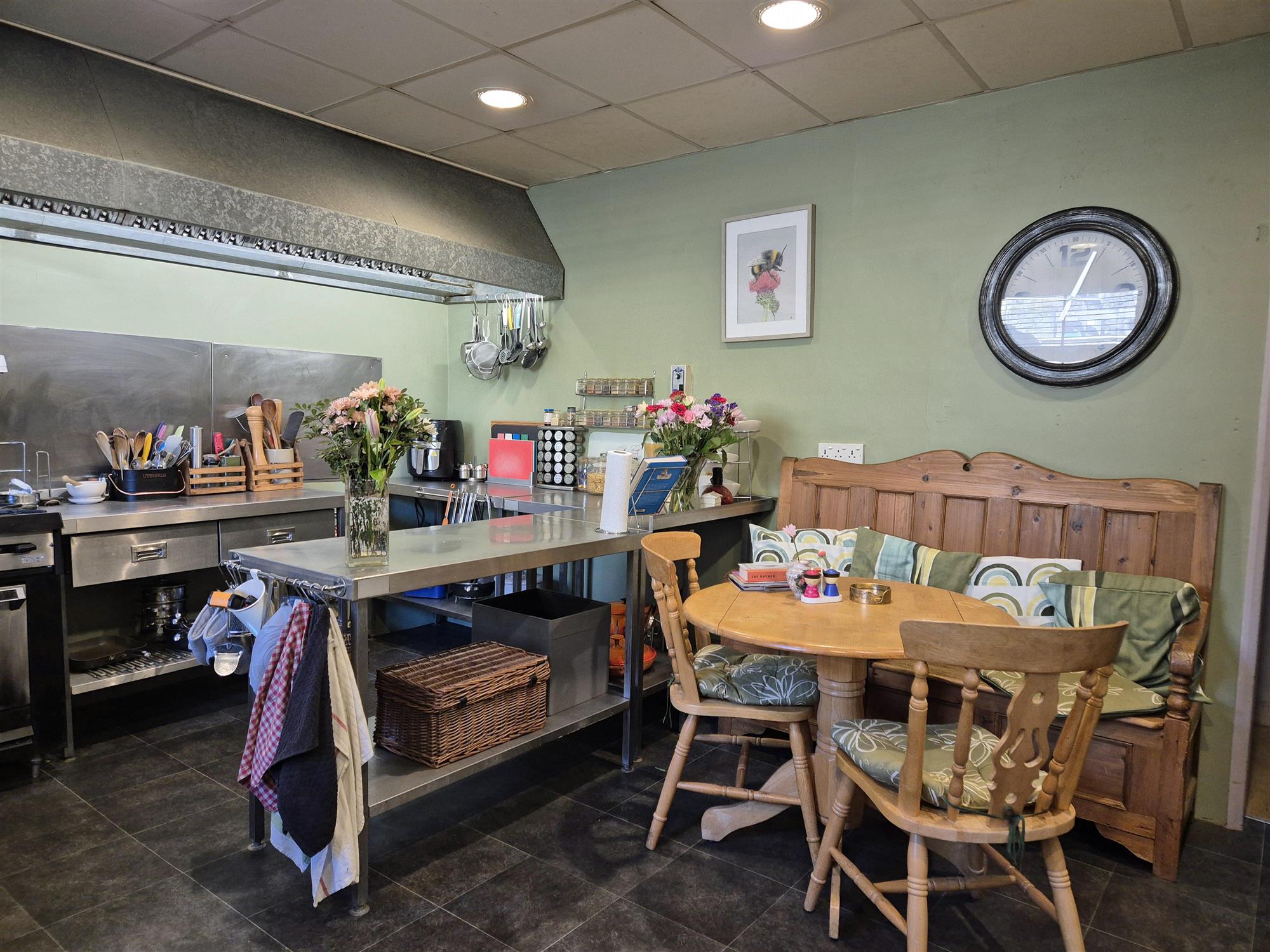 TRADE KITCHEN which is of a good size and well equipped, and features vinyl flooring, hood canopy and multiple WASH and PREP AREAS. UTILITY ROOM offset.