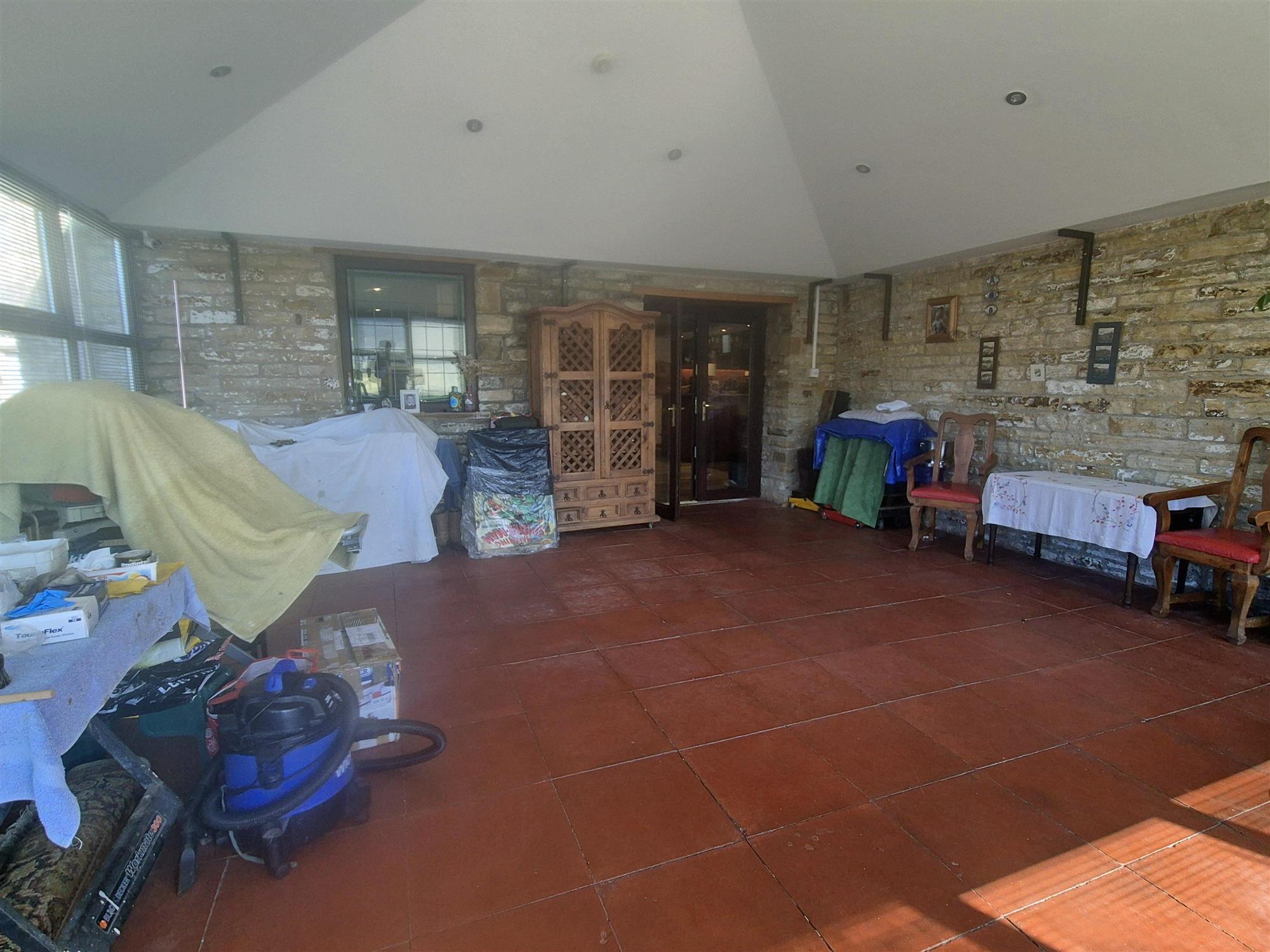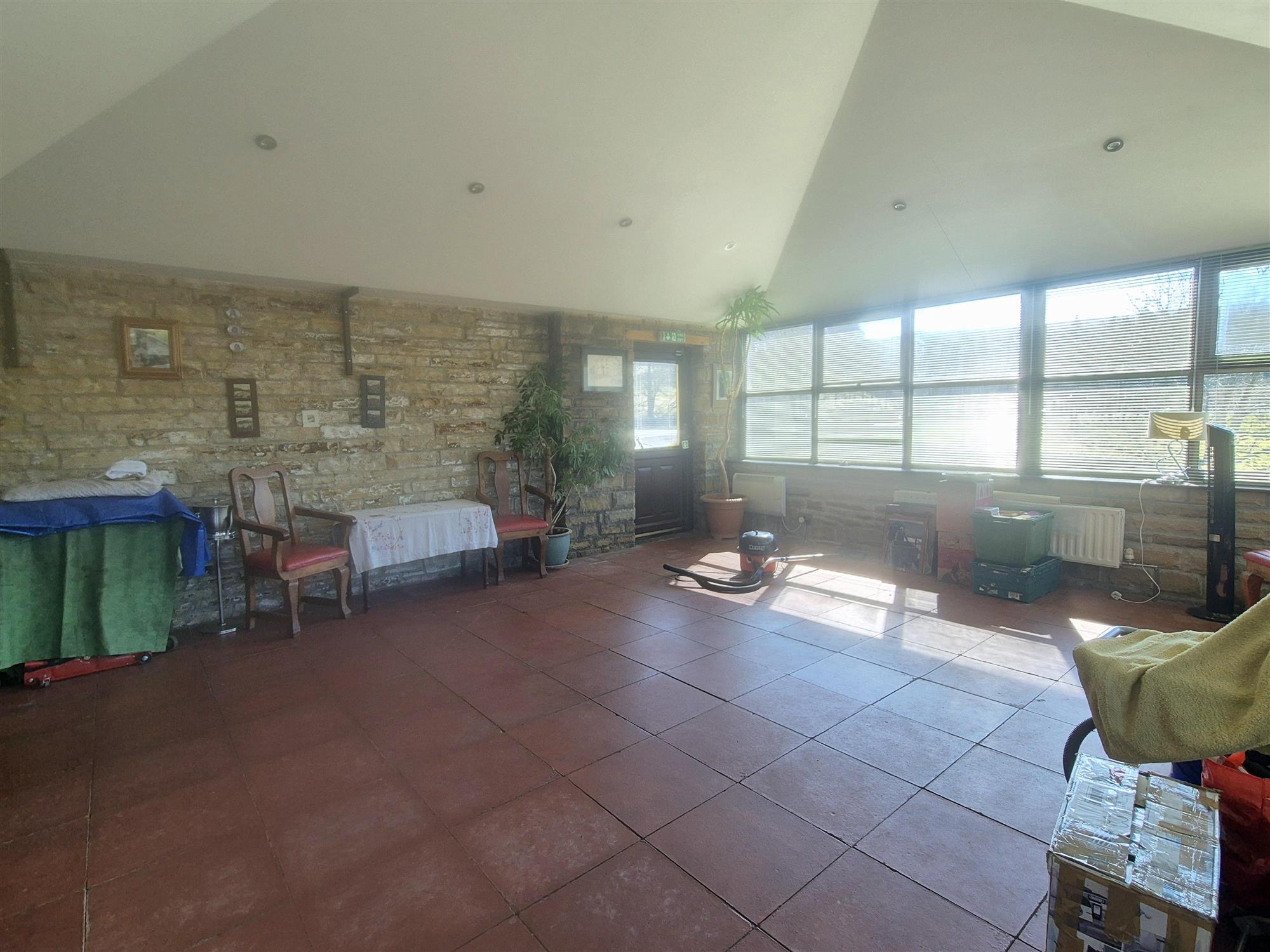 CONSERVATORY AREA with tiled floor and stone walls, and door access to the front of the property. This area would accommodate 40.