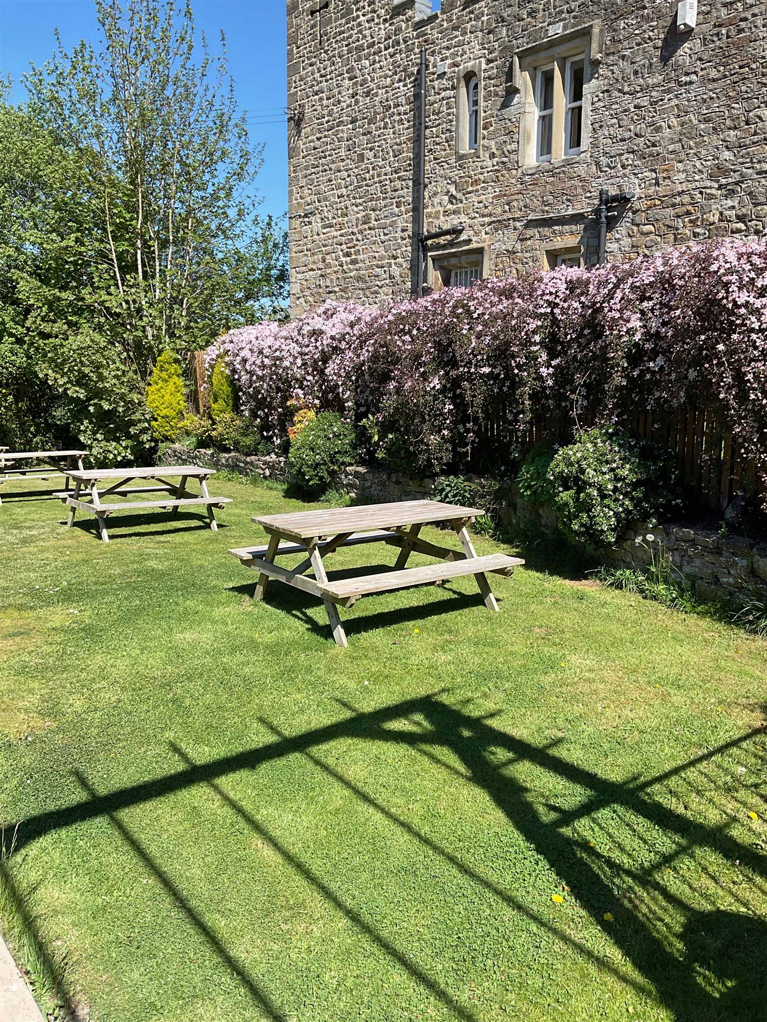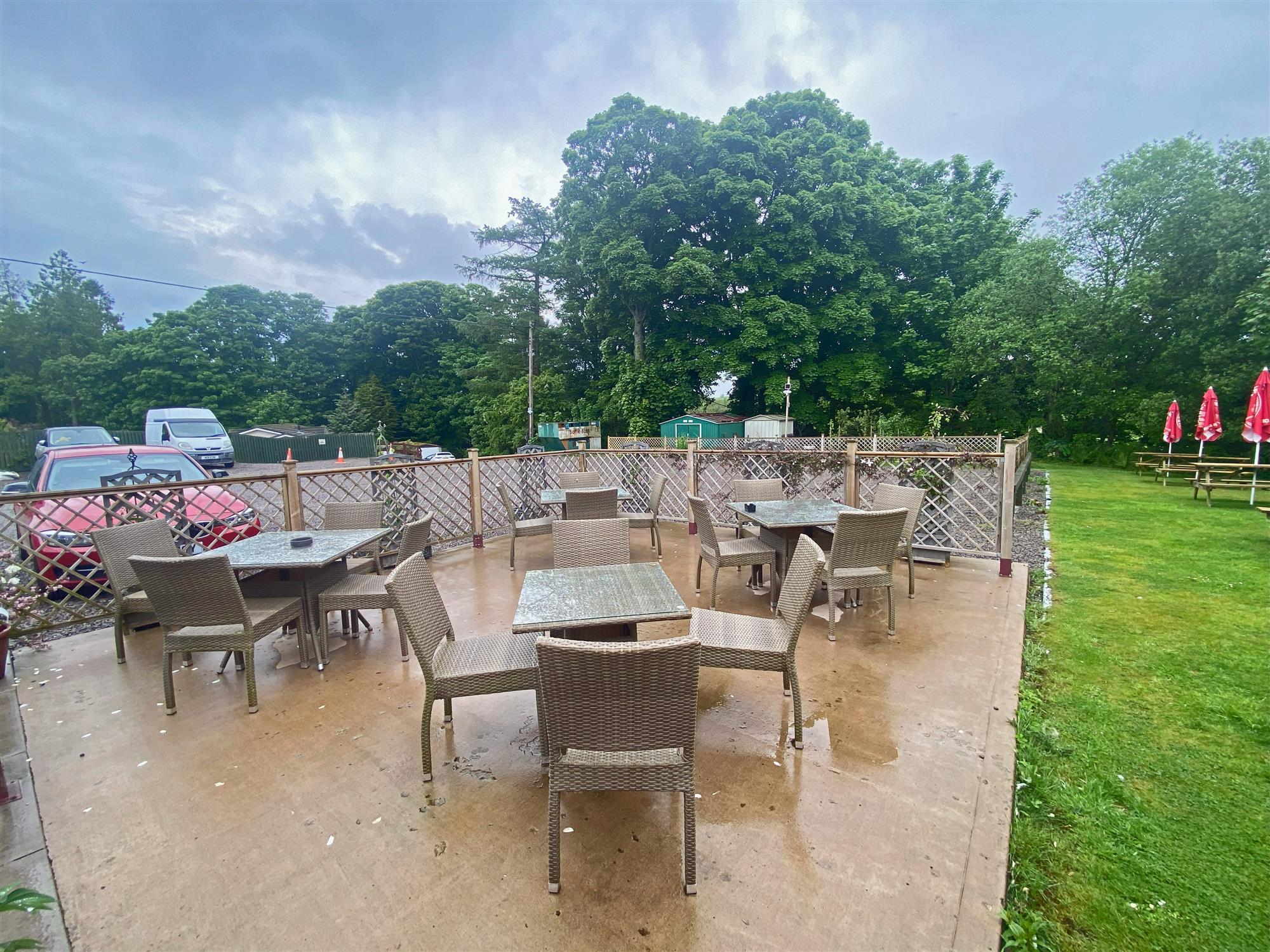 Lawned TRADE GARDEN with picnic style benches for 30 and a sizeable CAR PARK to accommodate 50 vehicles.