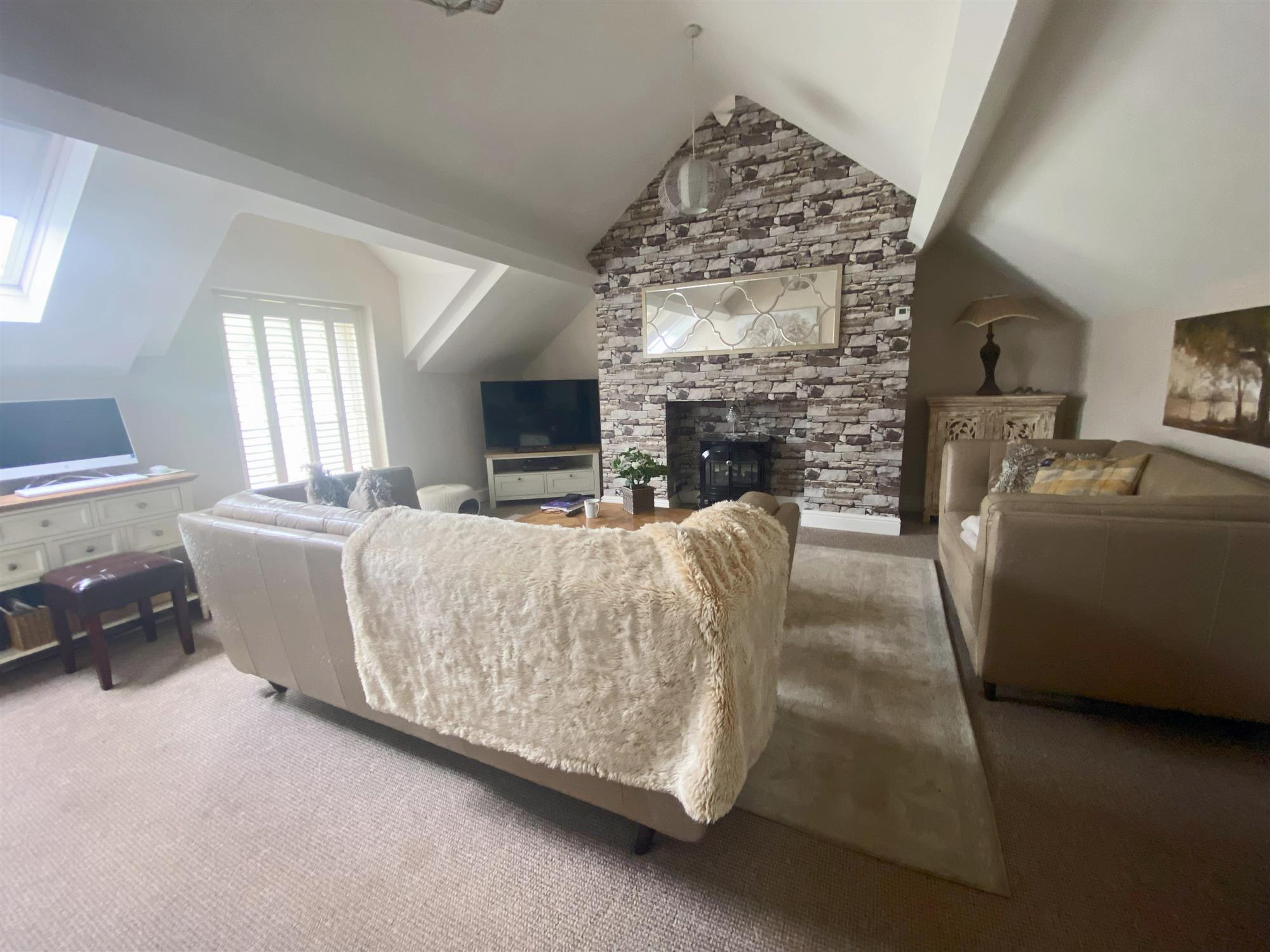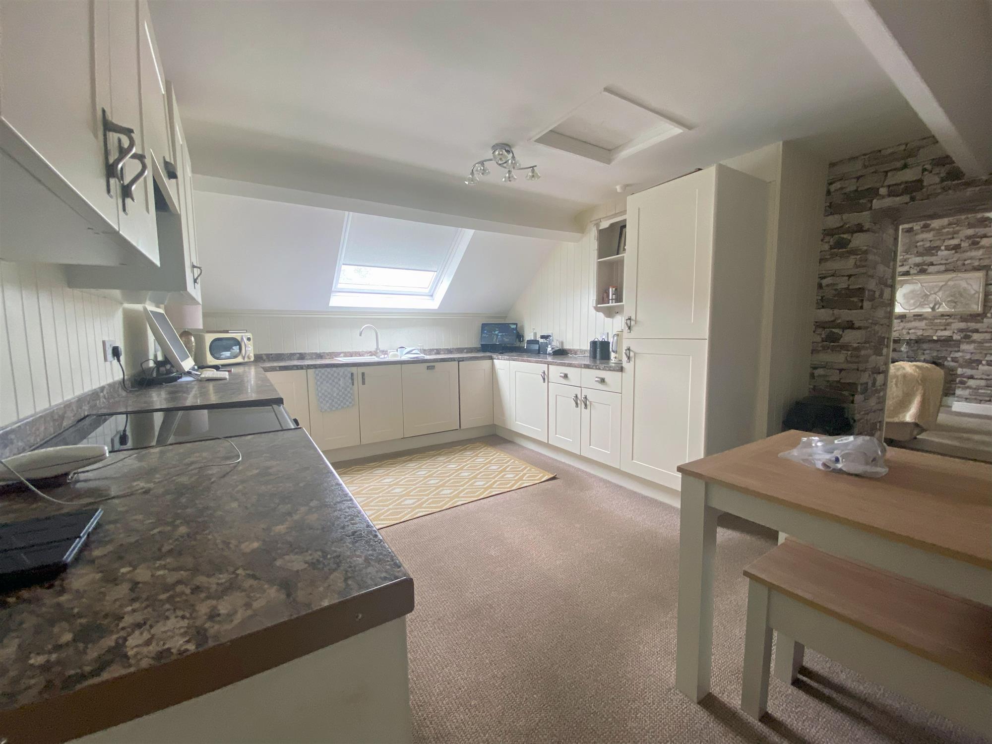 Located at first floor and comprising: LOUNGE with Velux window and fireplace with electric log burner. FITTED KITCHEN/DINING ROOM. Good sized BATHROOM with walk-in shower and freestanding bath. 2 DOUBLE BEDROOMS, one of which has an EN SUITE BATHROOM.