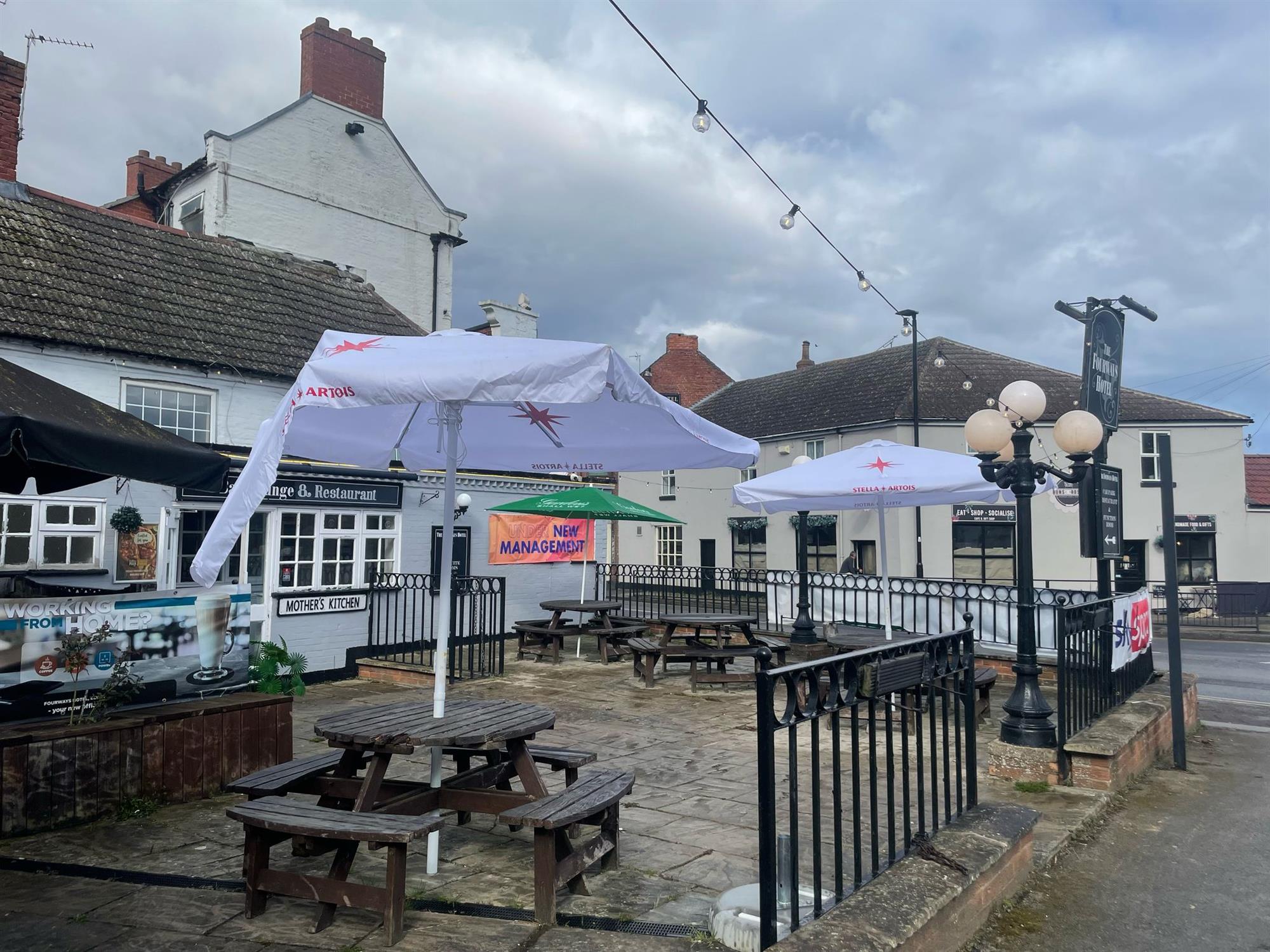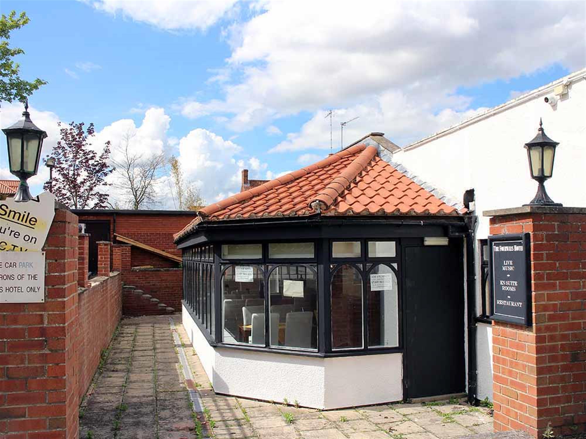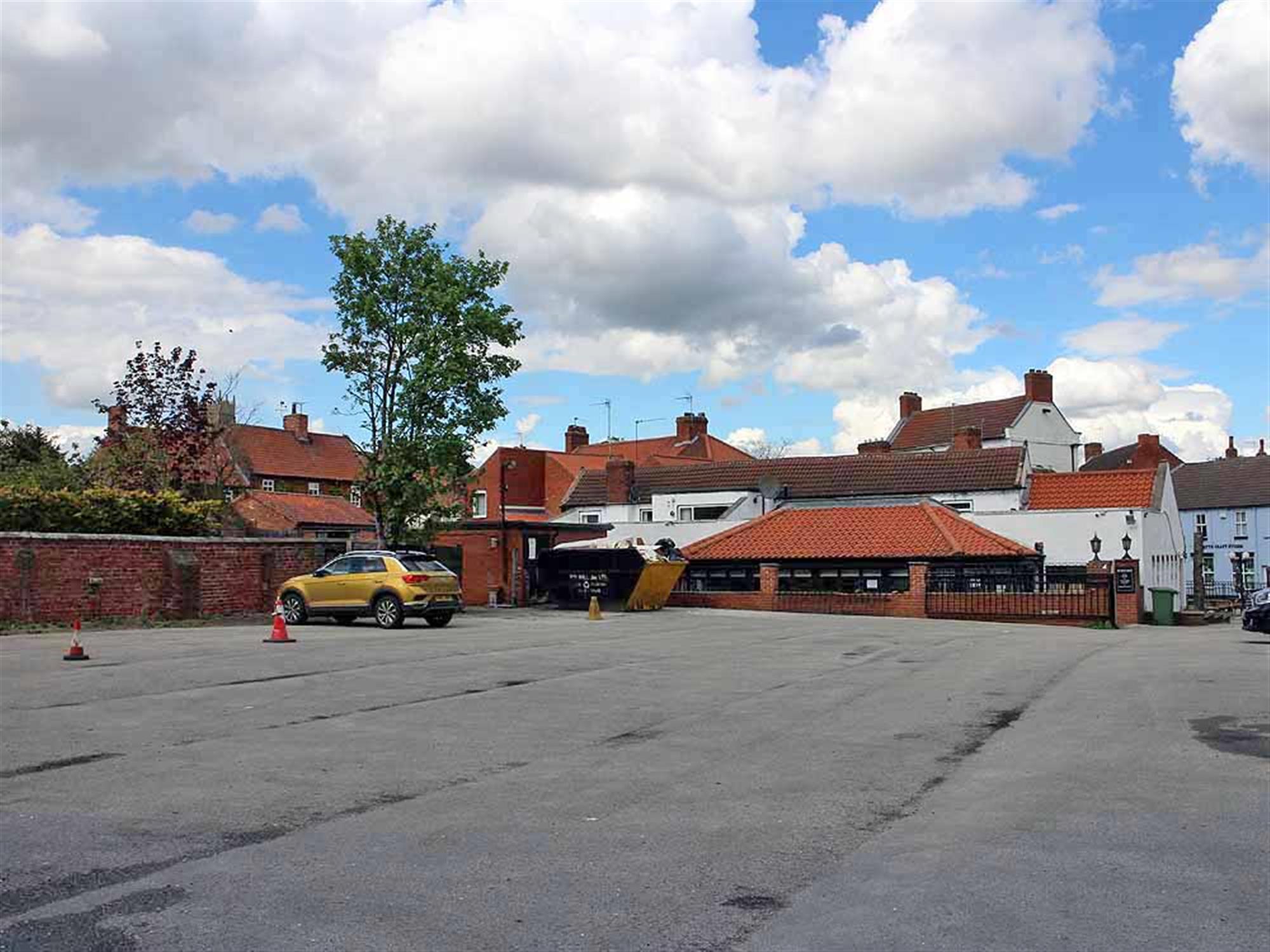 Flood lit Car park with space for 46 vehicles. (Two car parking spaces are used by the adjacent Blyth Chiropractic Clinic who have right of way over the car park for parking use only) Front trade patio with bench seating for 40. Please Note: The detached flat roof double garage will be retained by our client.