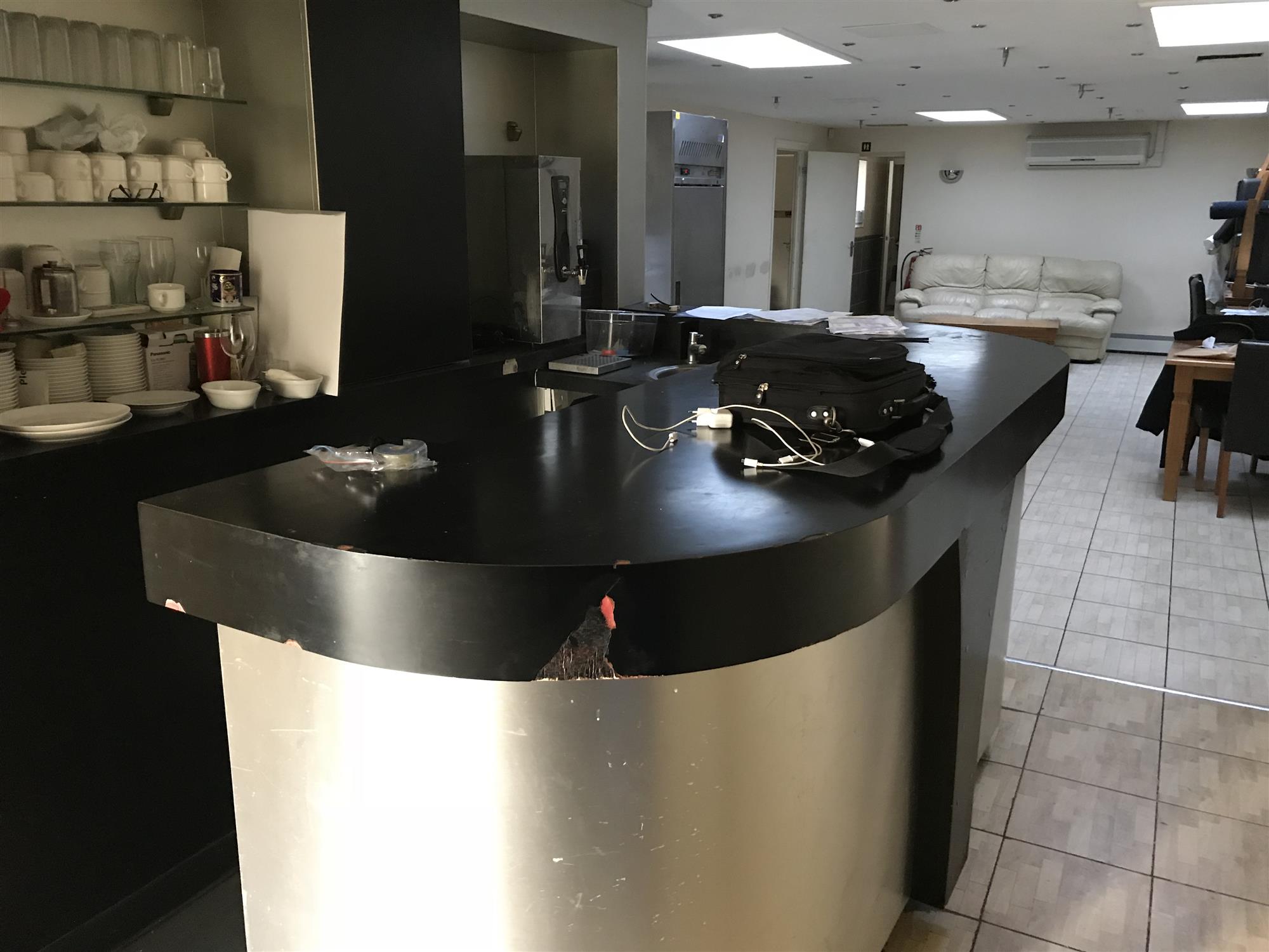 The restaurant area also features a prominent, fully fitted service counter with internal access through to the main commercial kitchen area.