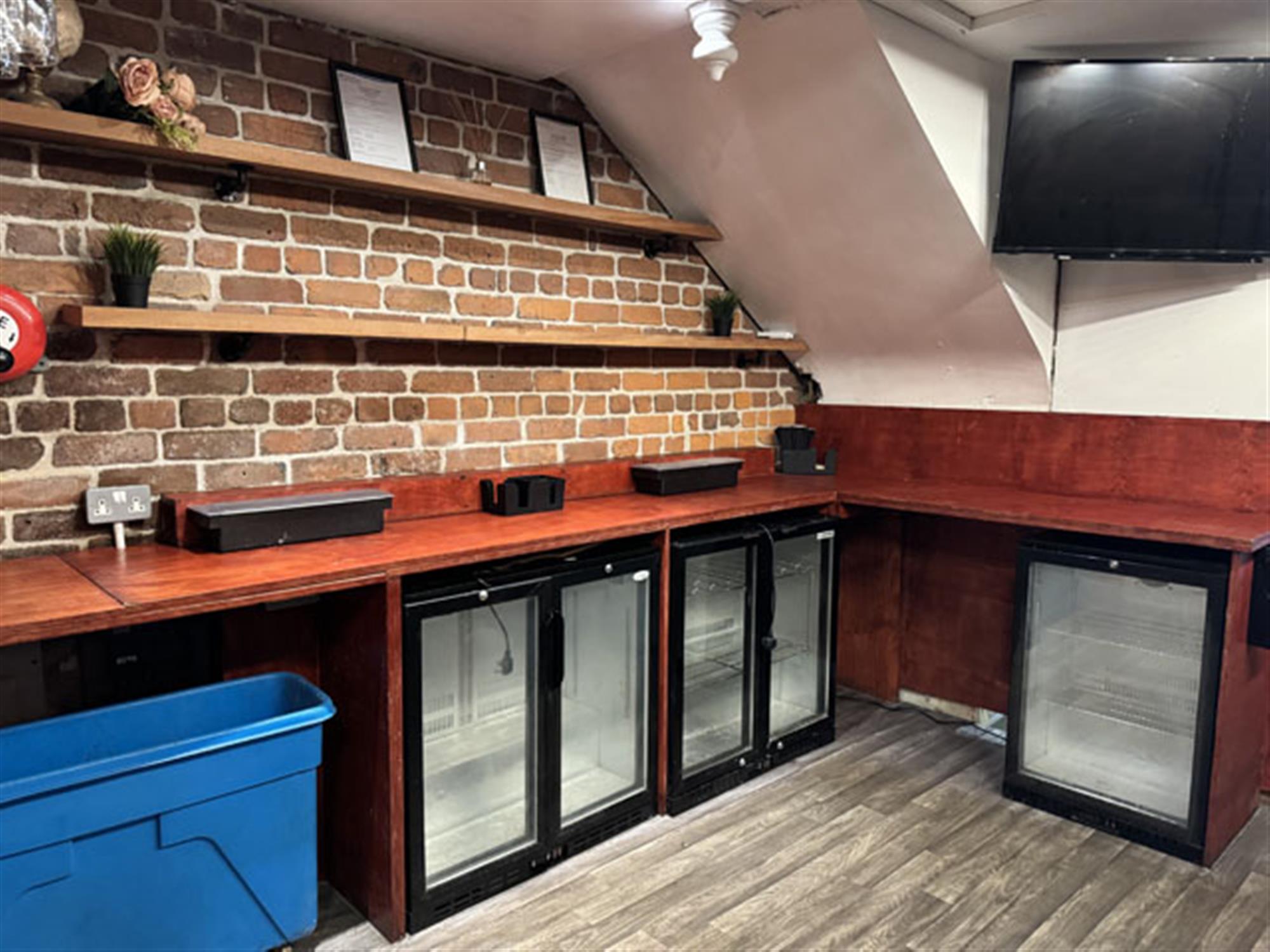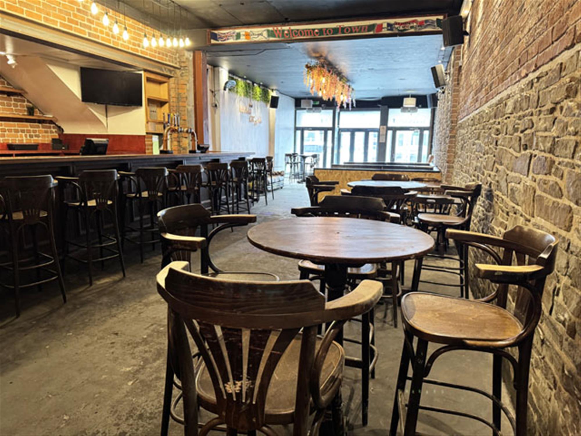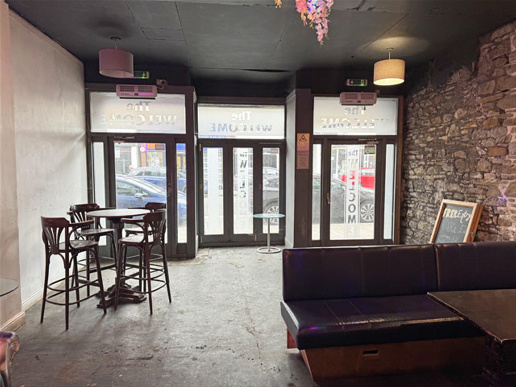 Double door entrance leading into spacious MAIN TRADING AREA having concrete floor and exposed brick and stone walls. Booth and poseur style tables and chairs for approximately 60, with ample room for more standing. Linear wood panel fronted bar counter. Corrugated steel clad DJ booth. LADIES’ and GENTLEMEN’S TOILETS. Large STORE and COMMUNICATIONS ROOMS. CELLAR.