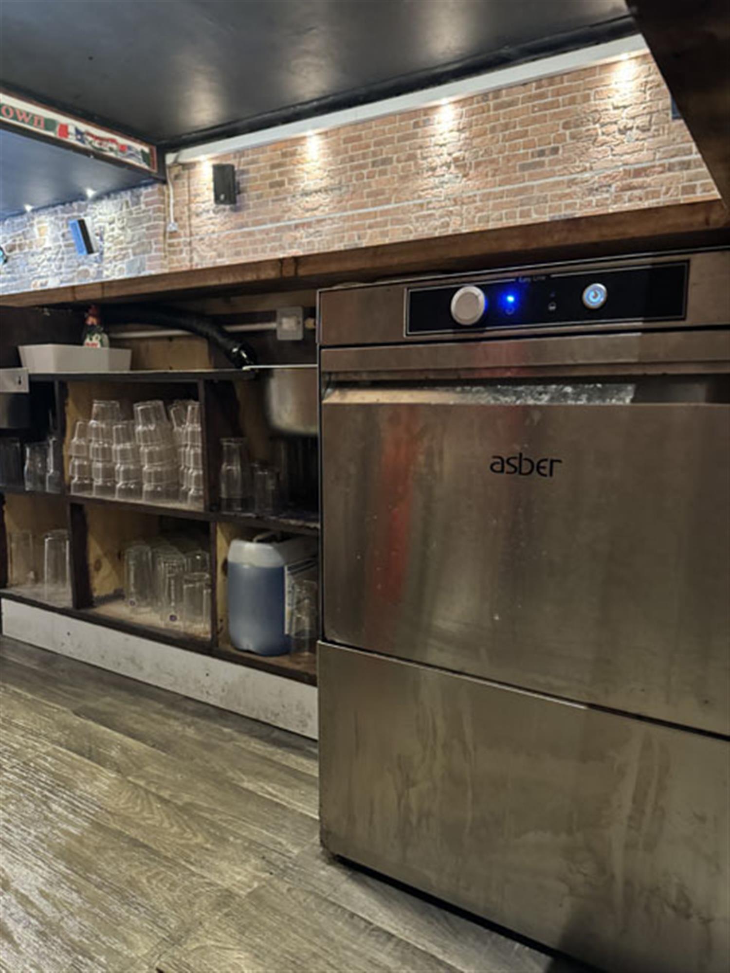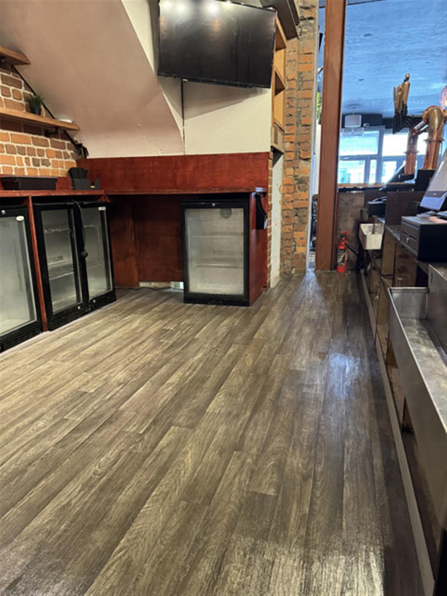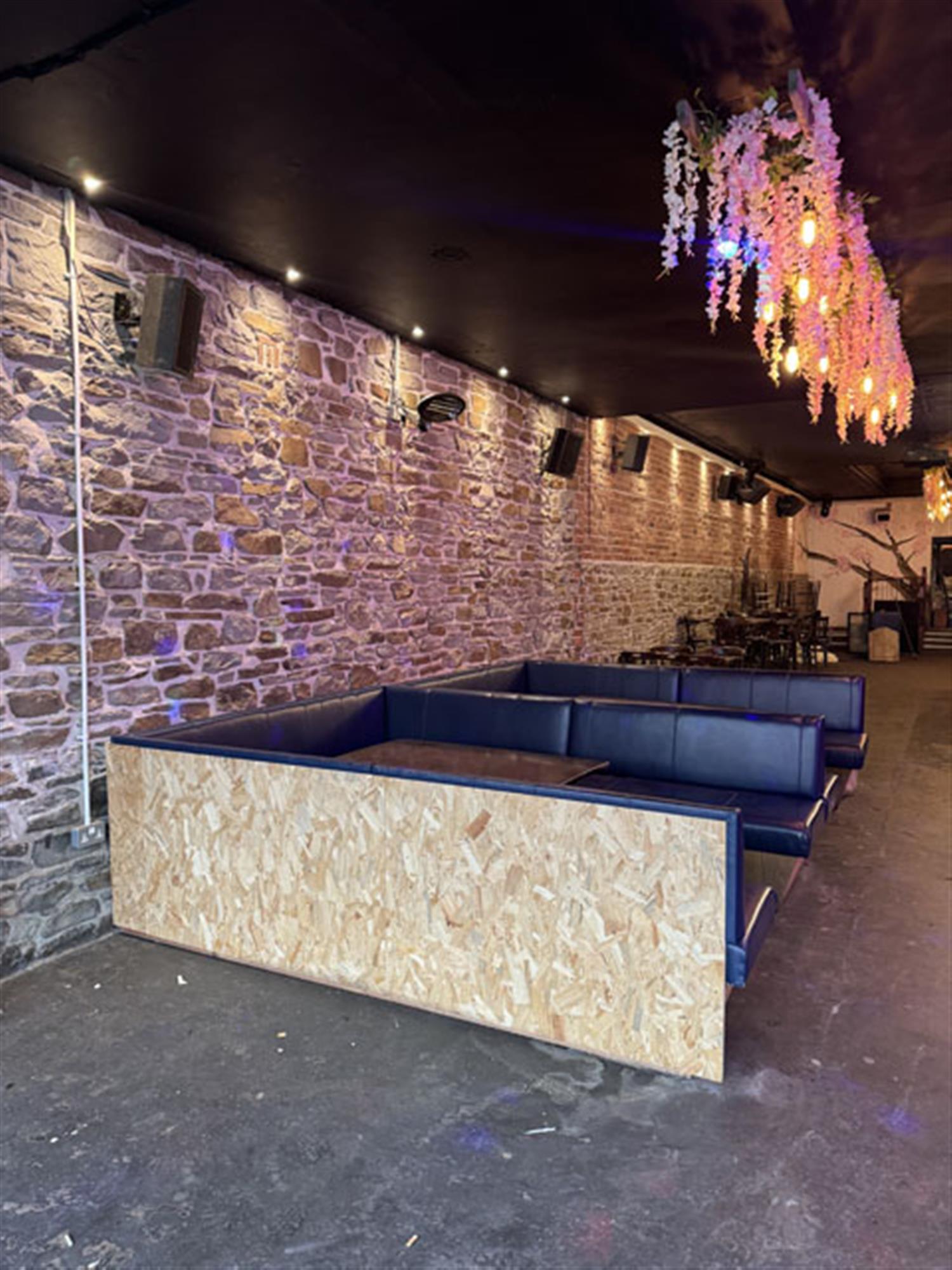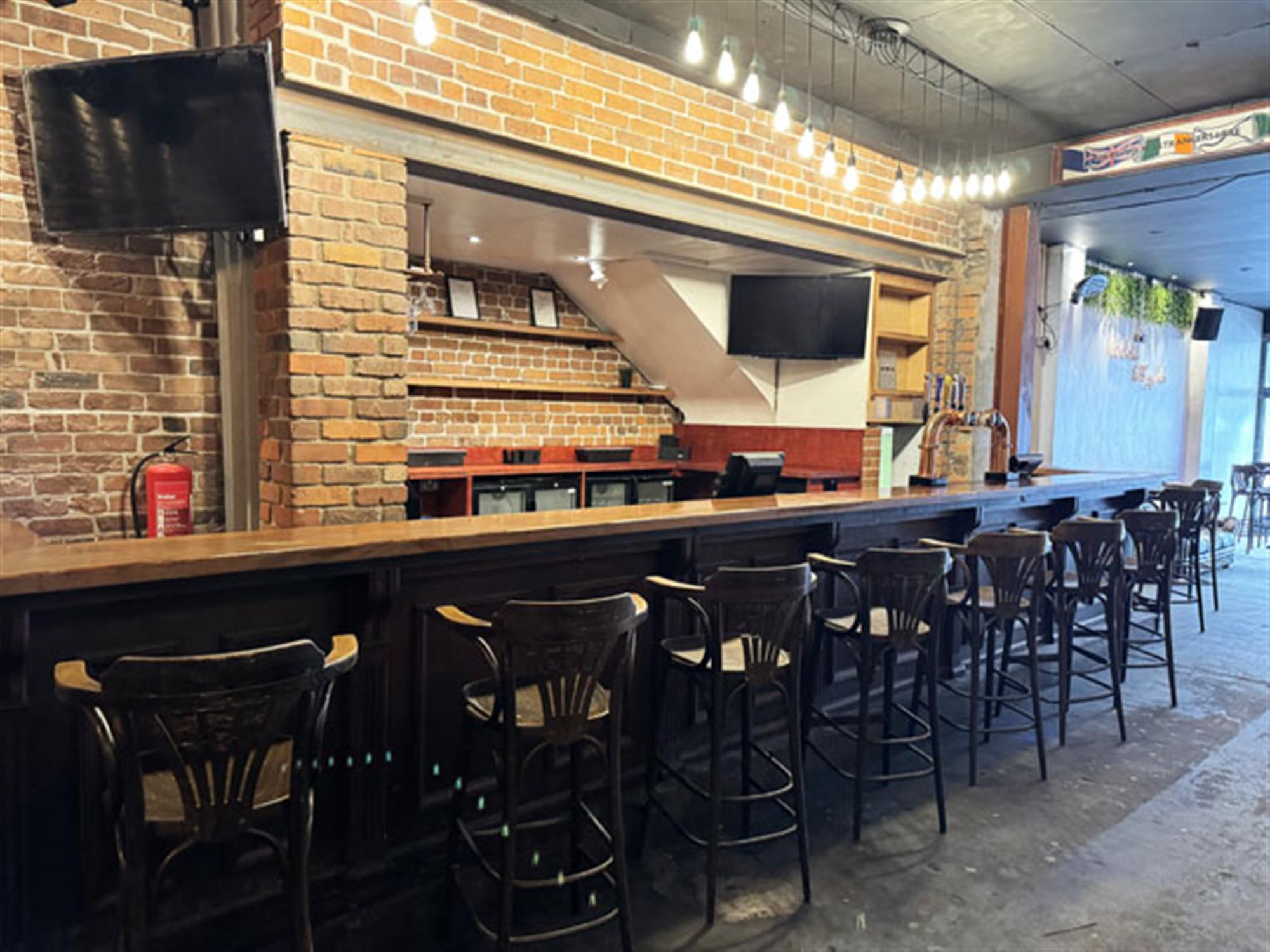 Double door entrance leading into spacious MAIN TRADING AREA having concrete floor and exposed brick and stone walls. Booth and poseur style tables and chairs for approximately 60, with ample room for more standing. Linear wood panel fronted bar counter. Corrugated steel clad DJ booth. LADIES’ and GENTLEMEN’S TOILETS. Large STORE and COMMUNICATIONS ROOMS. CELLAR.