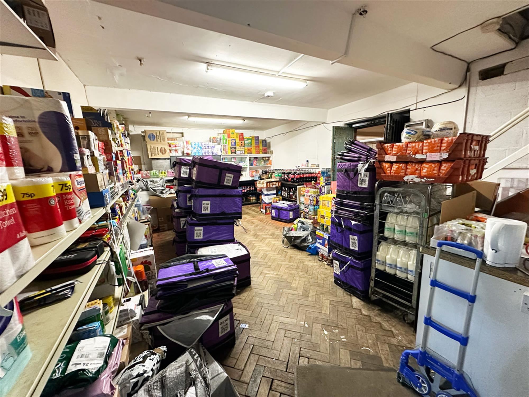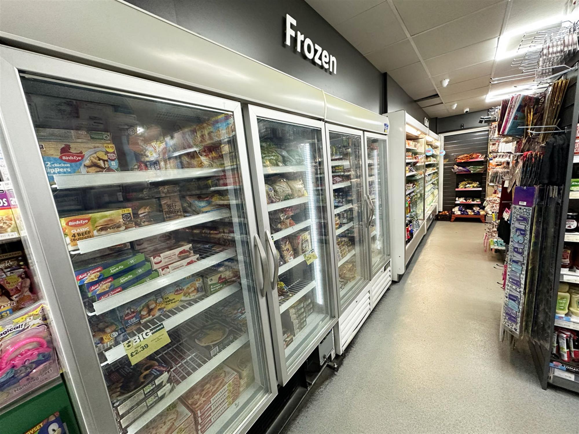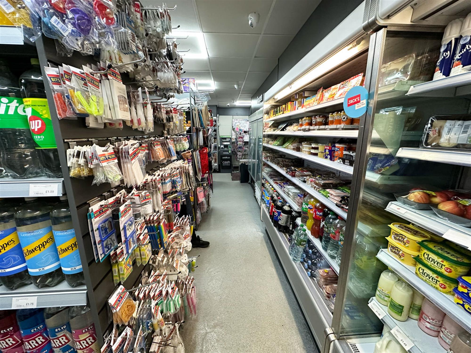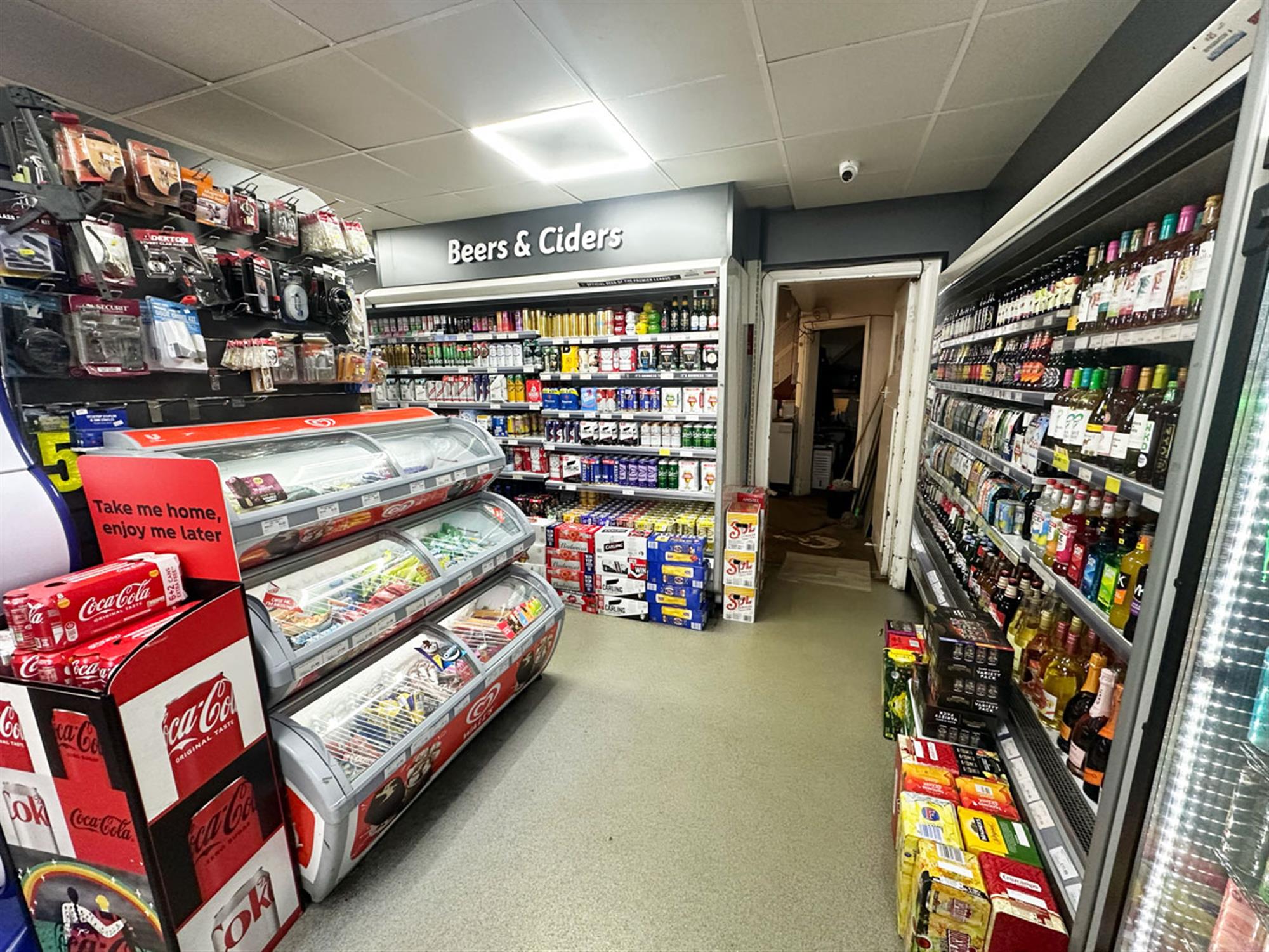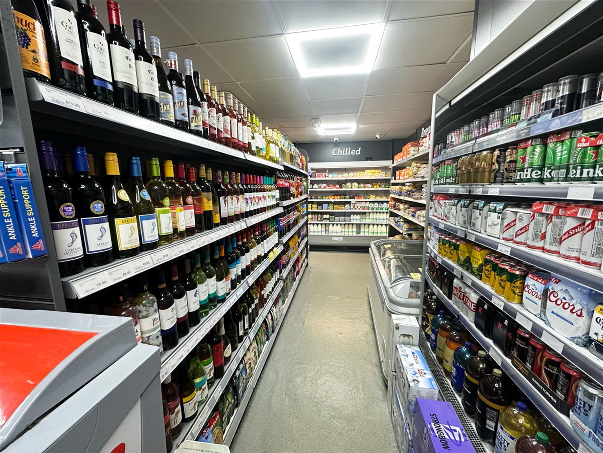 Glass entrance to long till service area, 4 aisle shop floor, open alcohol chiller, 2 fridges, ATM, 2 double built in freezers, 1 open dairy fridge, 1 free standing freezer, one large soft drinks fridge. Large storeroom leading to additional storage space, small office and staff W/C.