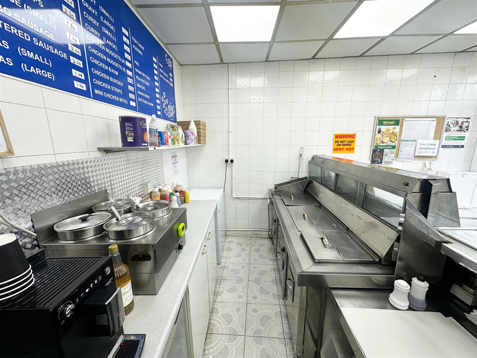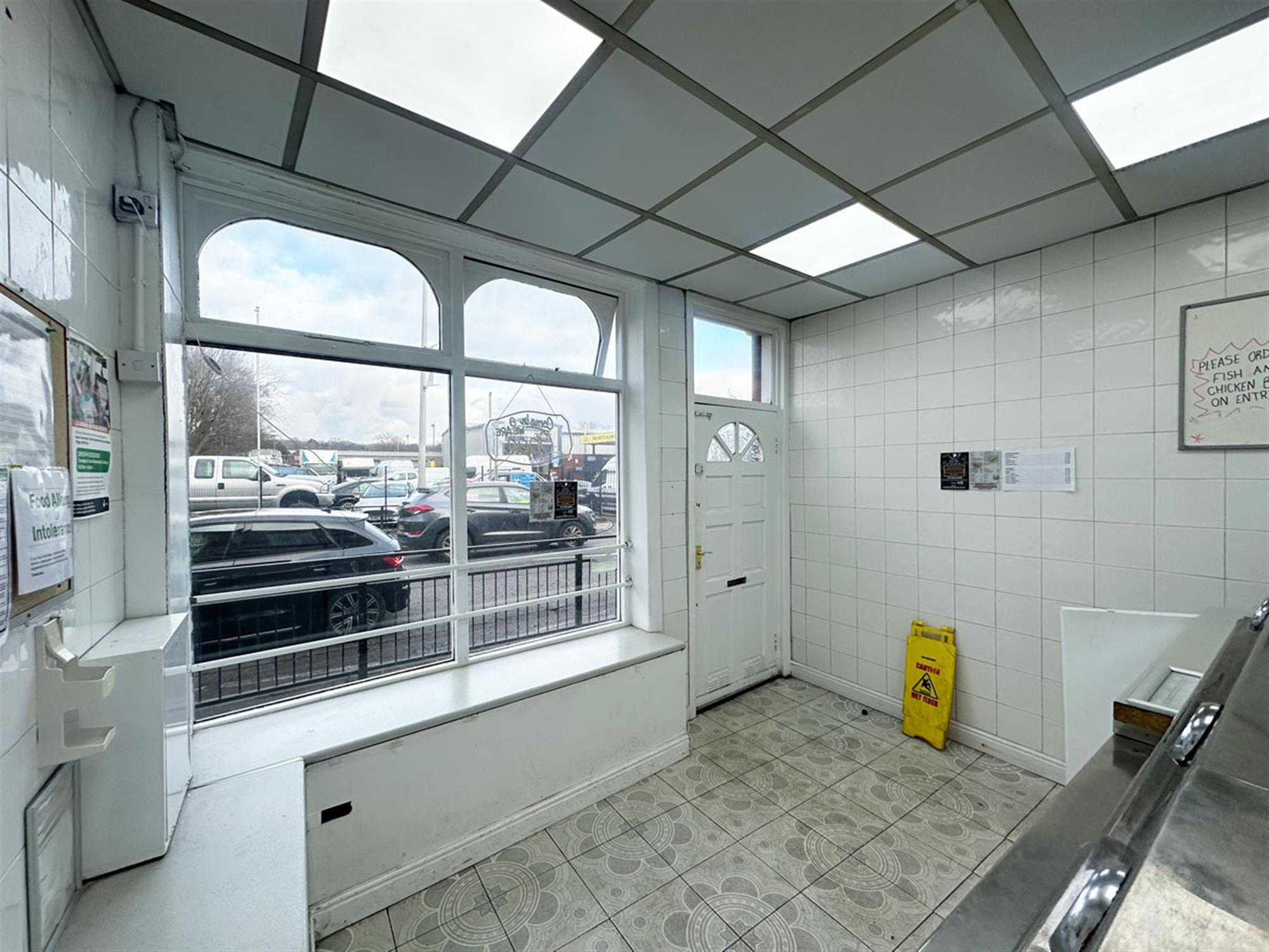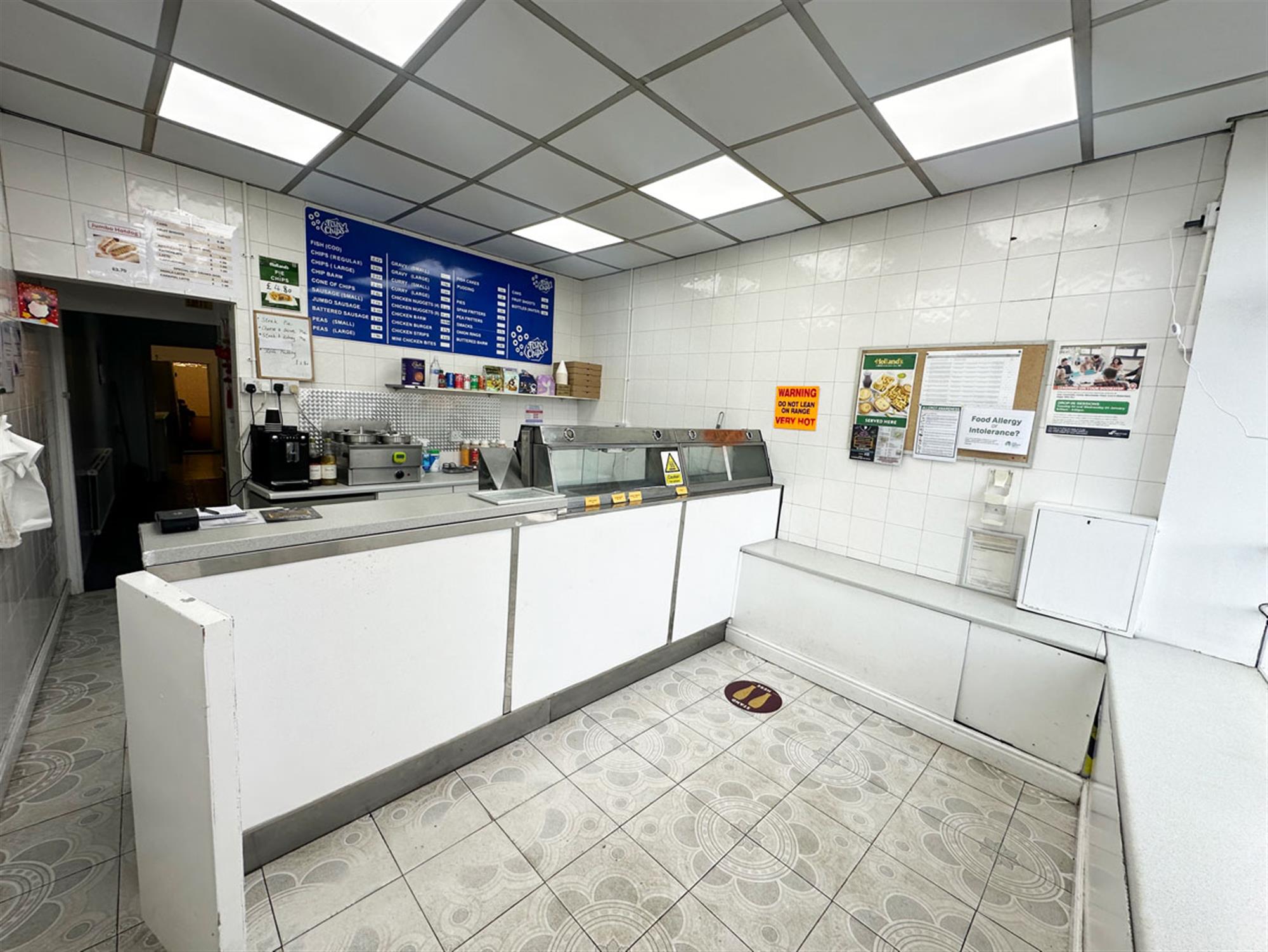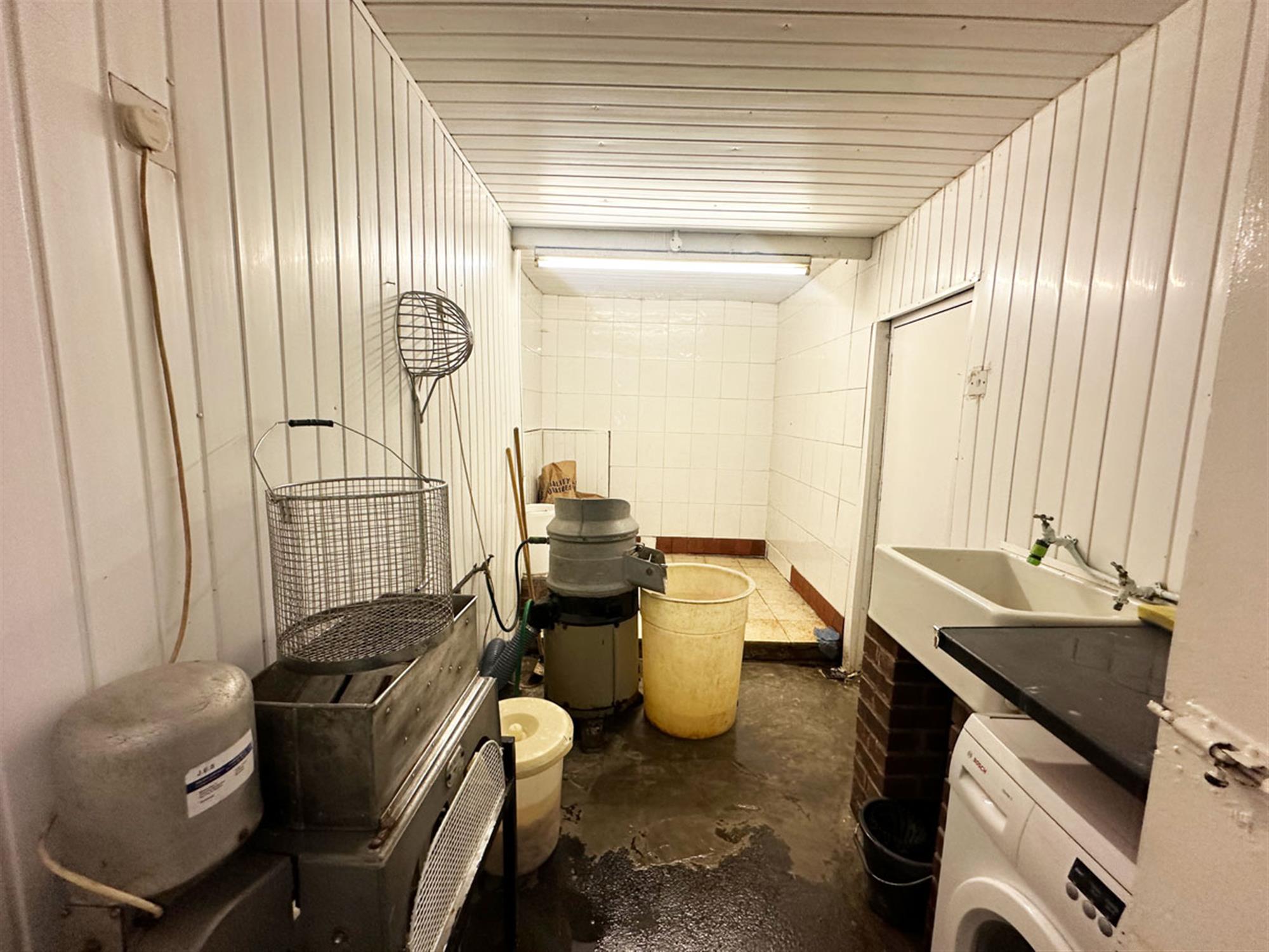 Entrance, ordering/waiting area, service counter, 2 pan 1 scuttle 2 display box range, bain marie, large staff room. Rear kitchen providing washing up area, cold storage, preparation area, 4 burner oven. Rear chipping room with rumbler, chipper & potato store, exit to shared yard, stairs leading to shared W/C.