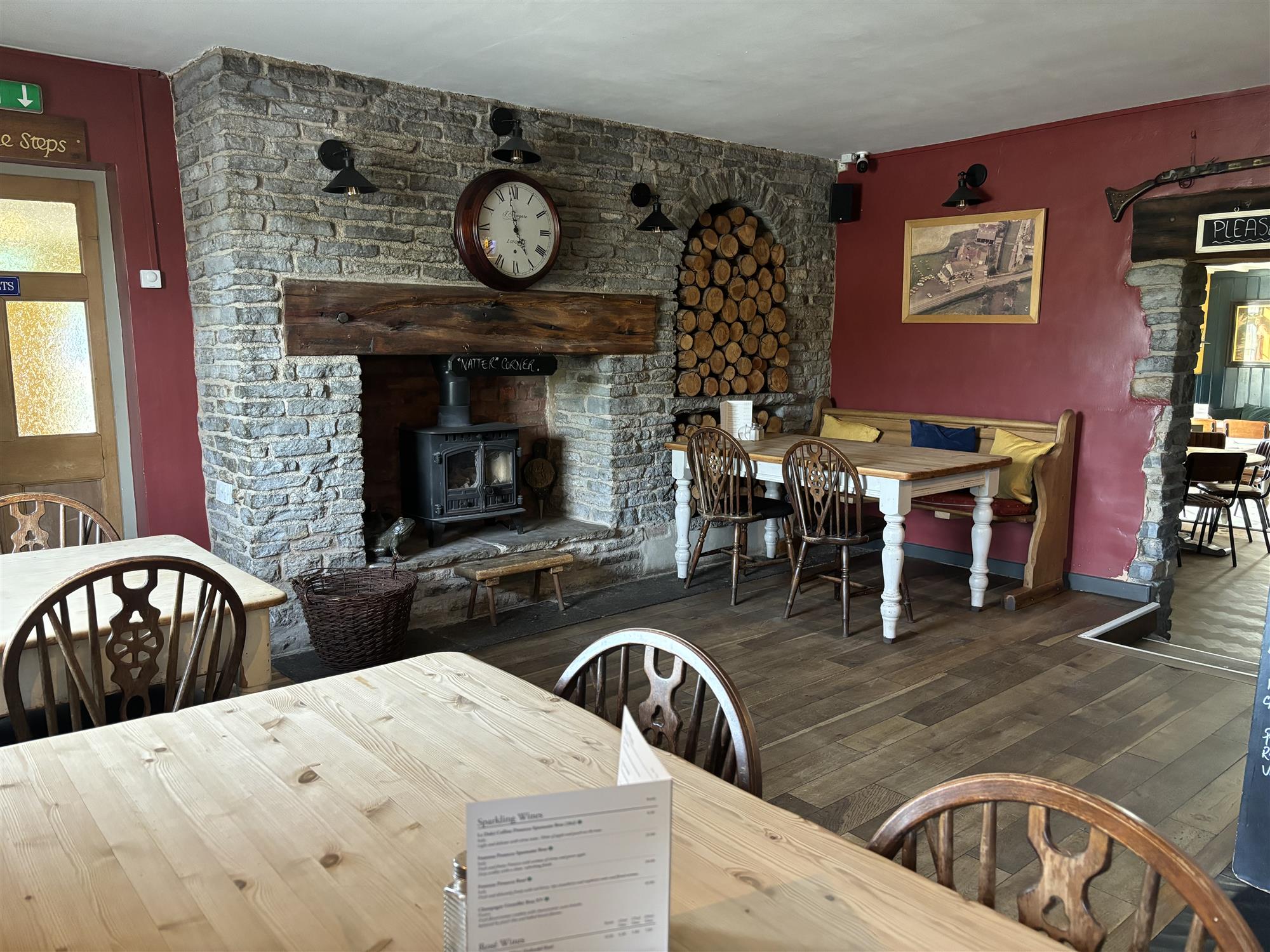 Front entrance into character LOUNGE BAR featuring a central, panel fronted, polished top bar servery with a light wood back bar dresser. The lounge bar is presented with a mix of wooden floorboards and quarry tile flooring, ceiling timbers, exposed stone walls, wall panelling and a large, feature fireplace with log burning stove. It is furnished with country style tables, chairs and bar stools to seat approximately 35 customers. BOTTLE STORE.