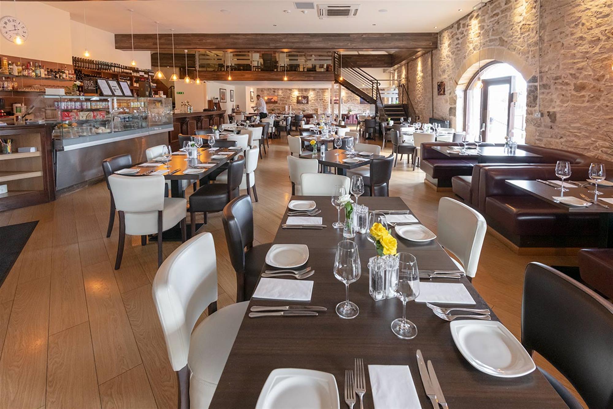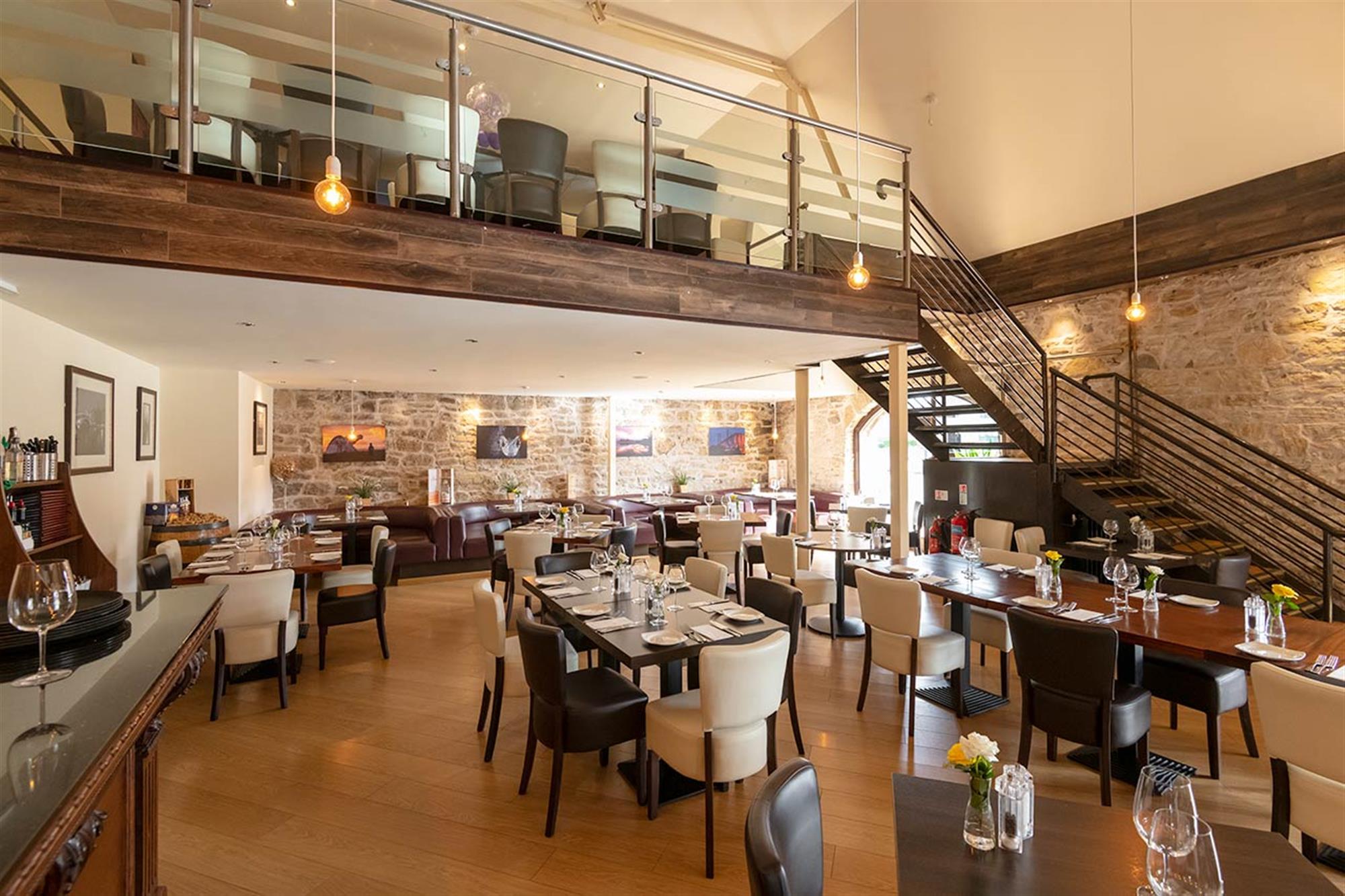 Boasting solid timber flooring and exposed timber and stonework, the reception area, in turn, opens onto the main, delightfully appointed customer service and fine dining area with feature spotlighting, baby grand piano for music entertainment purposes, stylish mix of loose and fixed upholstered furnishings for approximately 120 covers, including a number of intimate seating booths, glazed French door access to the external dining terrace and feature open dog-leg staircase access to a large and equally well furnished gallery-style MEZZANINE LEVEL dining area providing approximately 40 additional covers.