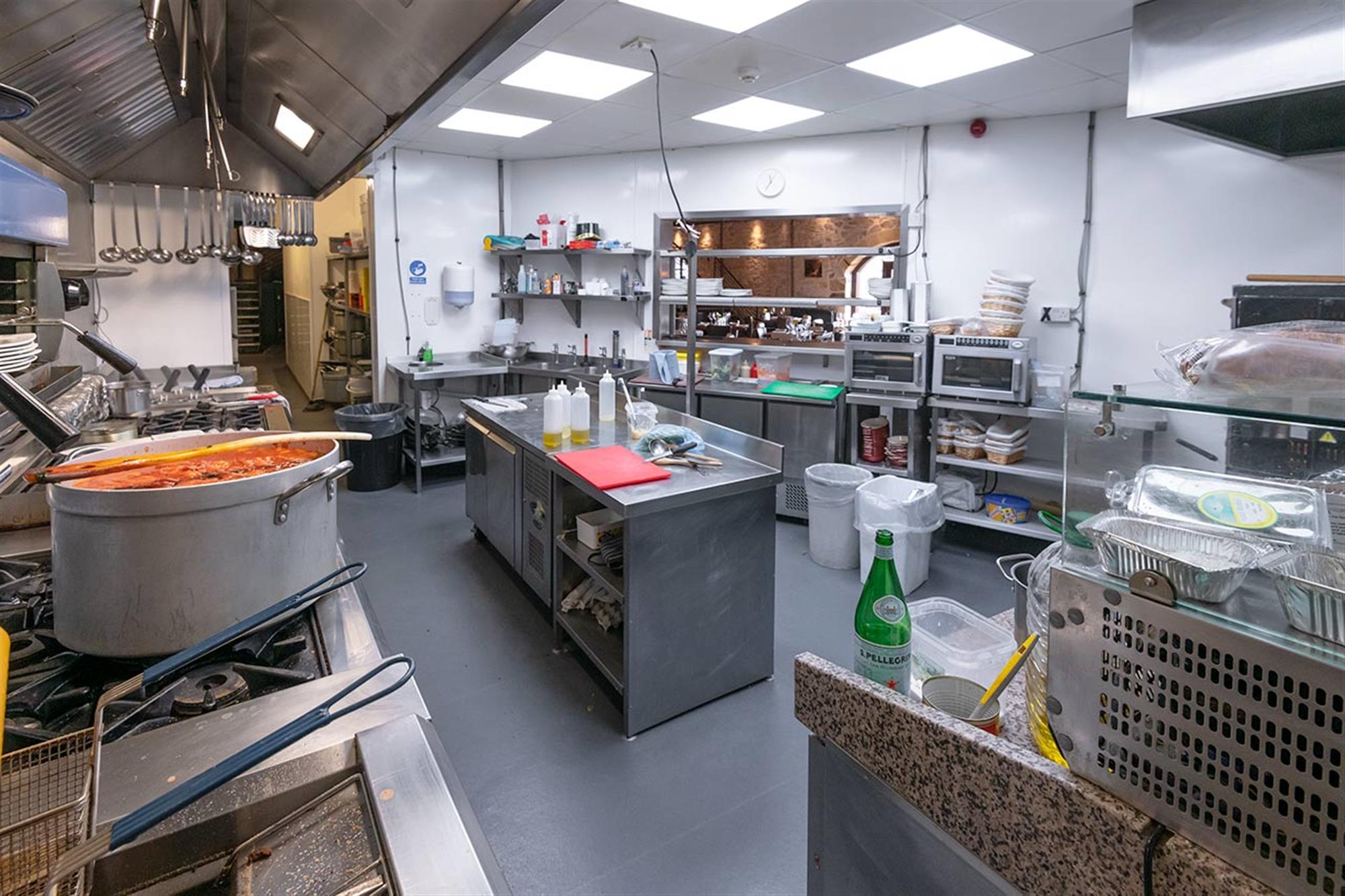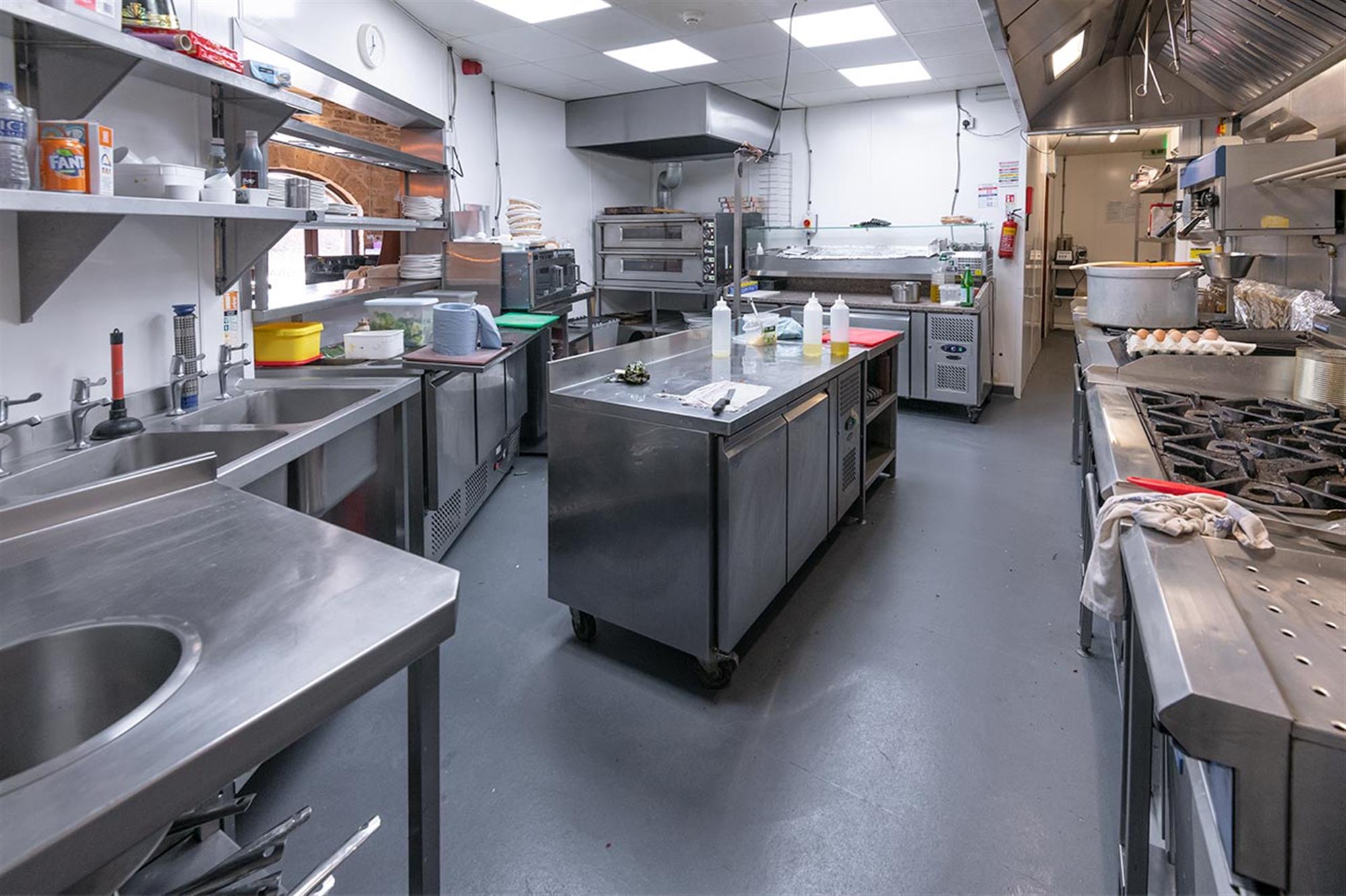 The main kitchen houses ample stainless-steel work surfaces, storage units, a fully equipped preparation/washing-up kitchen area with fitted sink units and separate fitted washbasin and a full range of high quality, industry standard stainless-steel catering appliances including commercial pizza oven with pizza topping preparation counter and various hobs, ovens, griddles, mixers and refrigerator storage units etc., all of which we understand is to be included in the sale price and further details of which will be available upon request to any genuine interested parties.