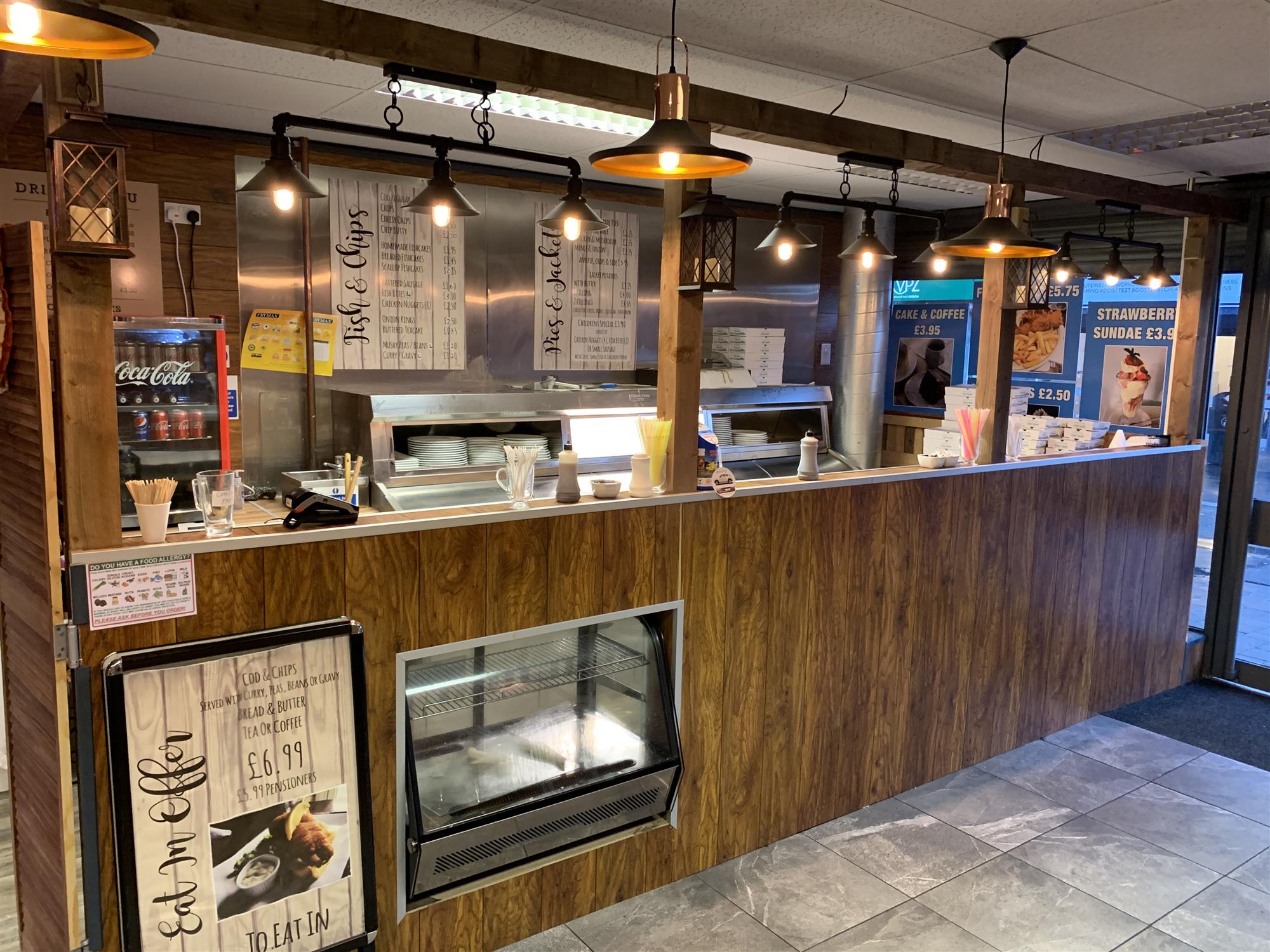 The main public area also features a fully fitted, timber-built food serve-over counter with feature suspended overhead lighting, tiled flooring surround, glass-fronted built-in food display unit, glass-fronted and refrigerated soft drinks display unit, electronic till/food ordering point and a fully equipped and 5-Star hygiene rated open “theatre-style” commercial food preparation area with extraction system, stainless-steel back wall for easy cleaning and fitted washbasin.