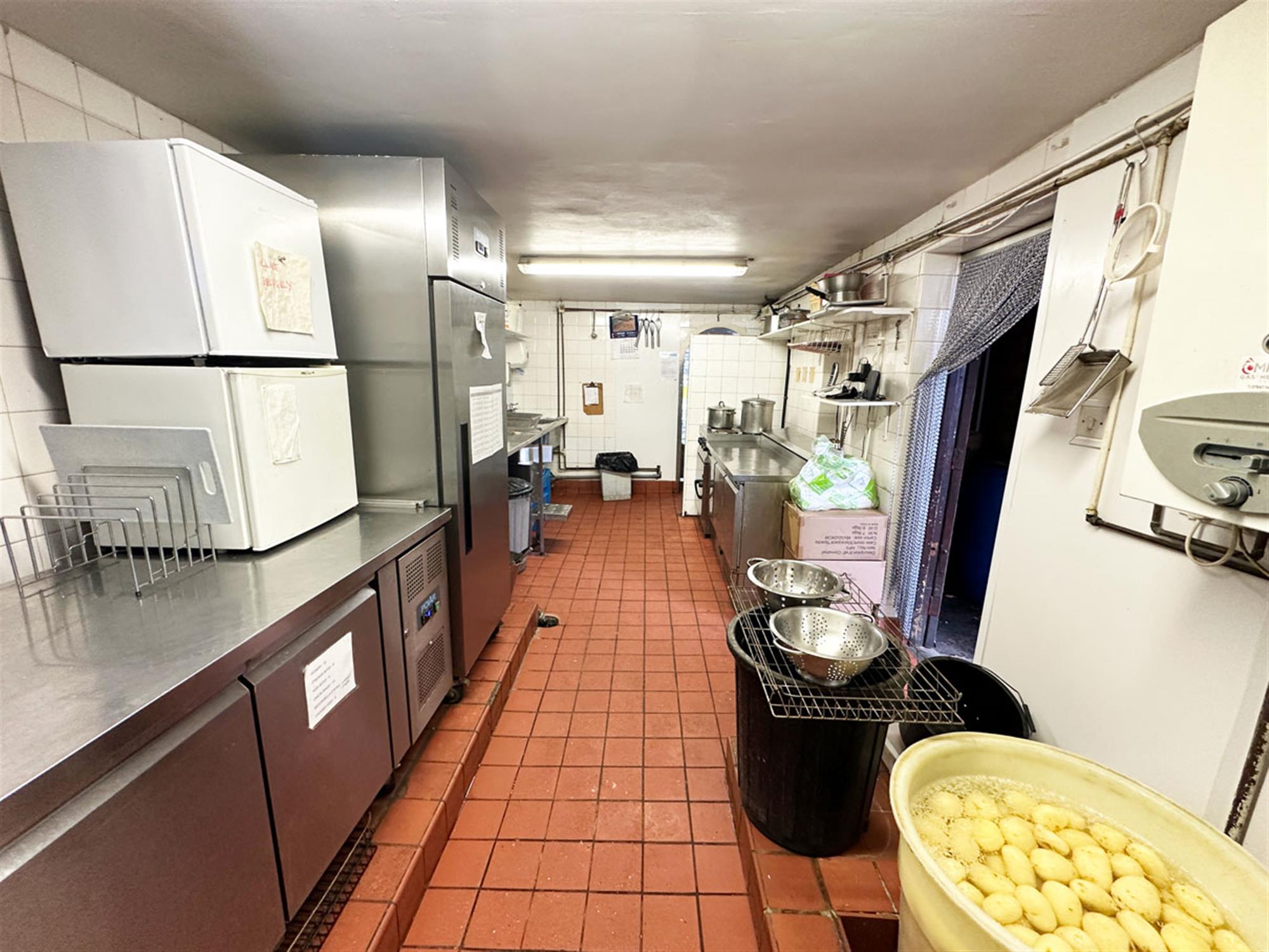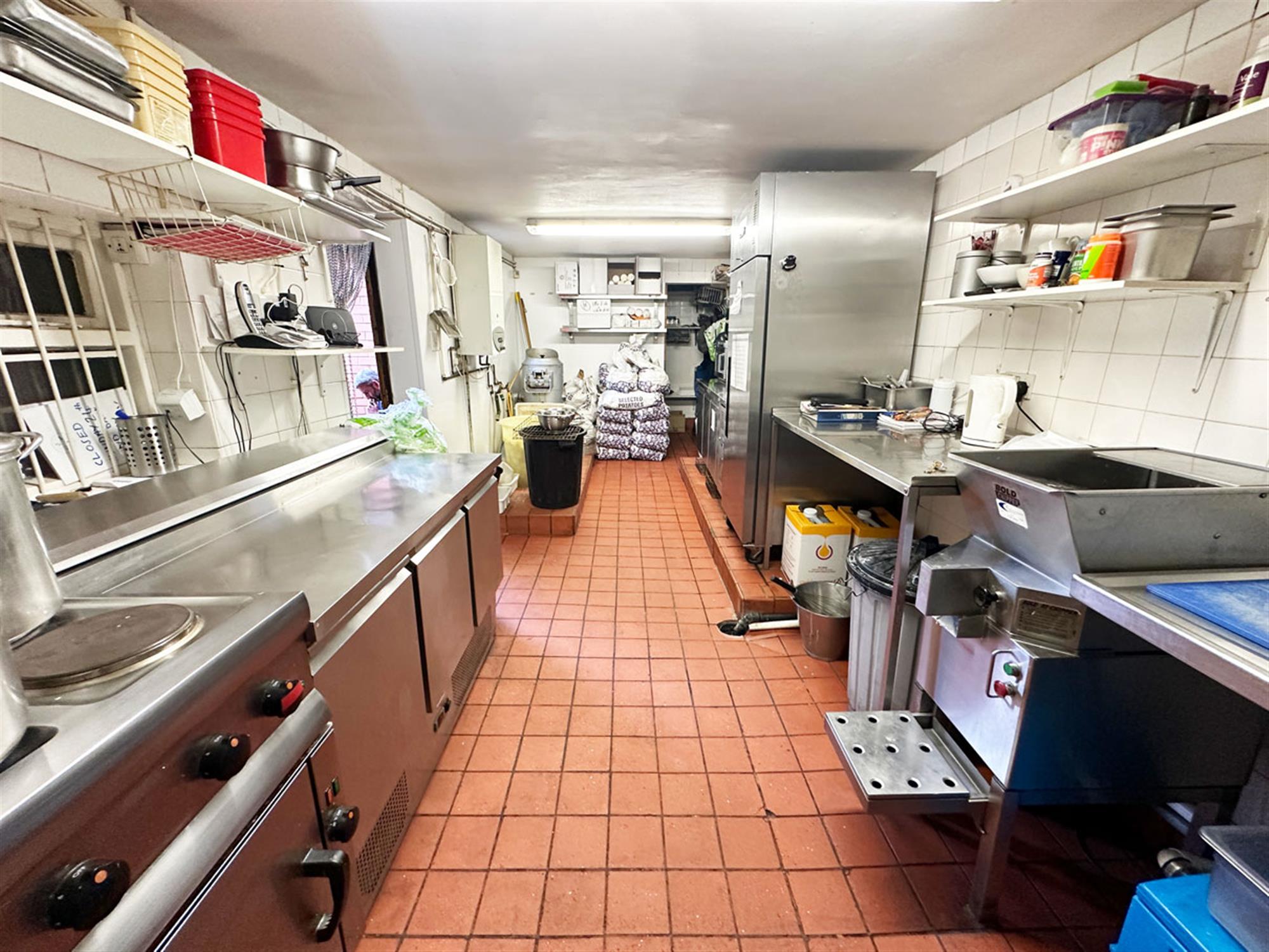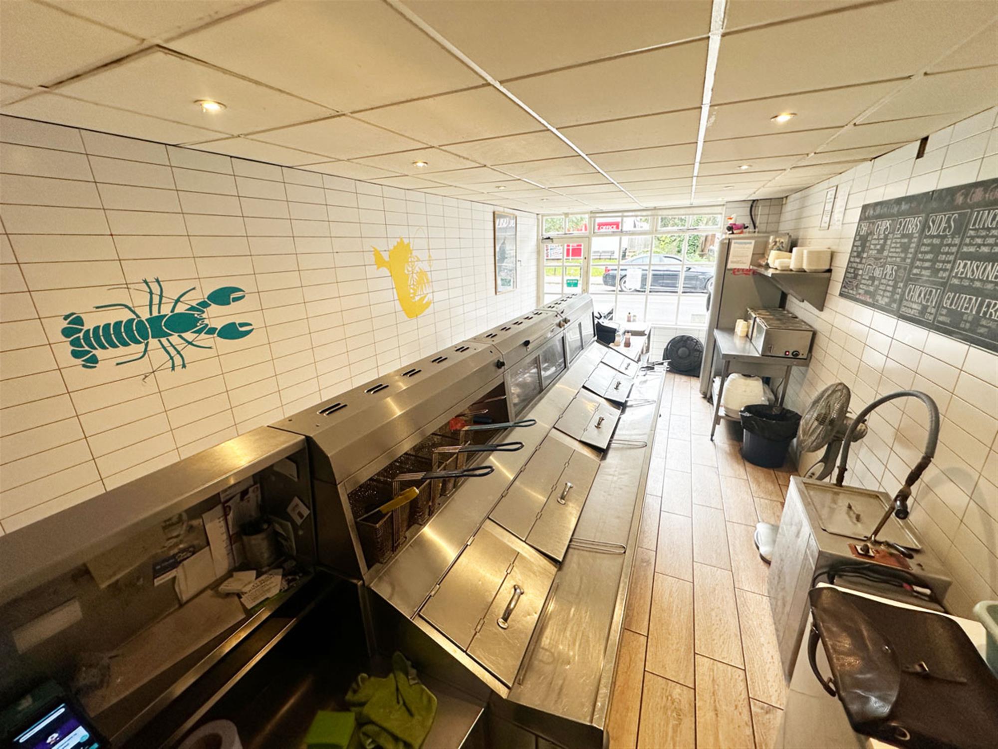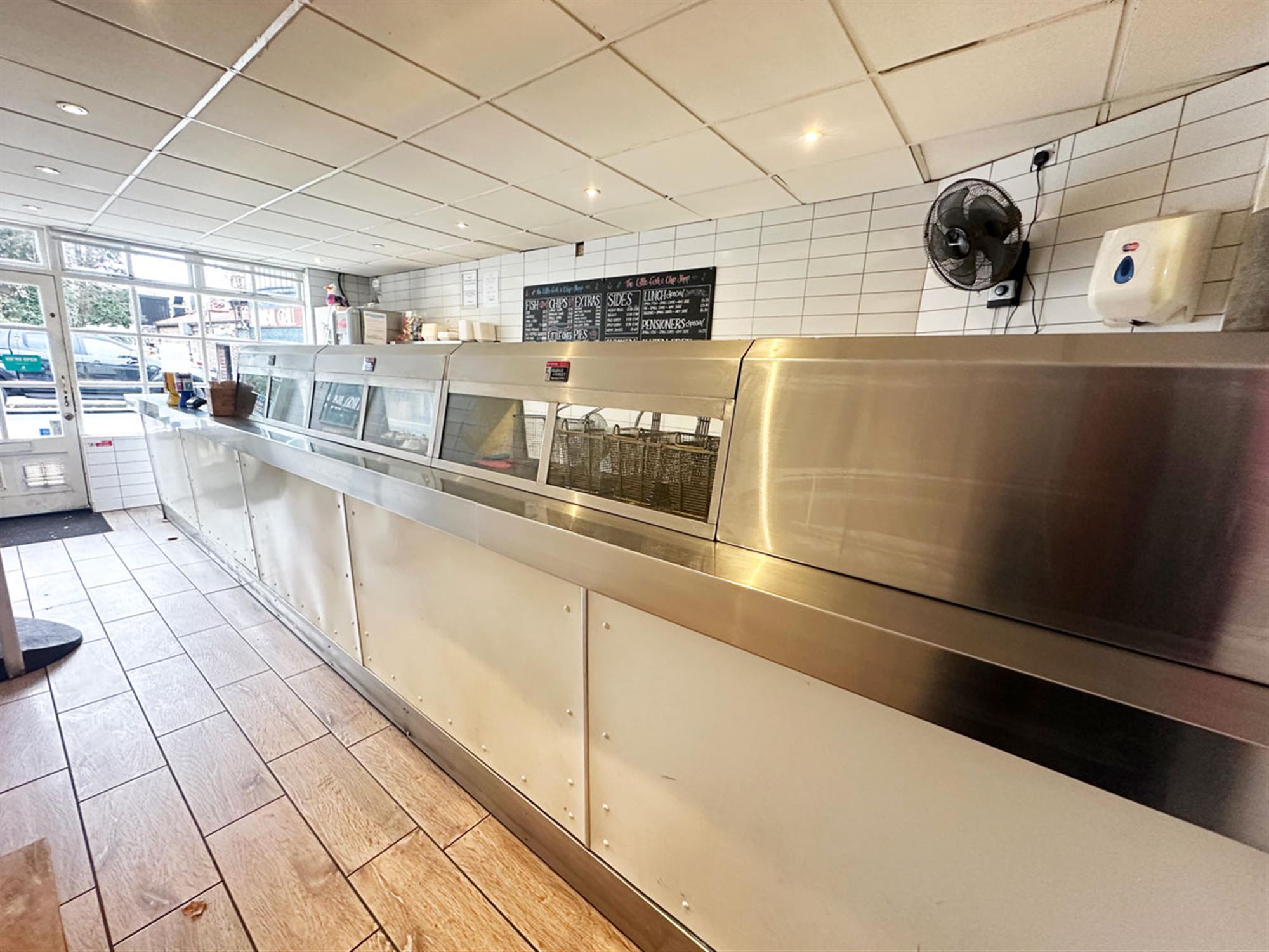 Potential for alfresco seating for 6, entrance, ordering/waiting area, large service counter with till point, 3 pan, 2 scuttle, 3 display box range, 2 bain marie, large rear kitchen with 4 burner oven, washing up area, preparation area, chipper, rumbler, potato store area, cold storage, staff W/C. Exit to bin area, storeroom and 1 owner parking space.