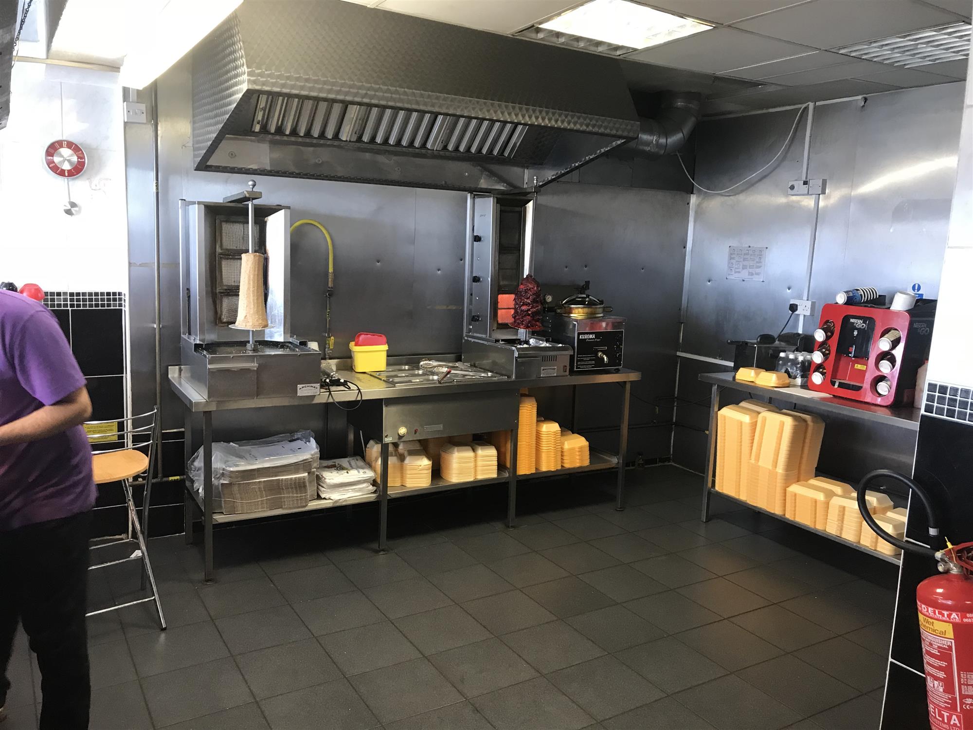 The main food preparation area houses a full range of well maintained, industry-standard stainless- steel catering appliances including 2 x kebab burners, pressure fryer, 4-pot bain marie and hot drinks dispensing machine etc., all of which we understand is to be included in the sale price and further details of which will be made available upon request to any genuine interested parties.
