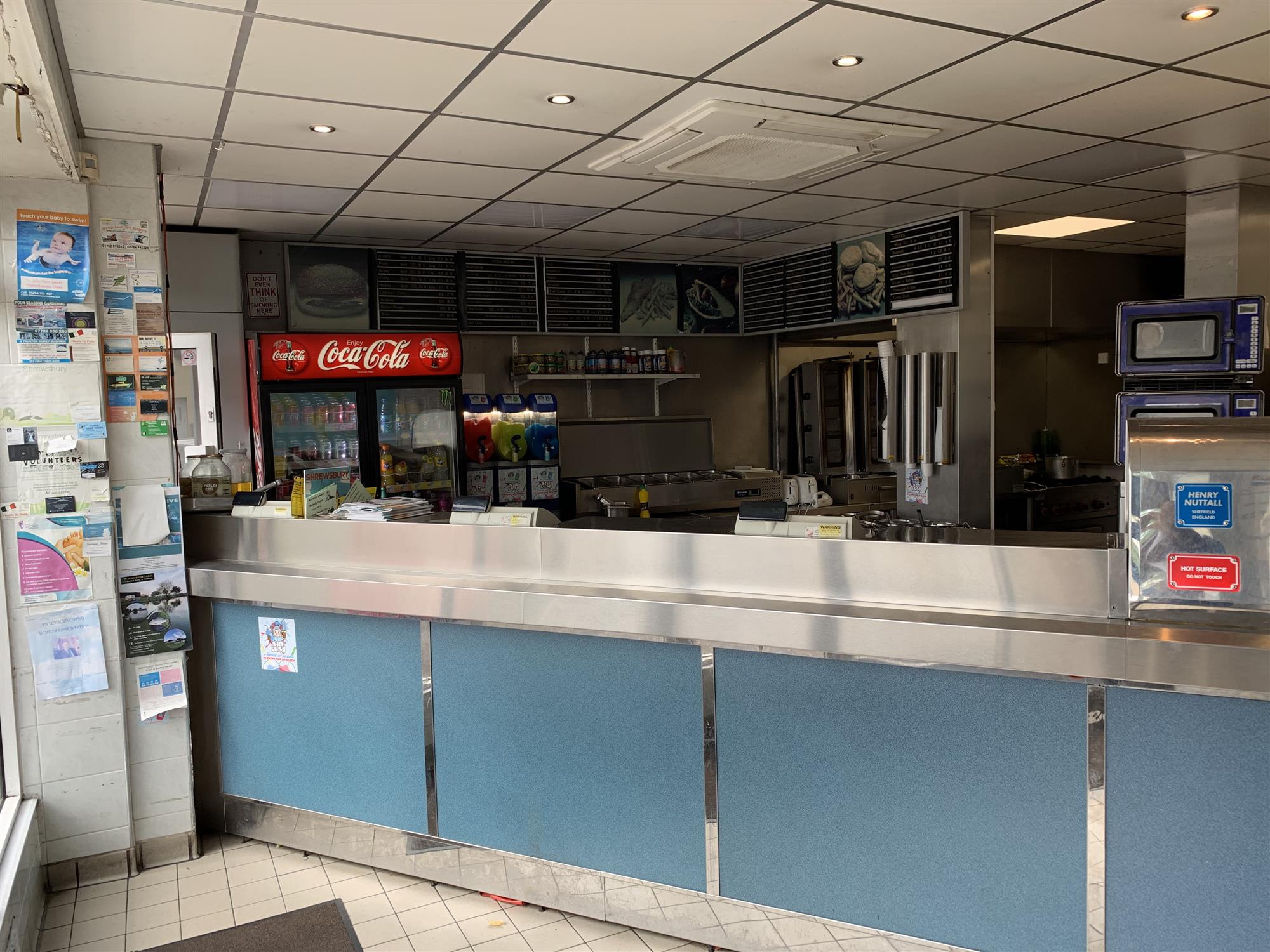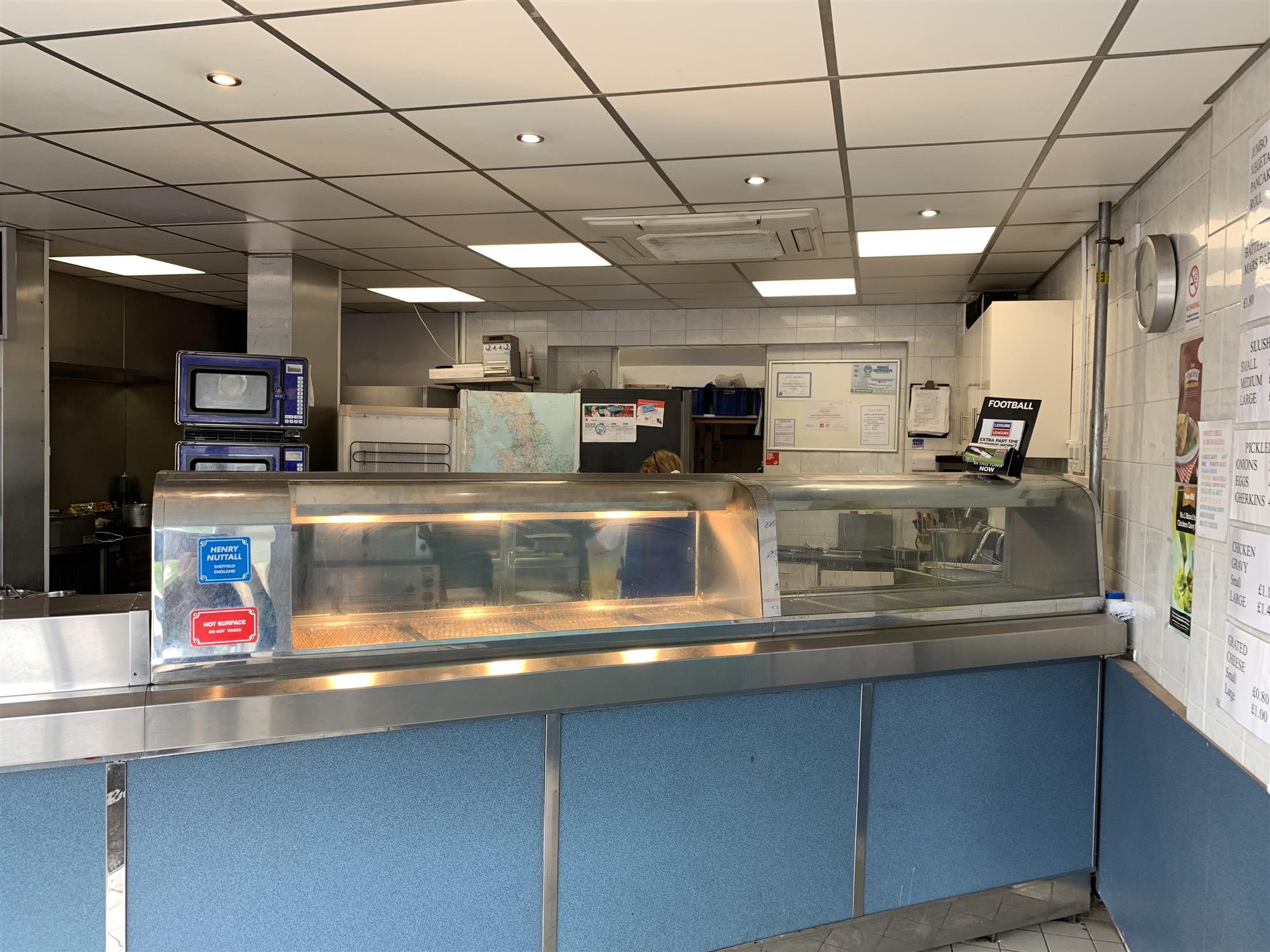 The main public area also features a fully fitted, full-length and stainless-steel-topped food serve- over counter with well maintained, built-in stainless-steel frying range with hot top boxes, a large, glass-fronted and refrigerated soft drinks display unit, “Slush Puppy” machines, electronic till/food ordering point and open access to an extensively equipped “theatre style” commercial food preparation area with extraction system.