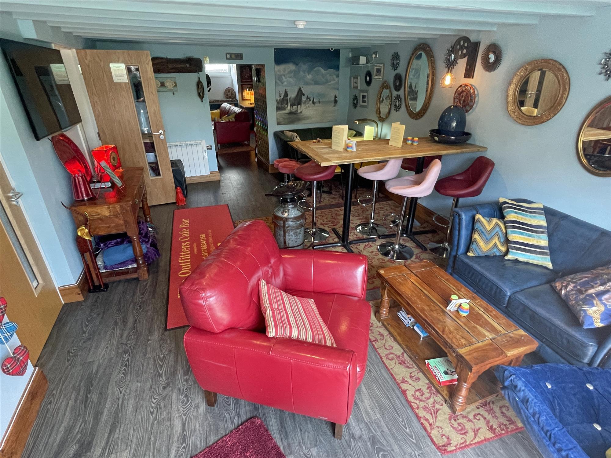 DINING LOUNGE (16) with feature beamed ceiling, TV with satellite sport channels and loose seating which includes a sofa, easy chairs and high bar stools at wooden tables. Bifold doors leading to the exterior terrace. Door to the UNISEX TOILET. DRY STORE.