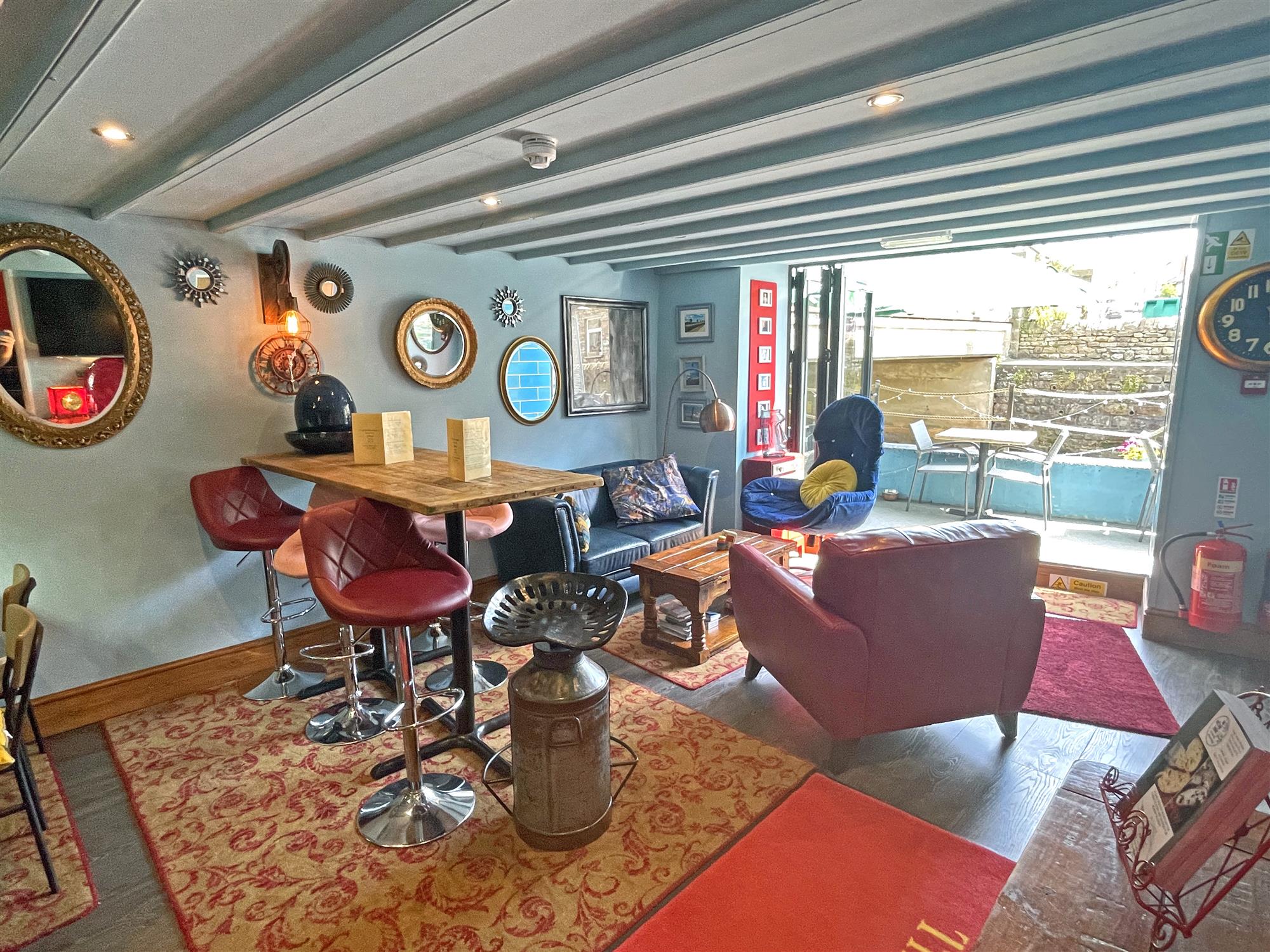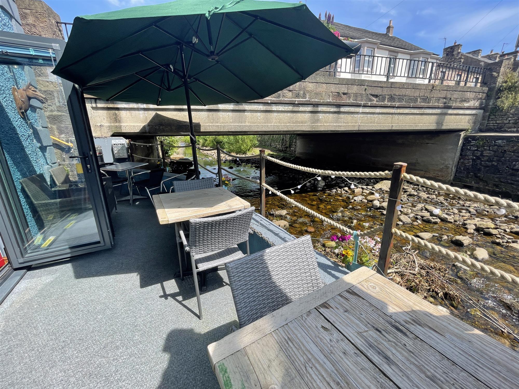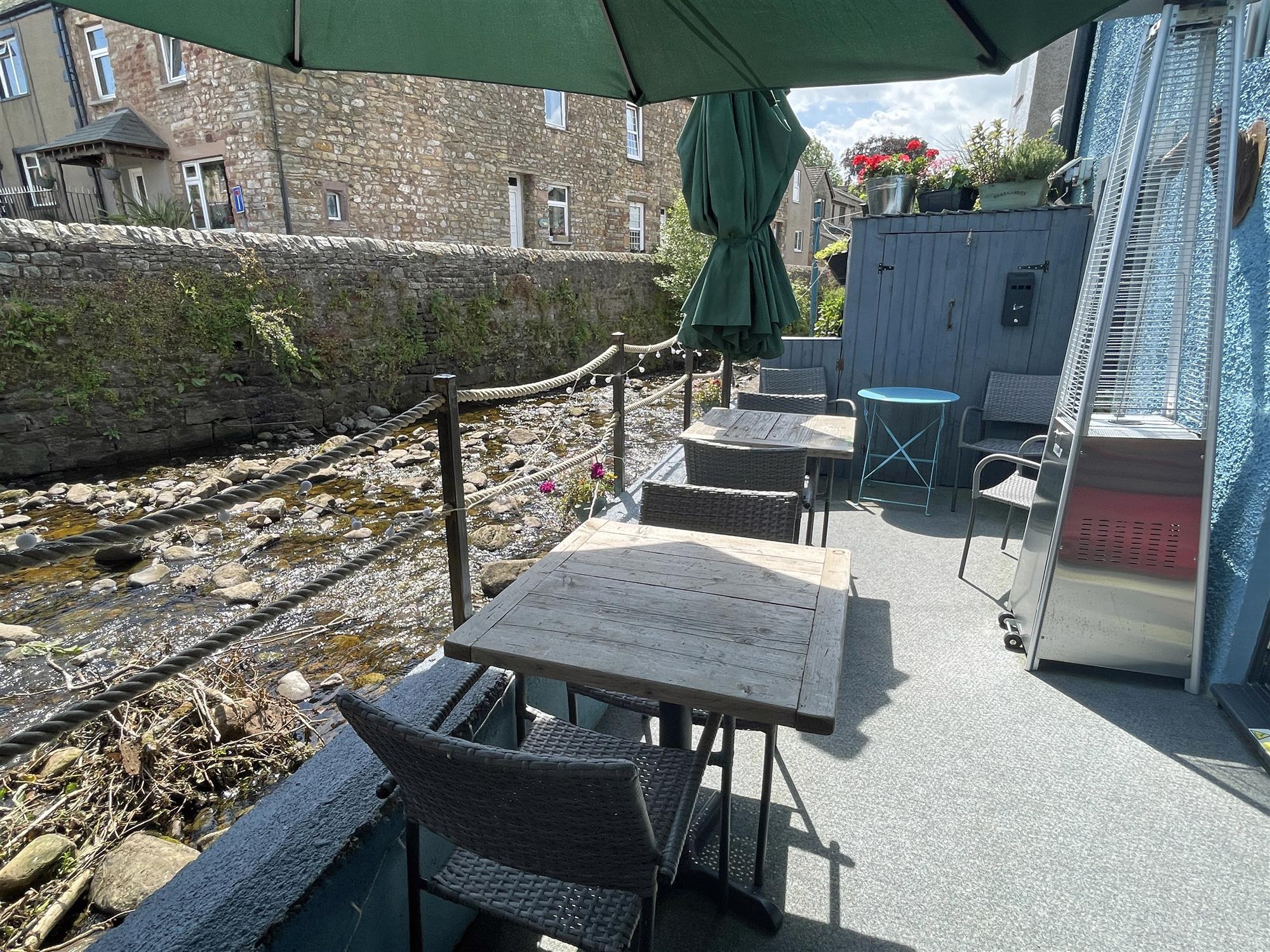 An external TERRACED AREA (14) with outdoor tables with parasols and chairs is situated overlooking the Beck and accessed via either a stone staircase leading from the front of the premises or the bifold doors from the dining lounge. There is also external seating for 10 on ground floor level at the front of the property.