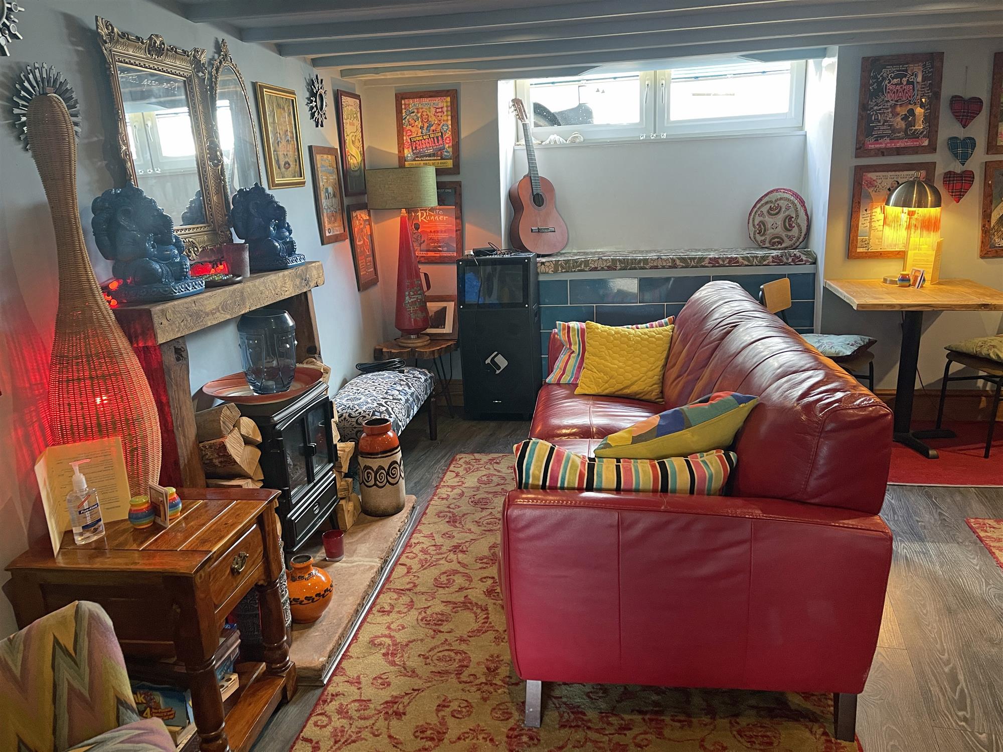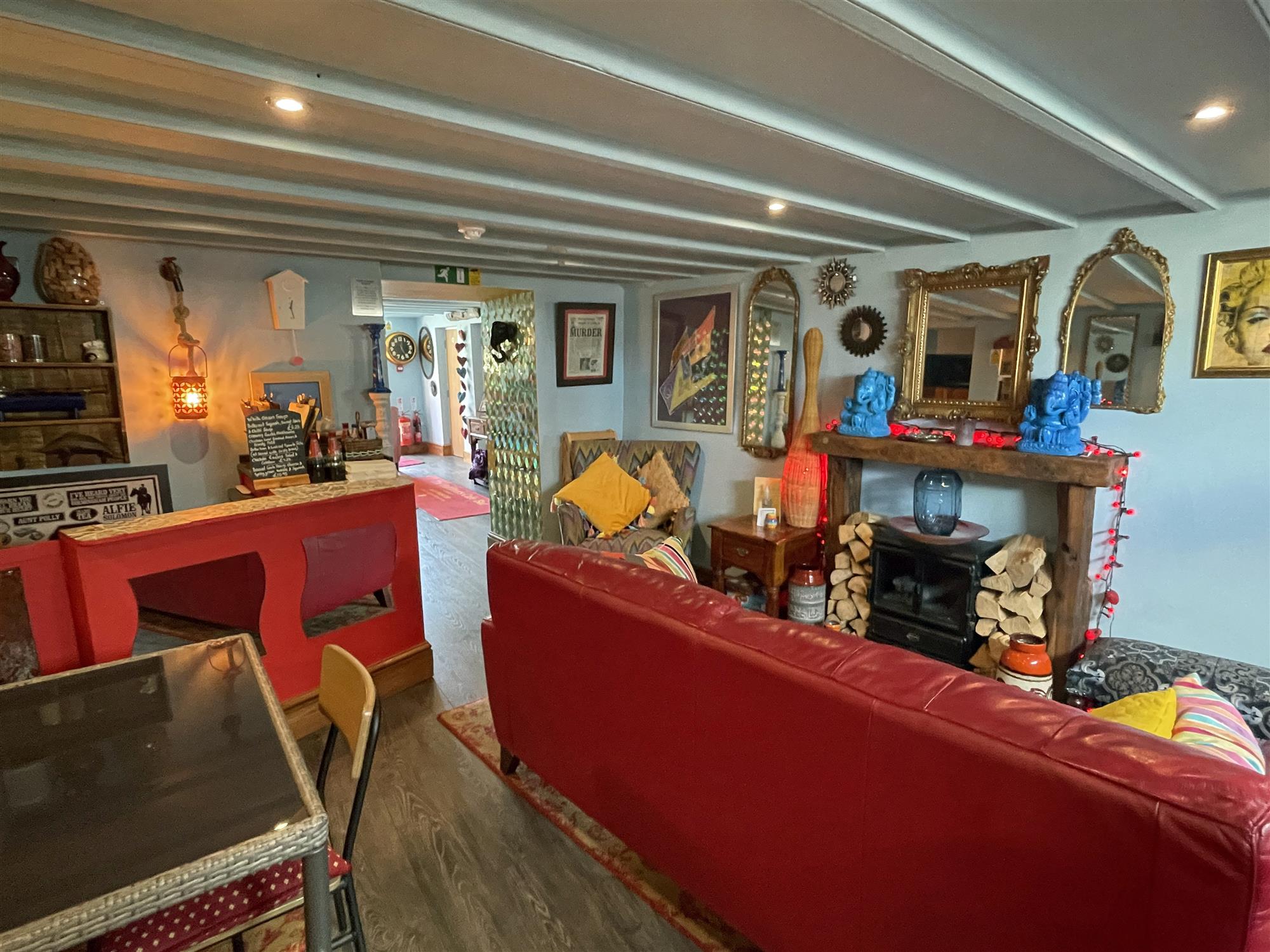 Cosy MUSIC ROOM (10) with feature beamed ceiling, wood fireplace with log burner inset, loose seating which includes a leather sofa and wooden chairs to wooden tables, and BAR SERVERY with under bench fridge. STORAGE ROOM.