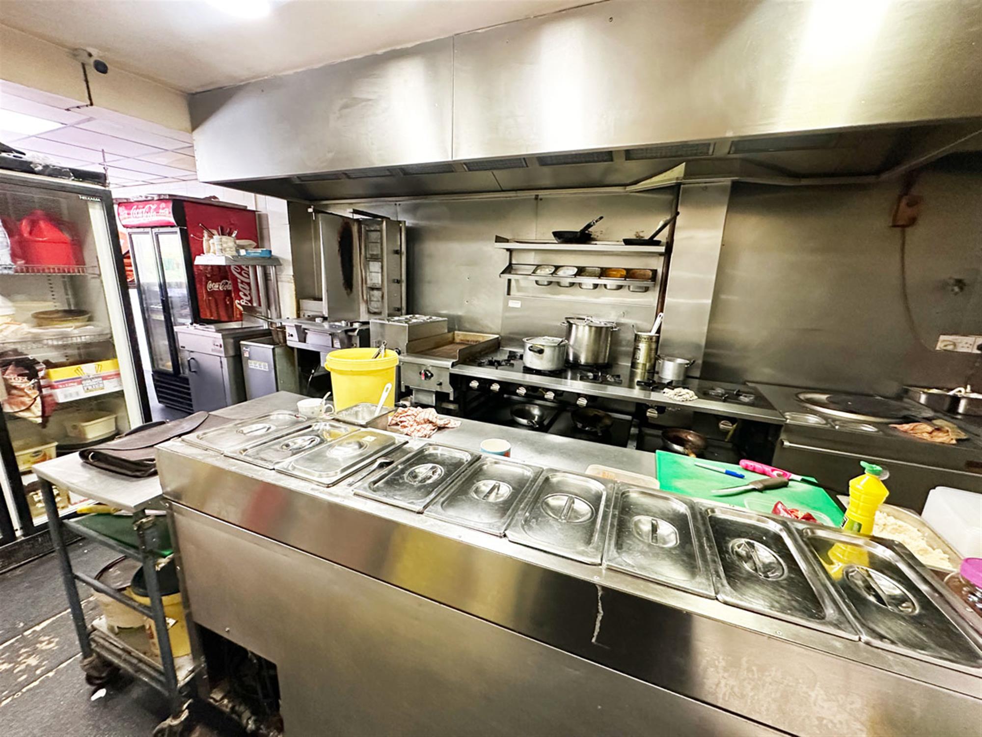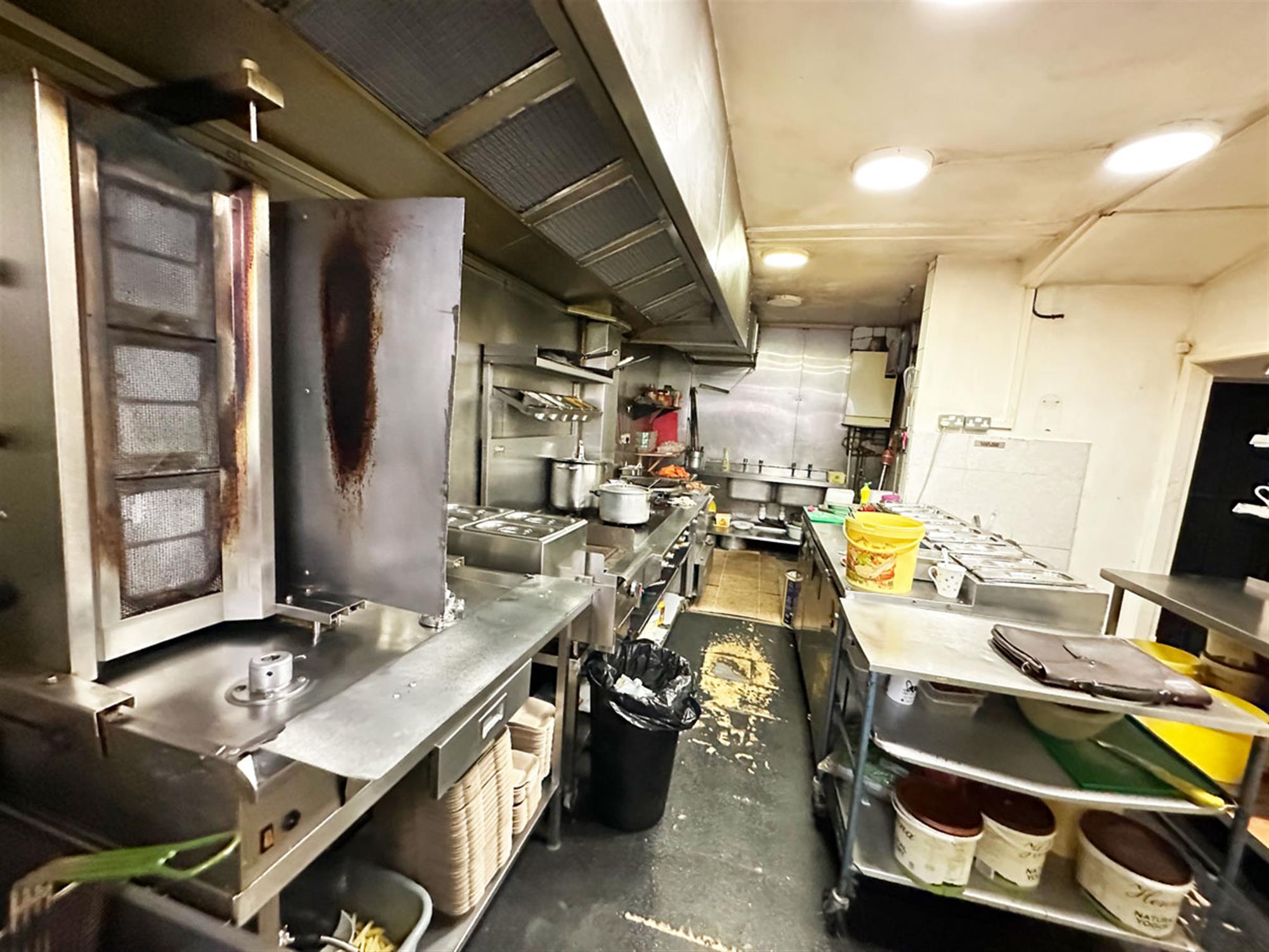 Electric shuttered front, ordering/waiting area, service counter. Open plan kitchen providing pizza preparation area with conveyor pizza oven, kebab area, hot plate, 8 burner stove, tandoori oven, central preparation island, washing up area, cold storage and exit to bin area.